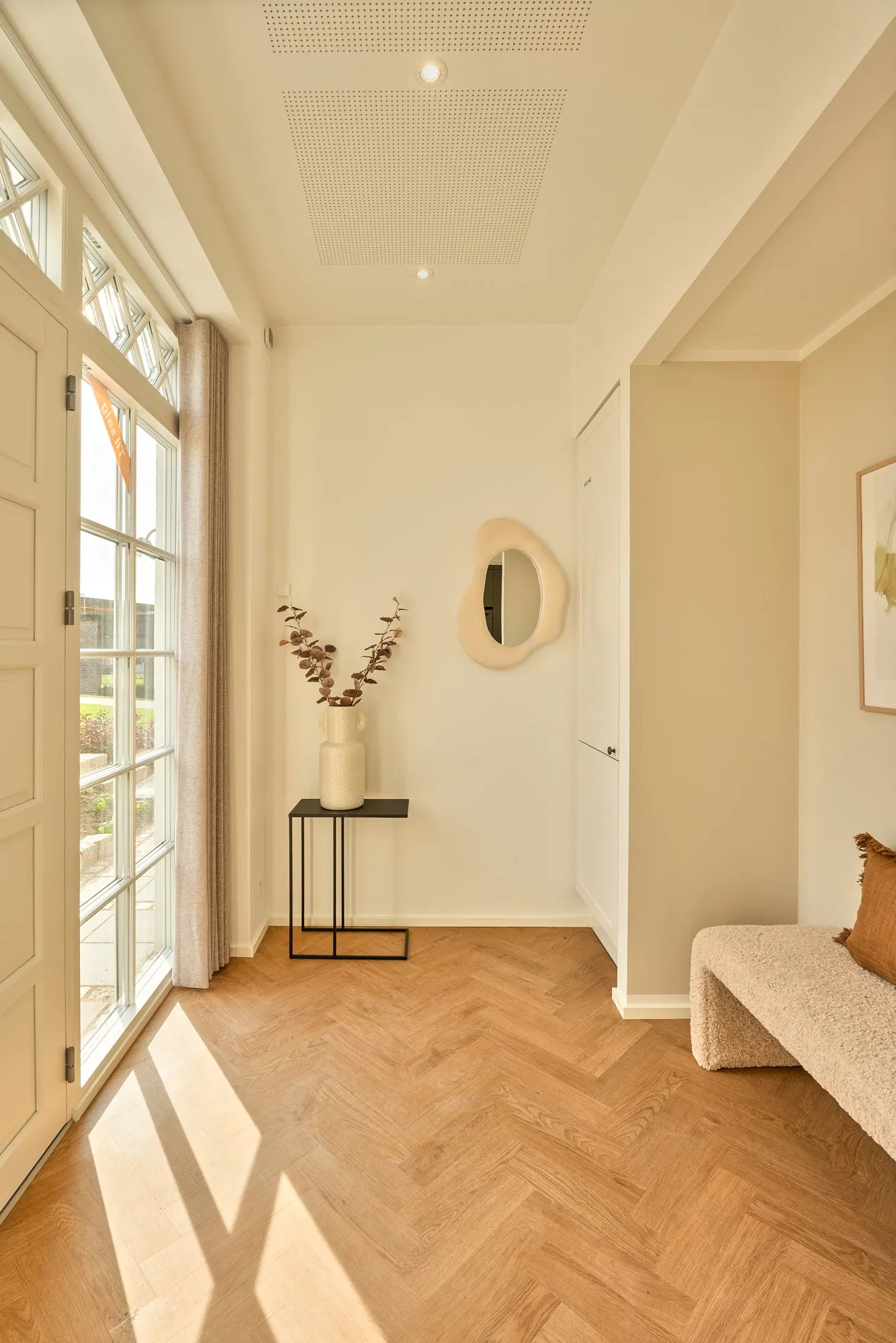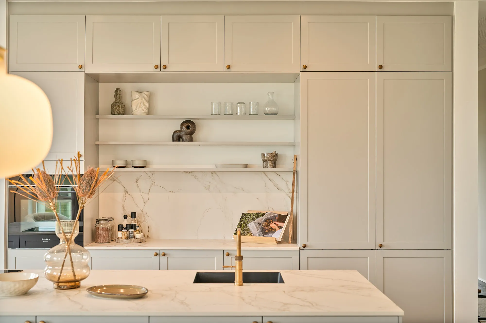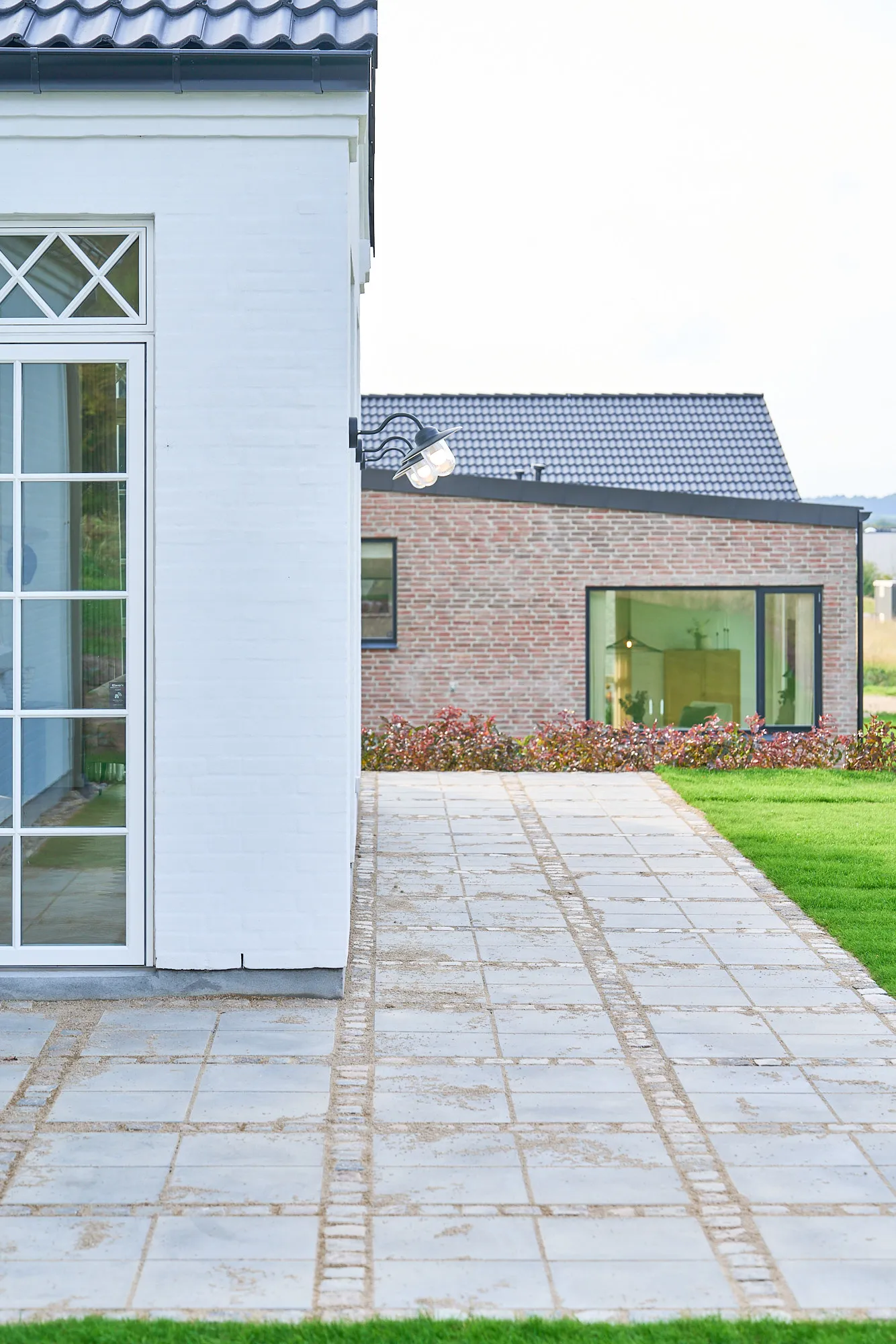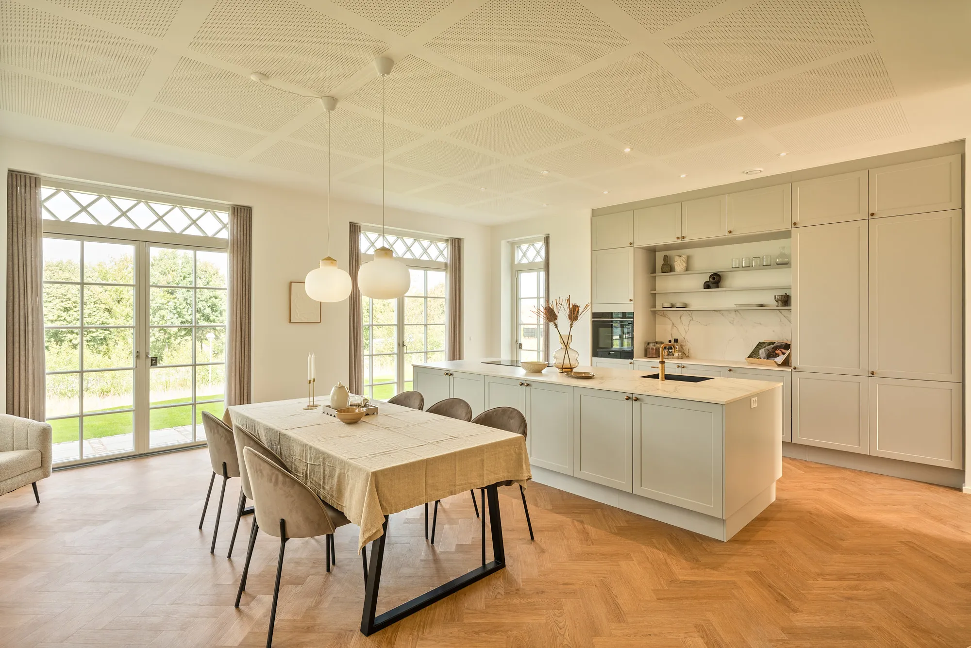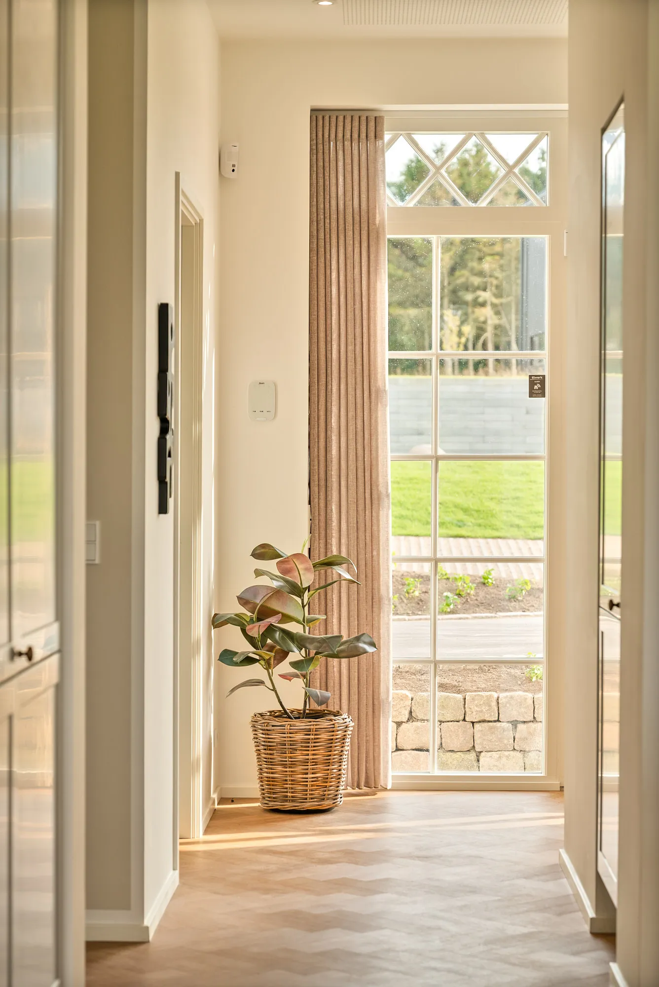 Klassisk palævilla, nyfortolket med moderne løsninger, gesims og vandskuret facade, bruneret messing i køkkenet, sprossevinduer og krydssprosser, øget loftshøjde på 2,82 meter, sildebensgulve, indbygget hjørnereol med fyldninger, skjult depot og skjult garderobe