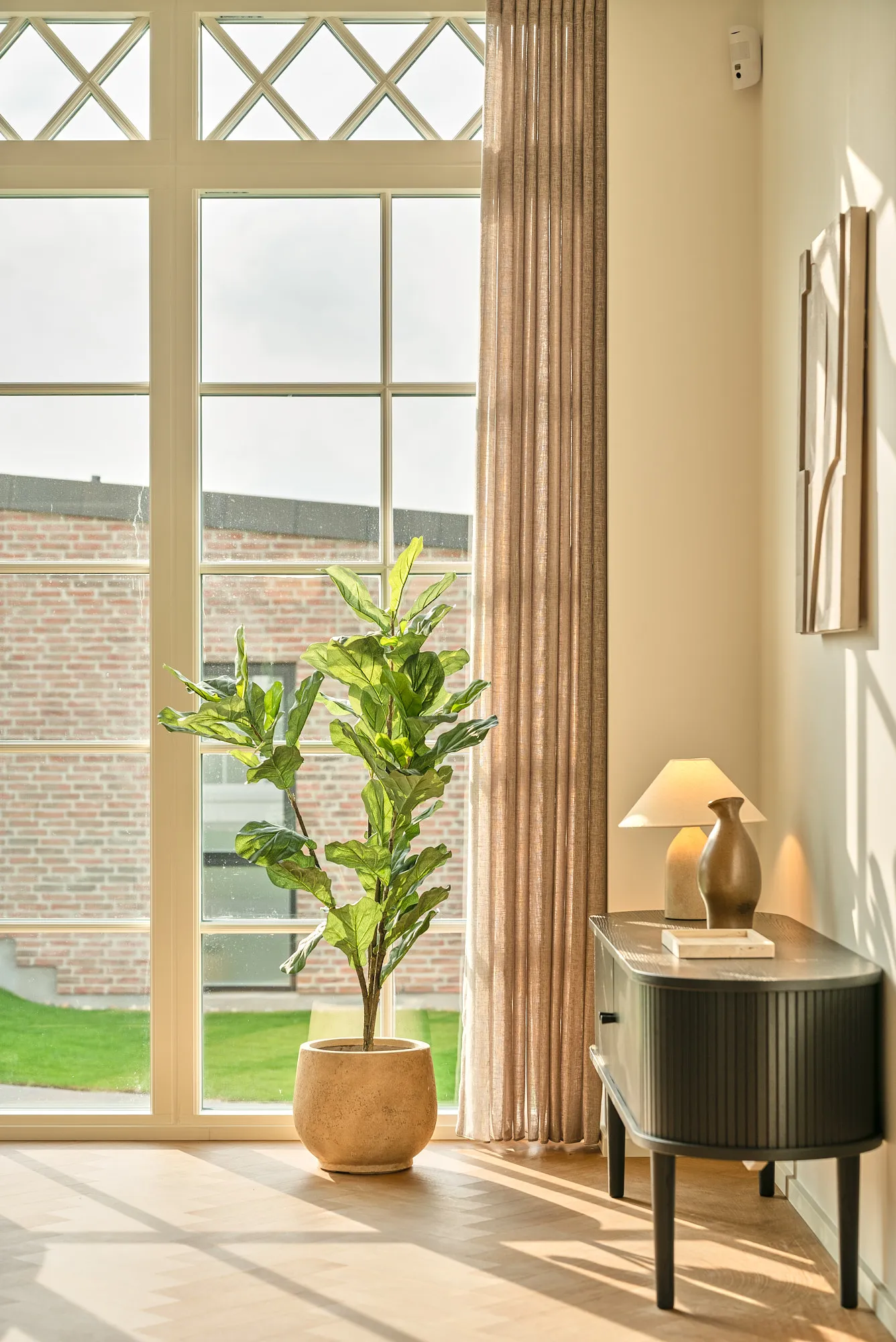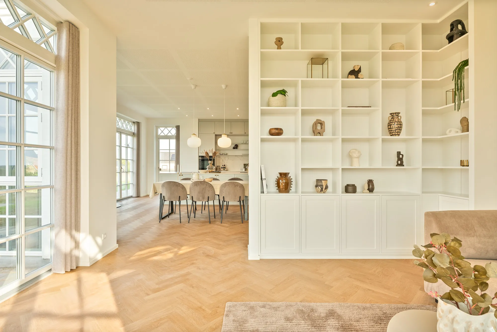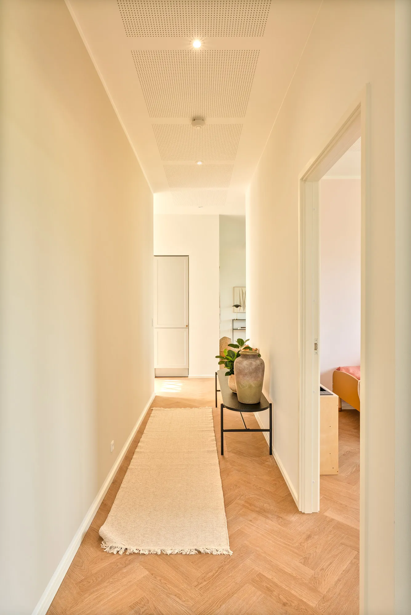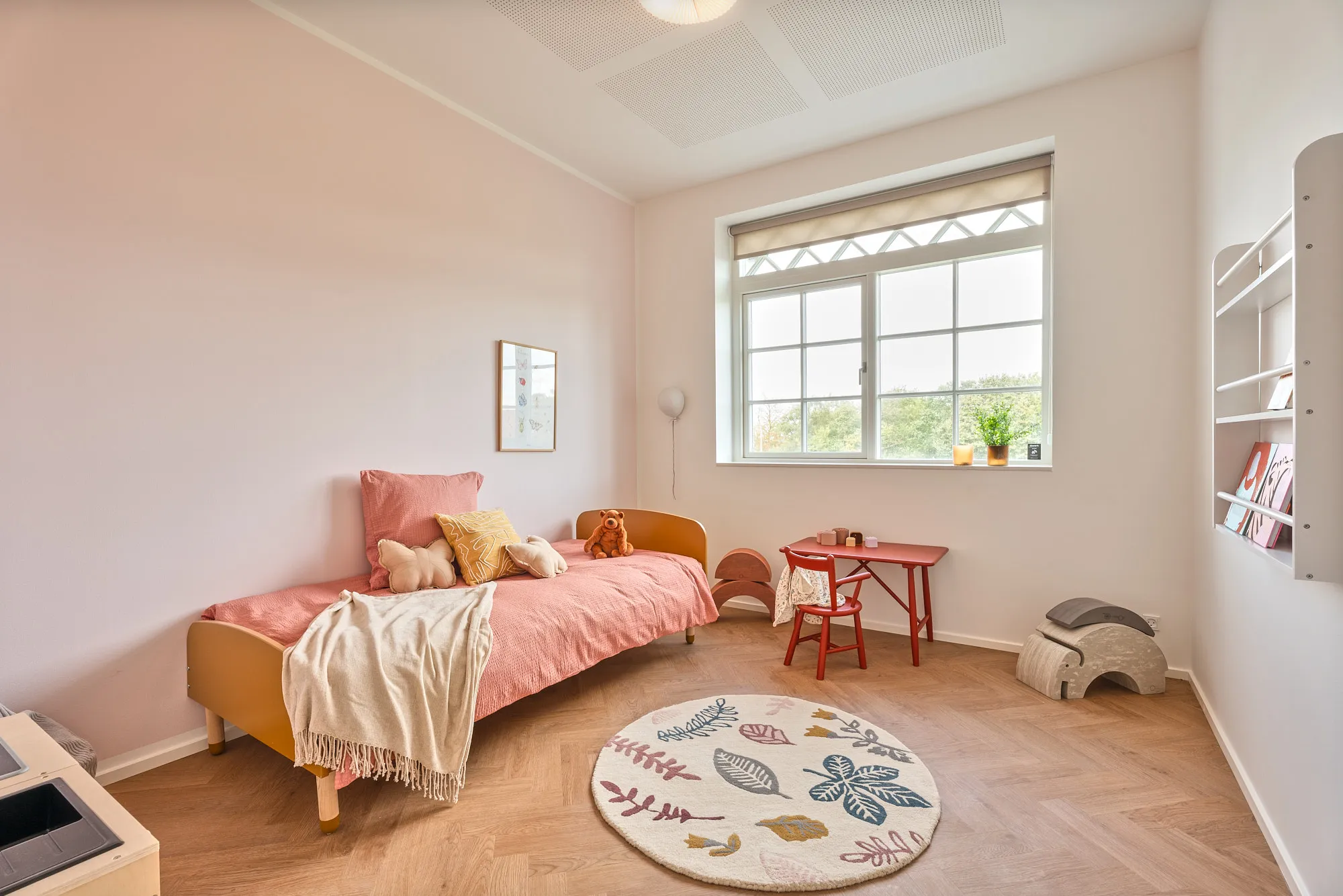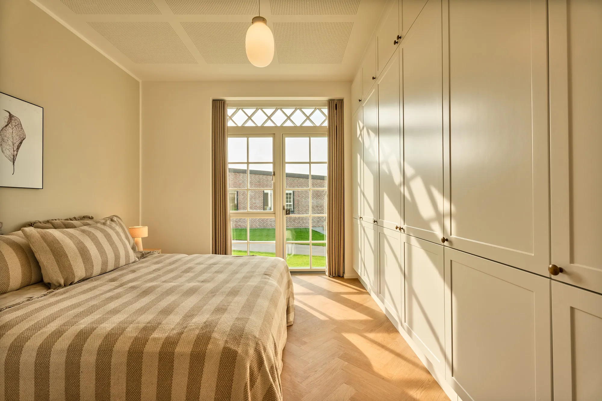 Klassisk palævilla, nyfortolket med moderne løsninger, gesims og vandskuret facade, bruneret messing i køkkenet, sprossevinduer og krydssprosser, øget loftshøjde på 2,82 meter, sildebensgulve, indbygget hjørnereol med fyldninger, skjult depot og skjult garderobe
