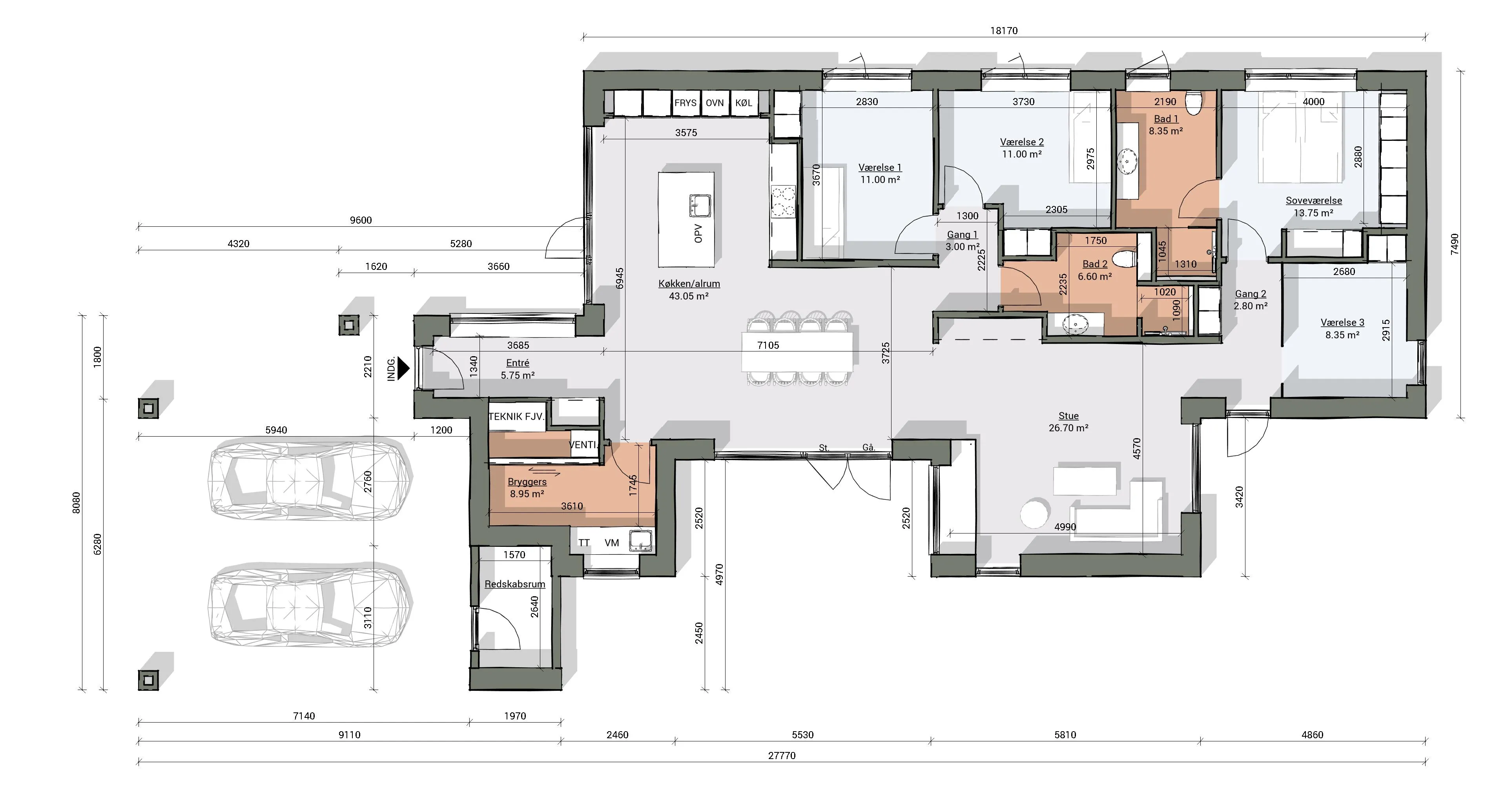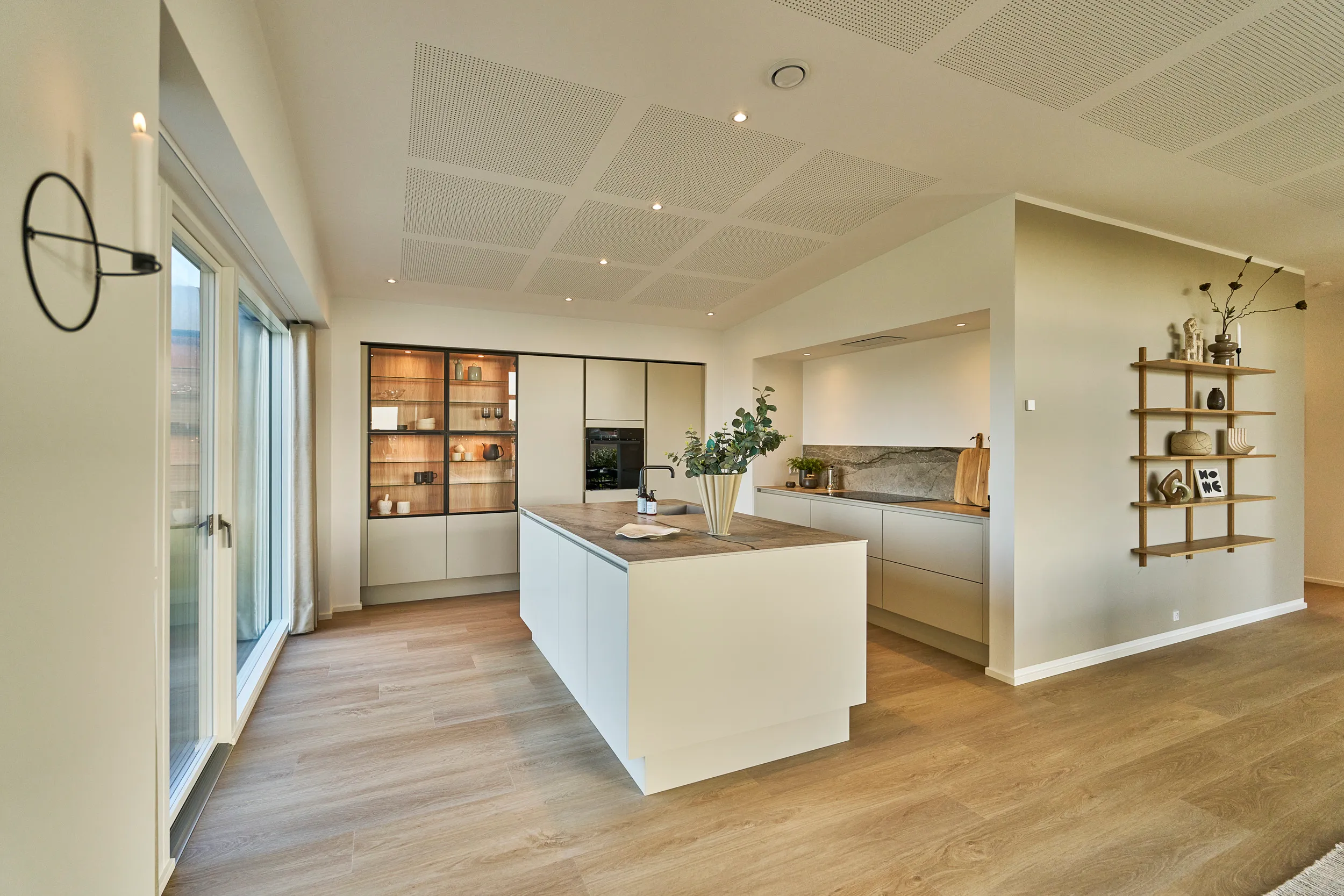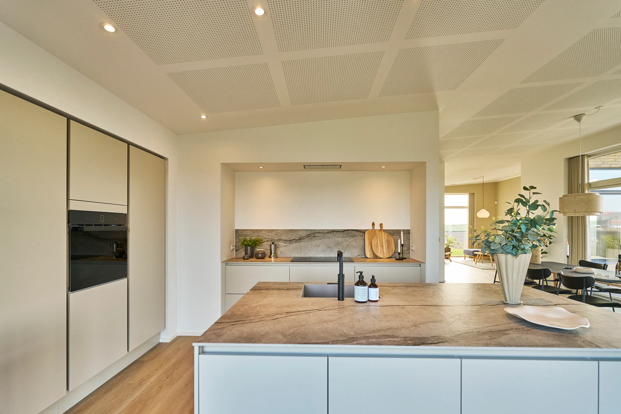 Arkitekttegnet funkishus med jordvarme, gennemført planløsning, køkken/alrum med vinrum, reces, Luksus på badeværelserne, overdækket terrasse på 46 m²