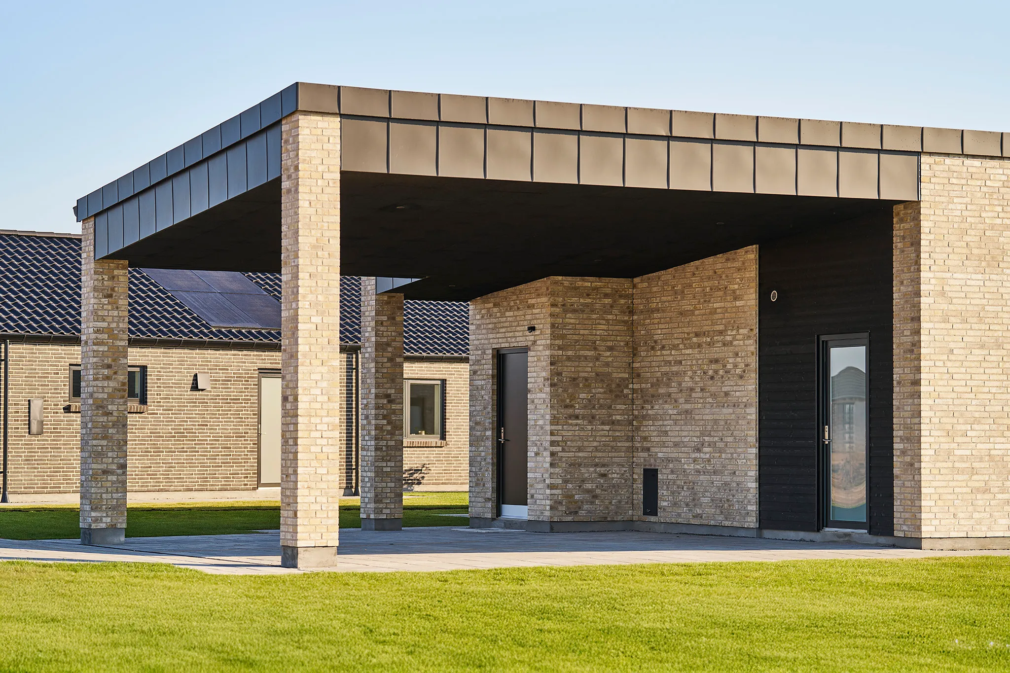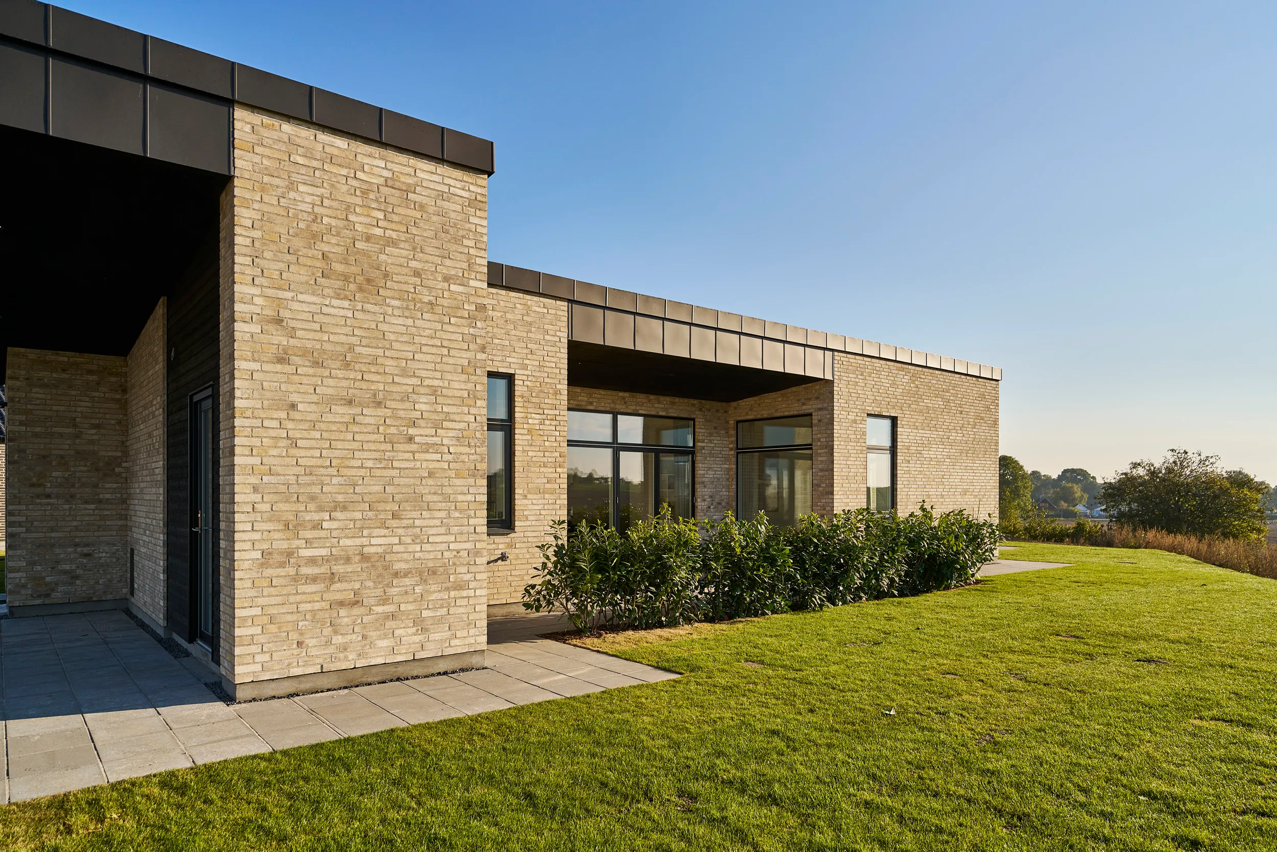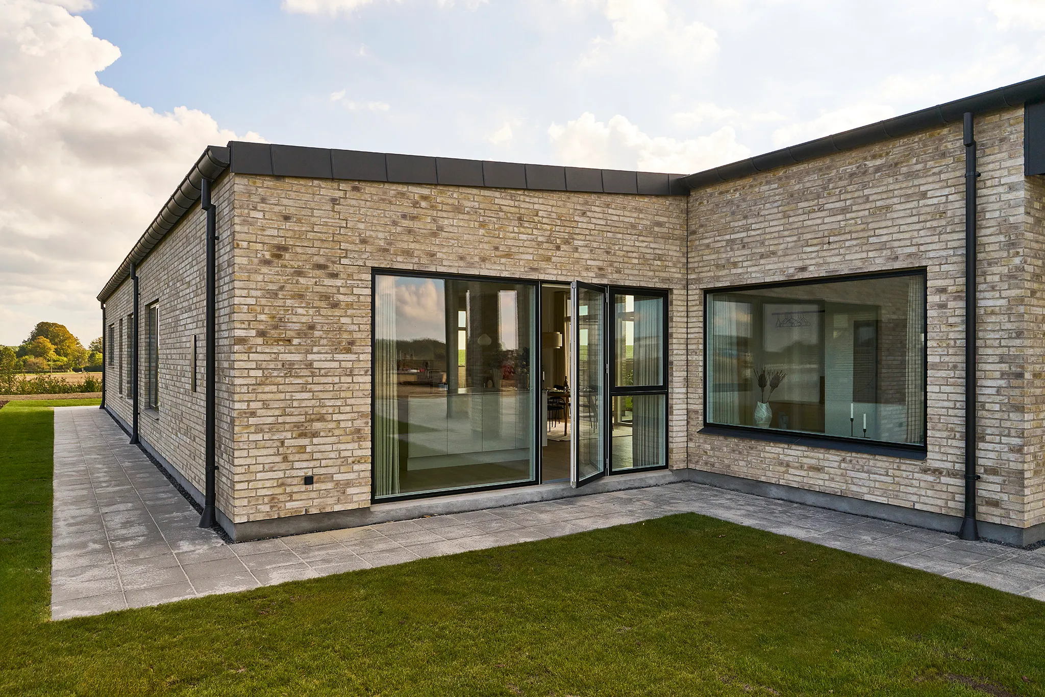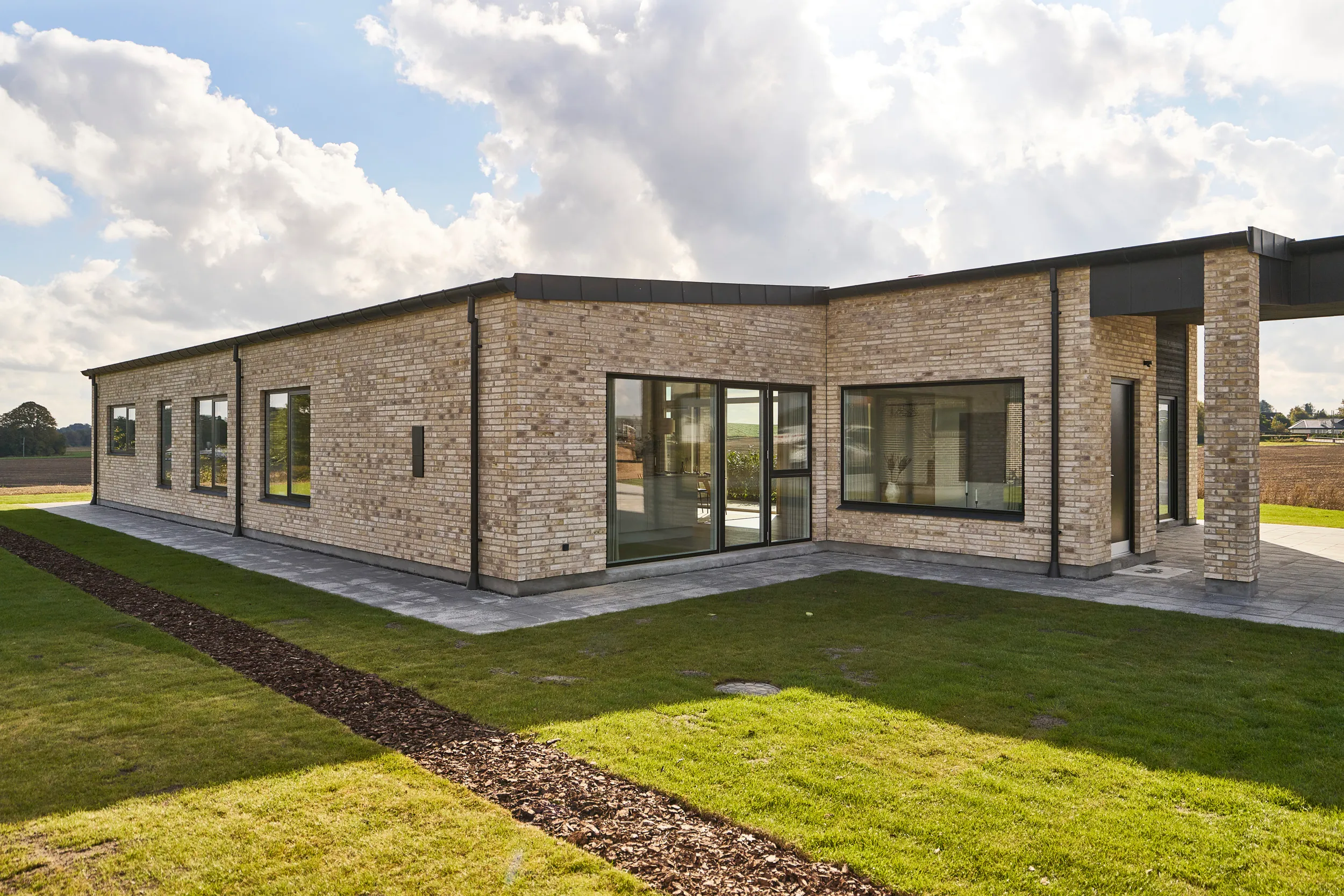 Ensidig tagkonstruktion med mere bolig og mindre gang, indbygget reol i stuen, teknikrum med tørreplads, new Yorker-væg til kontor & store vinduespartier