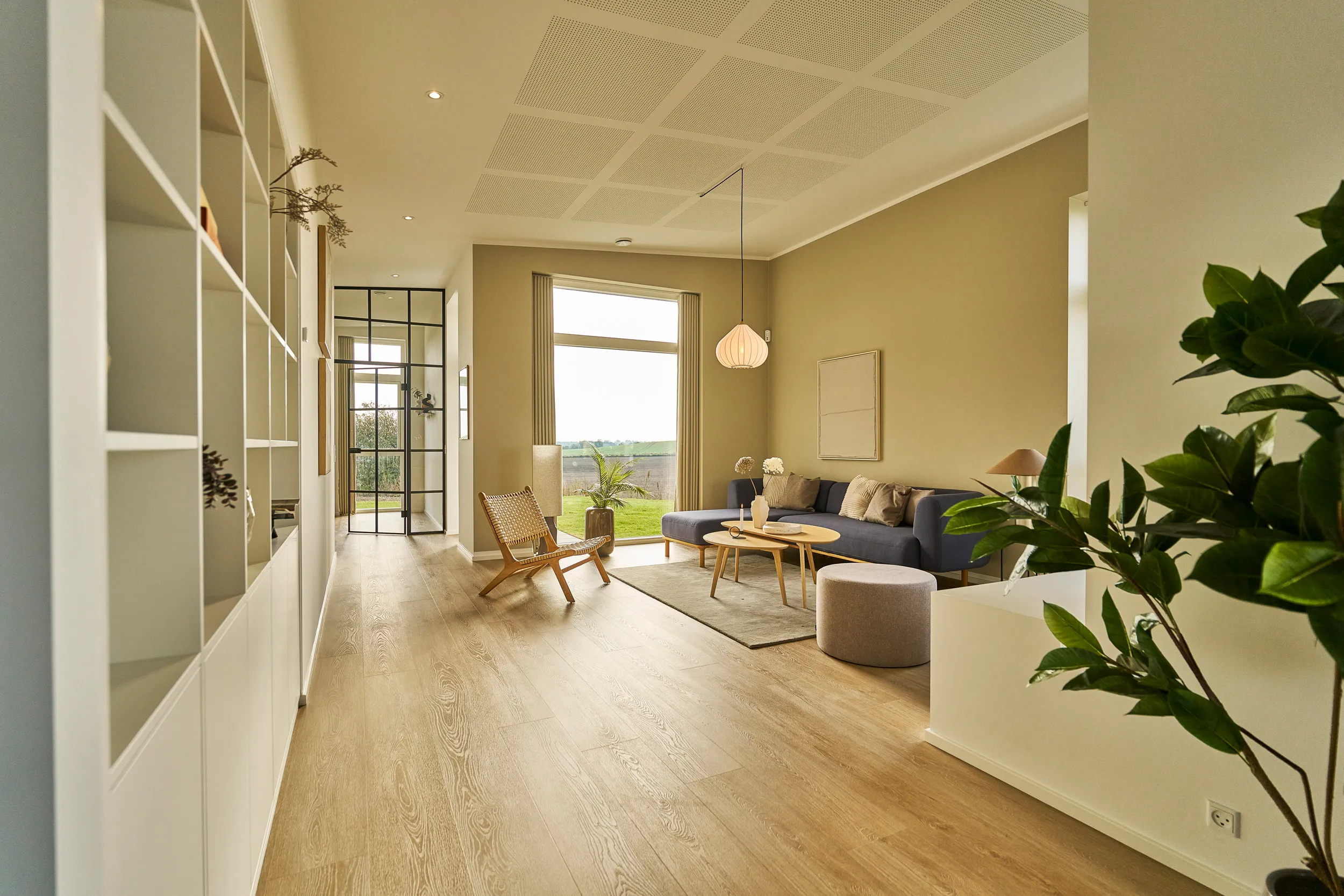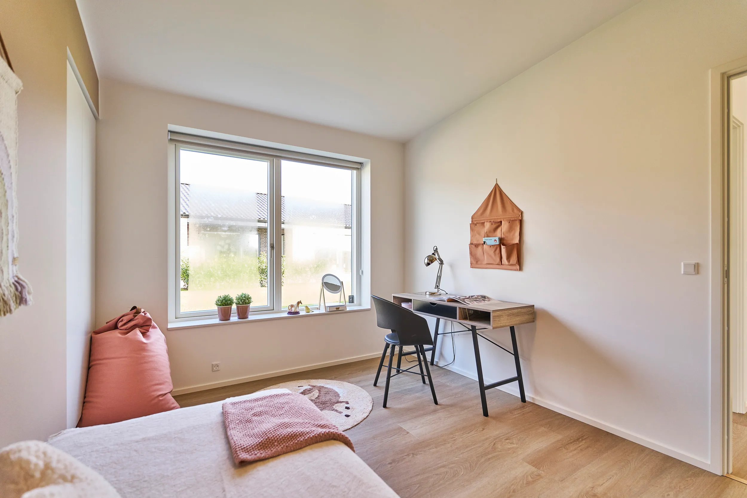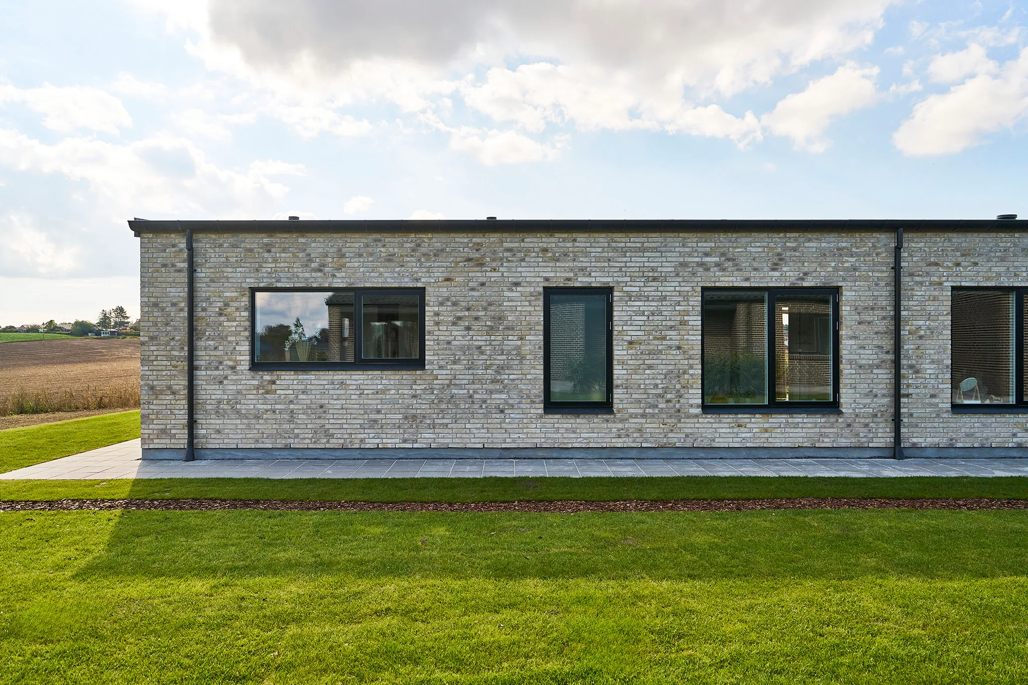 Ensidig tagkonstruktion med mere bolig og mindre gang, indbygget reol i stuen, teknikrum med tørreplads, new Yorker-væg til kontor & store vinduespartier