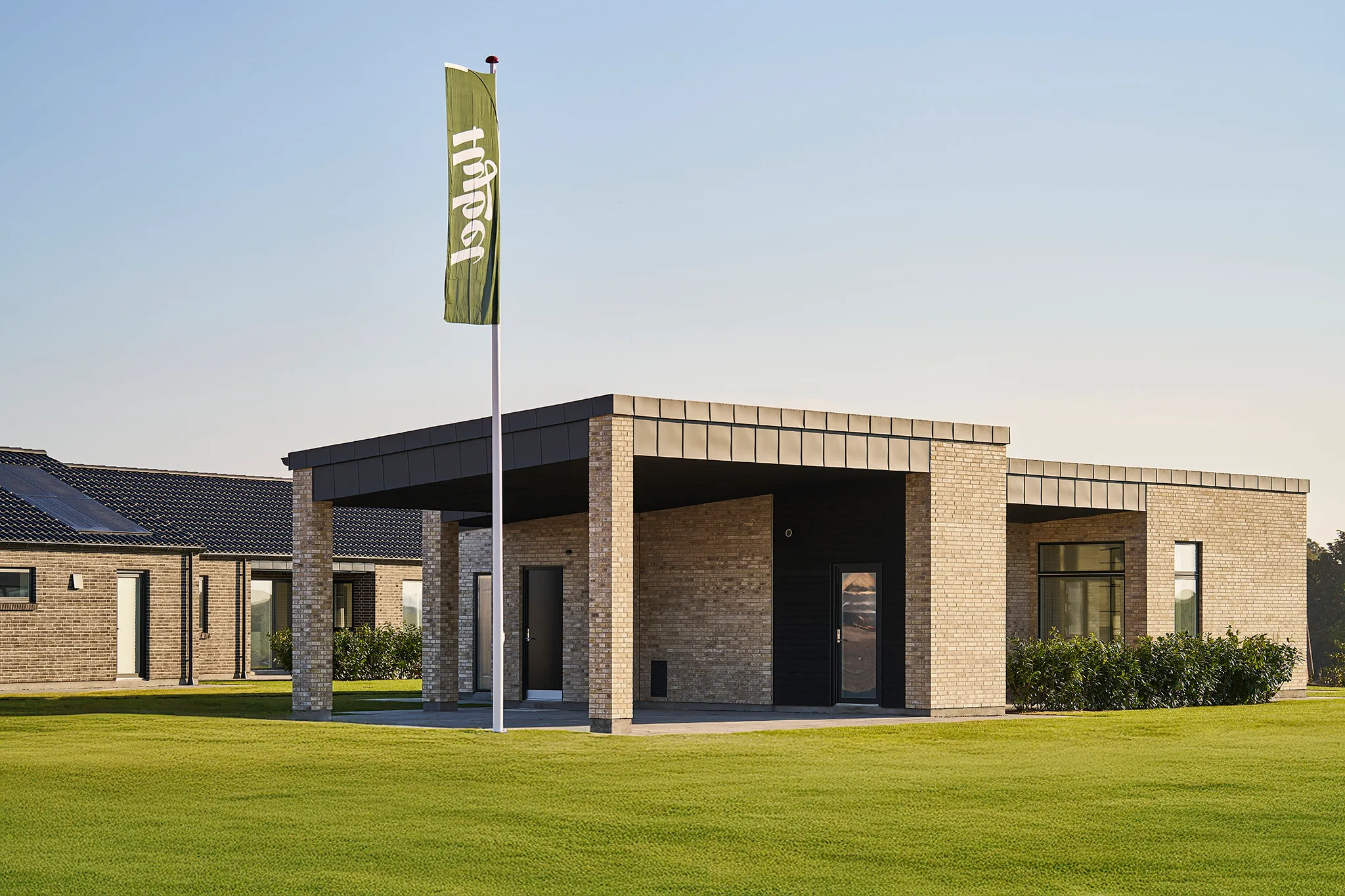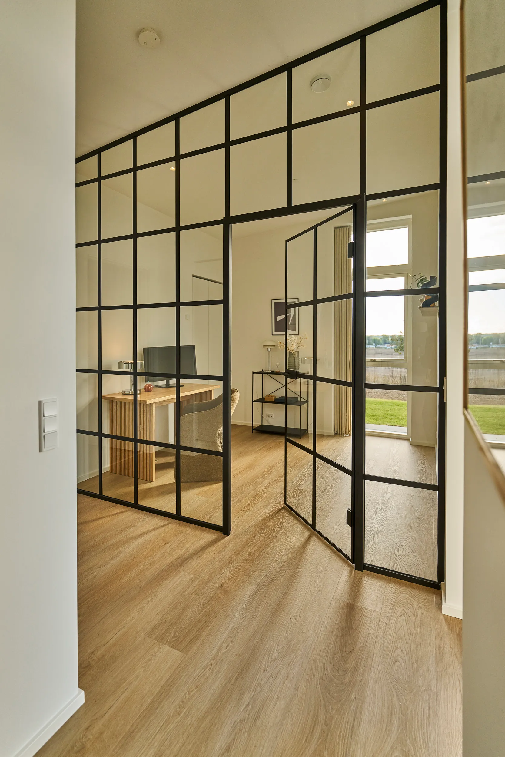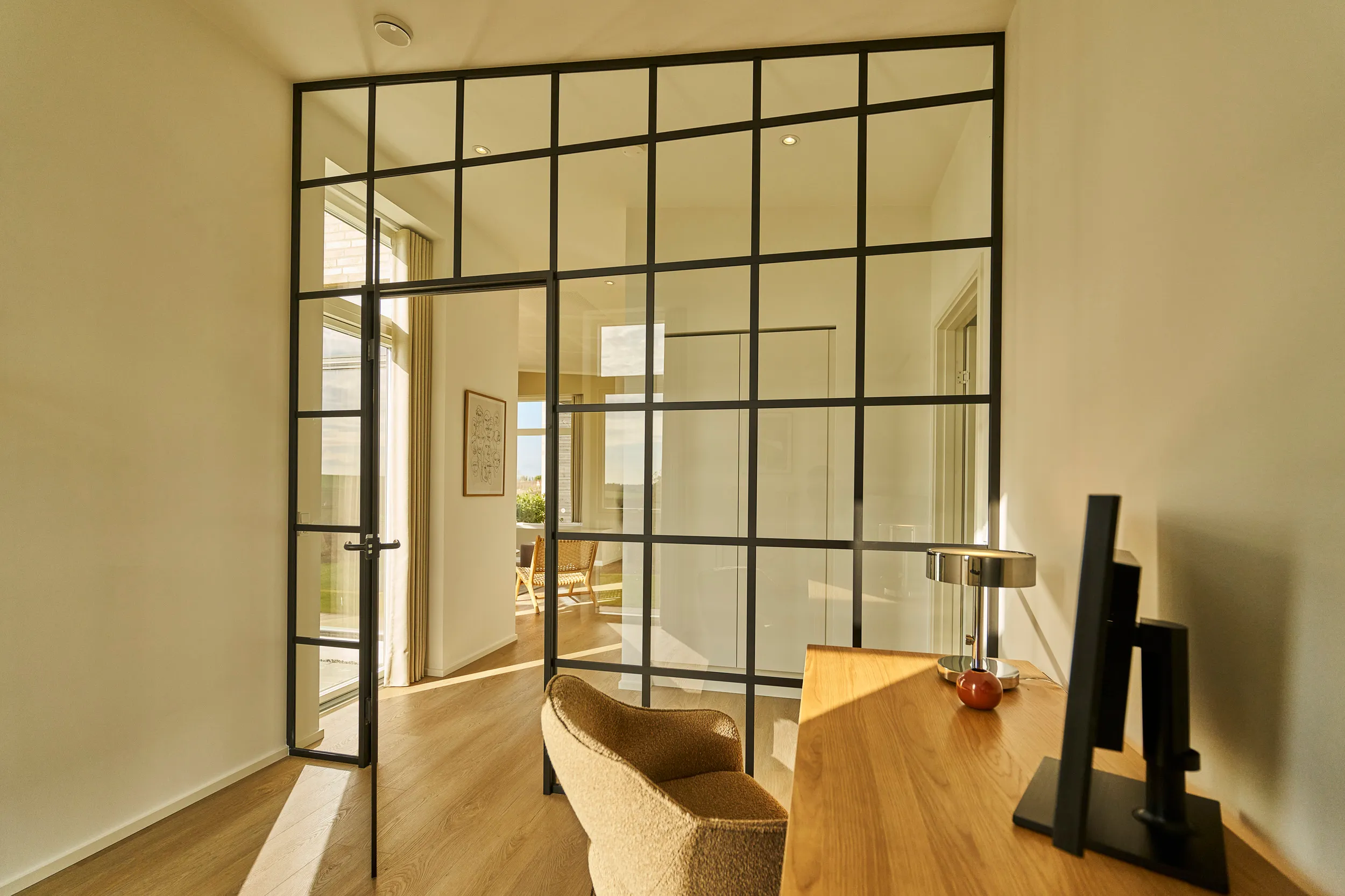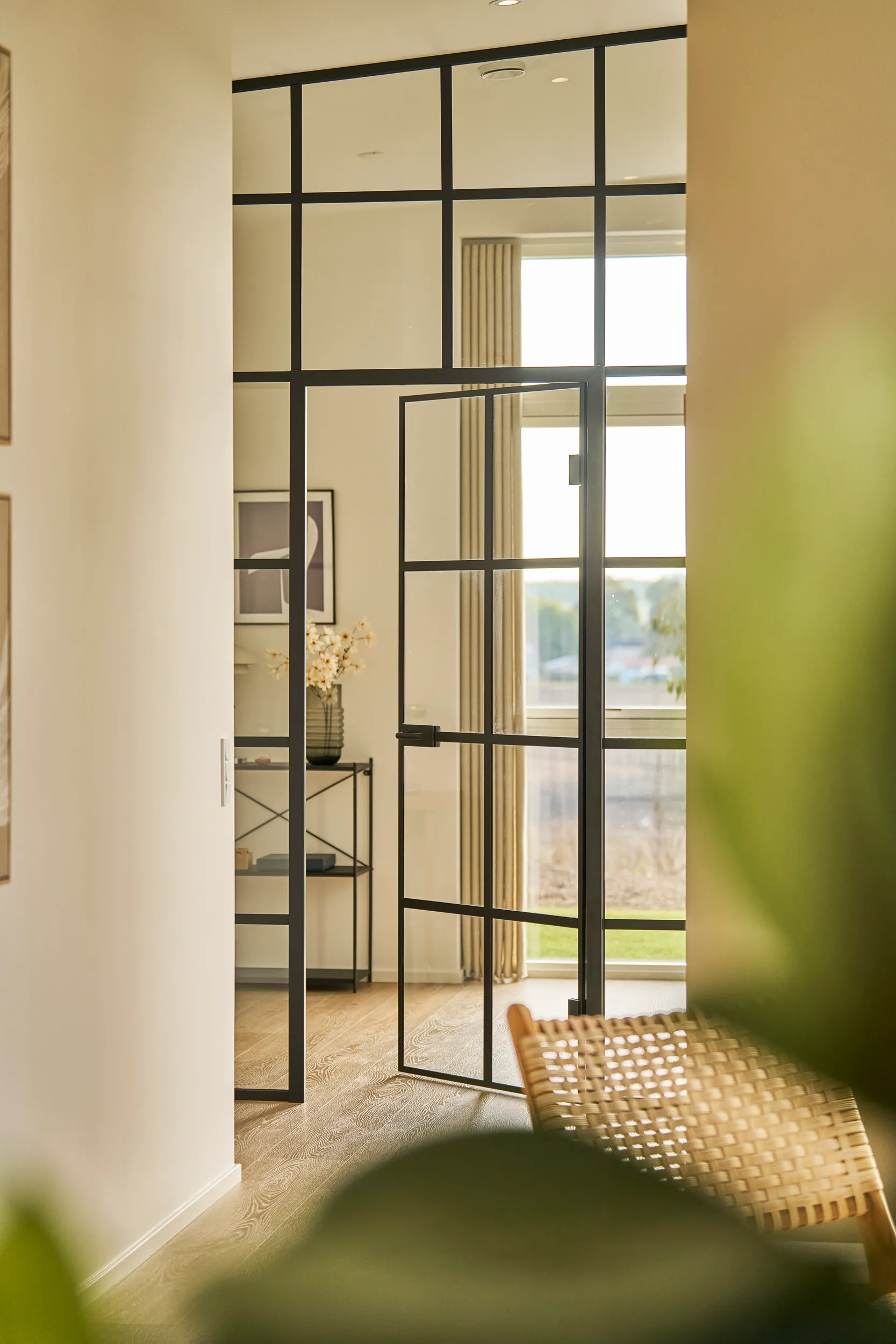 Ensidig tagkonstruktion med mere bolig og mindre gang, indbygget reol i stuen, teknikrum med tørreplads, new Yorker-væg til kontor & store vinduespartier