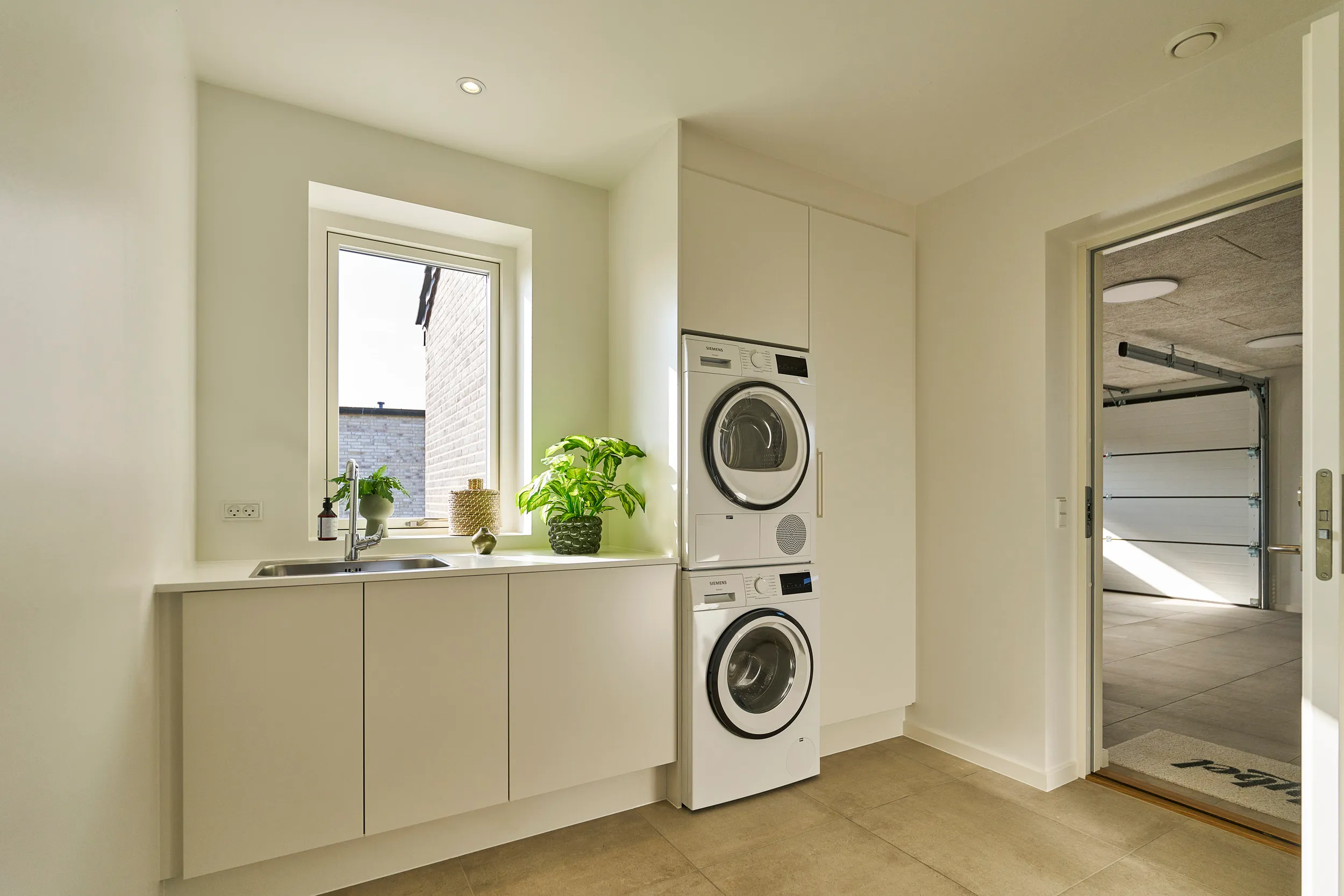 Arkitekttegnet funkishus med jordvarme, gennemført planløsning, køkken/alrum med vinrum, reces, Luksus på badeværelserne, overdækket terrasse på 46 m²
