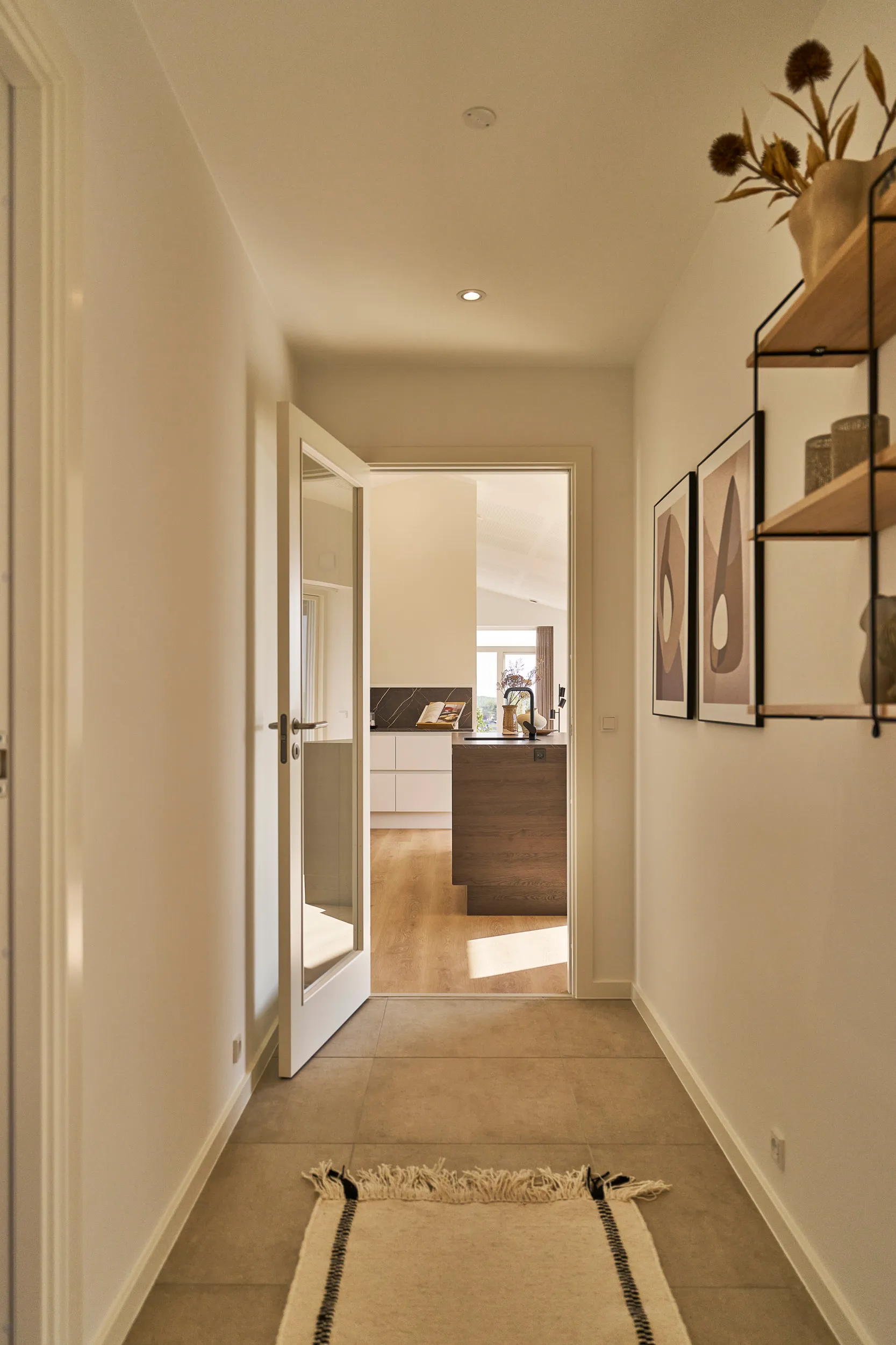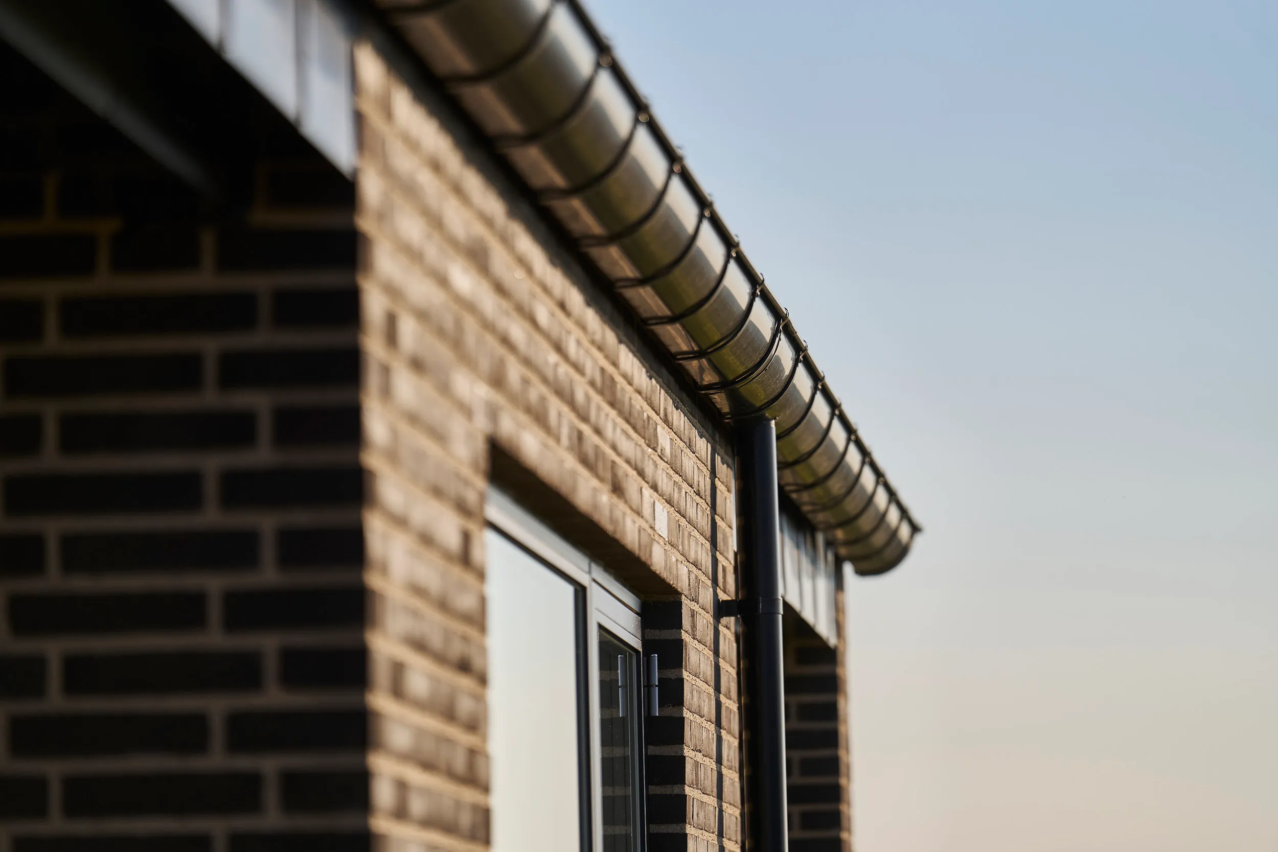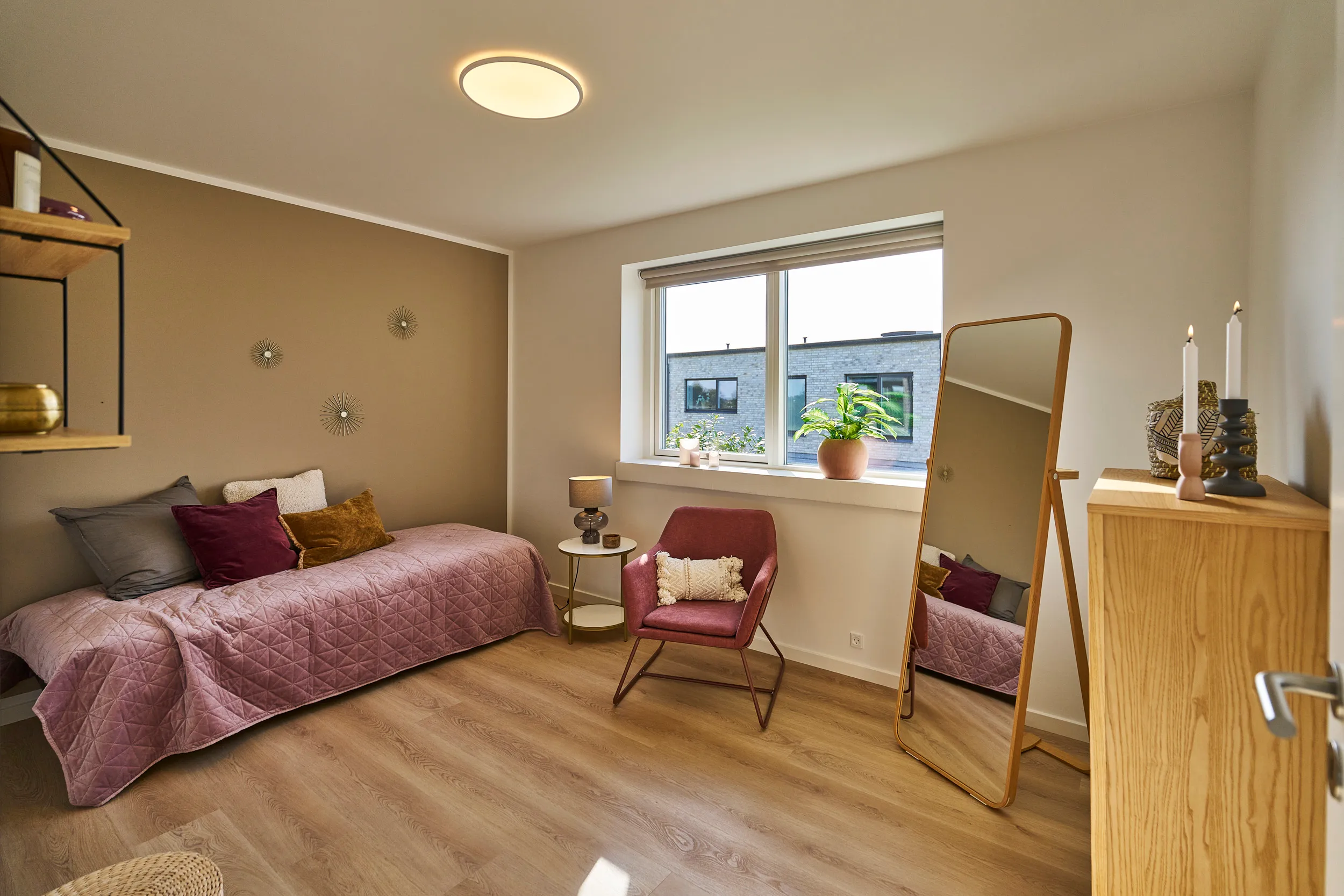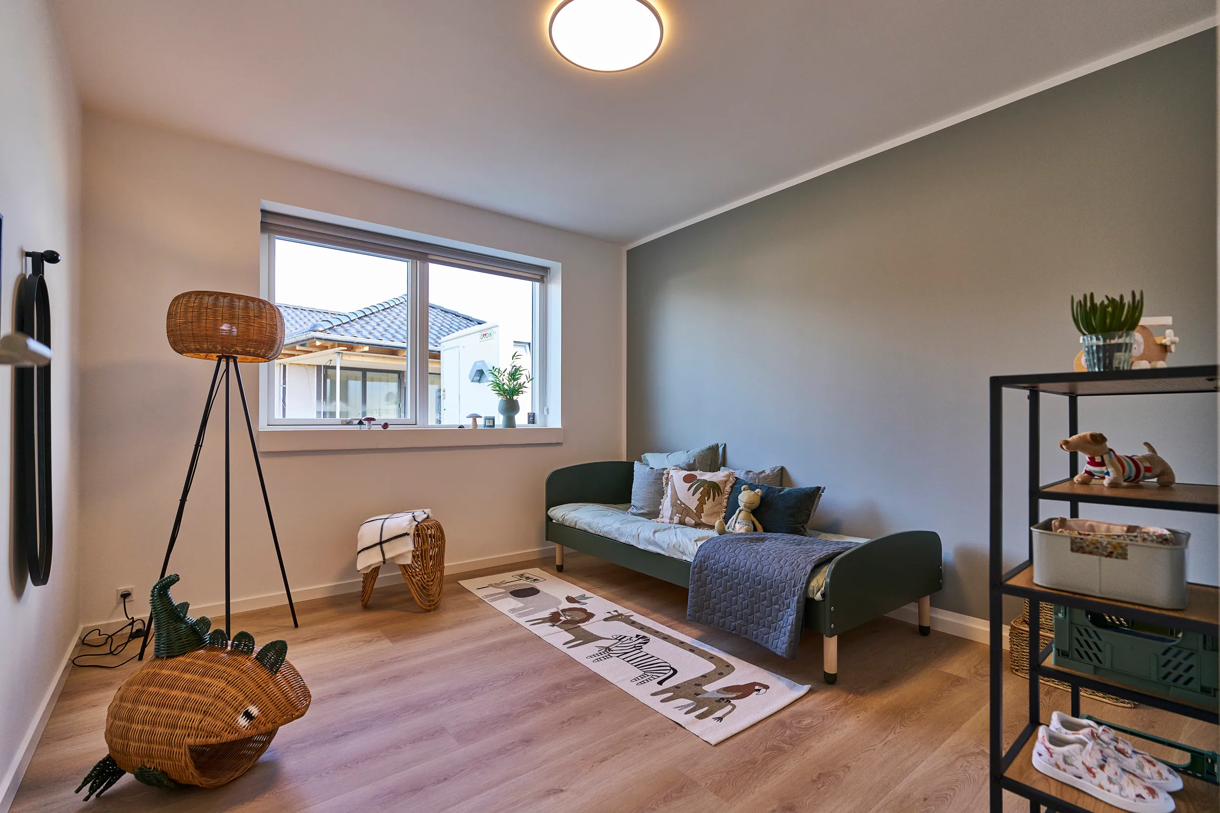 Ensidig tagkonstruktion med mere bolig og mindre gang, indbygget reol i stuen, teknikrum med tørreplads, new Yorker-væg til kontor & store vinduespartier