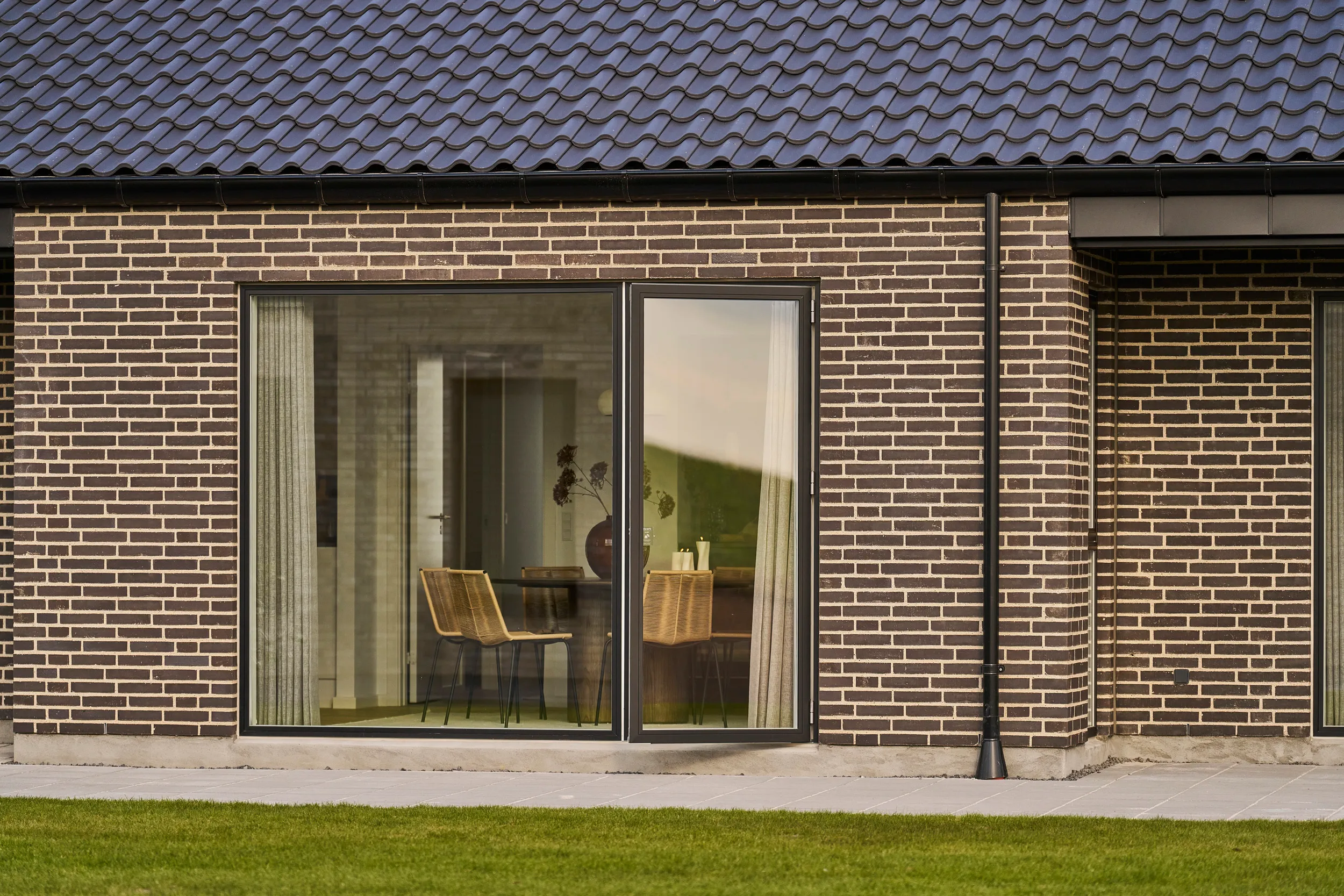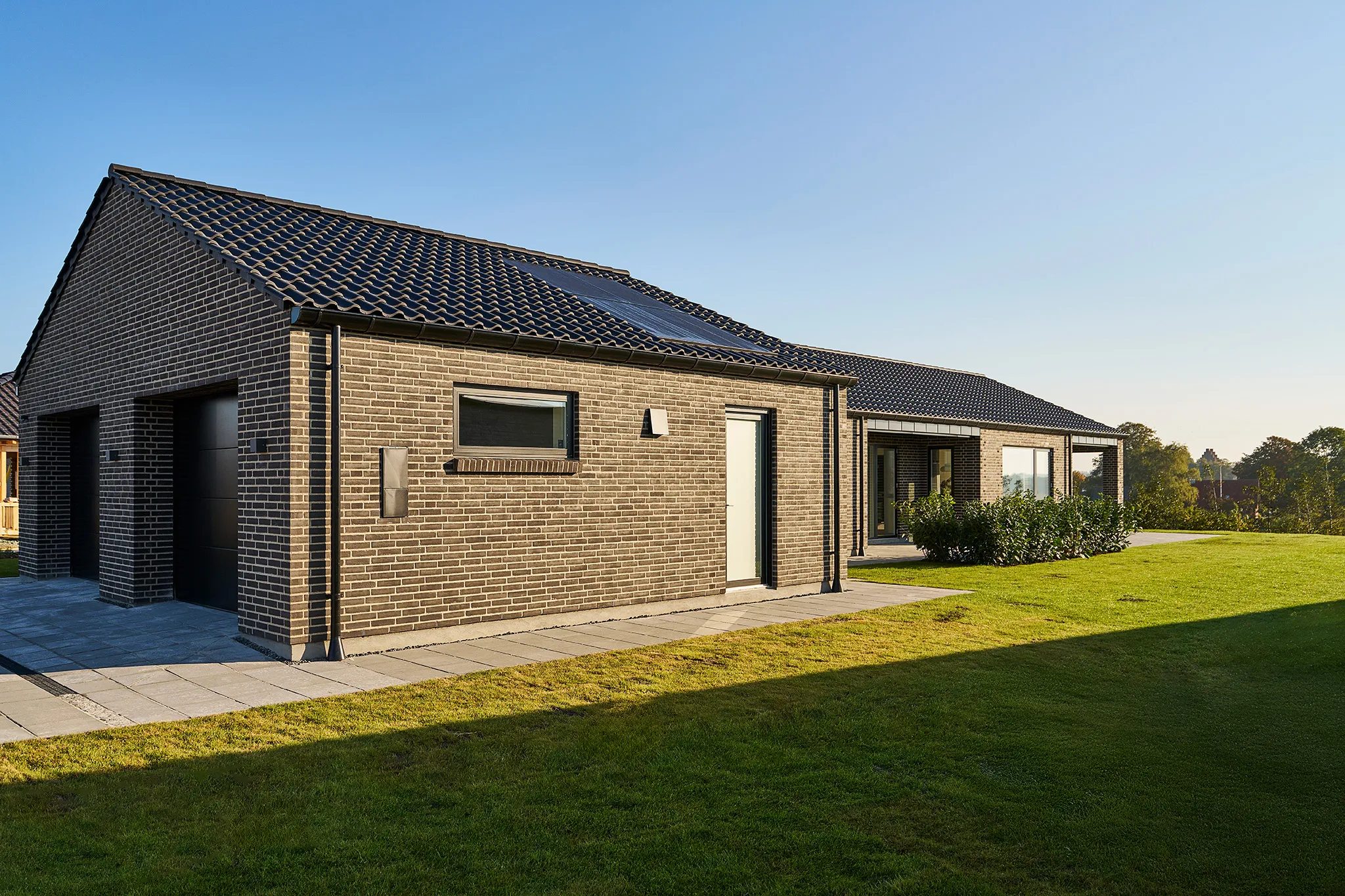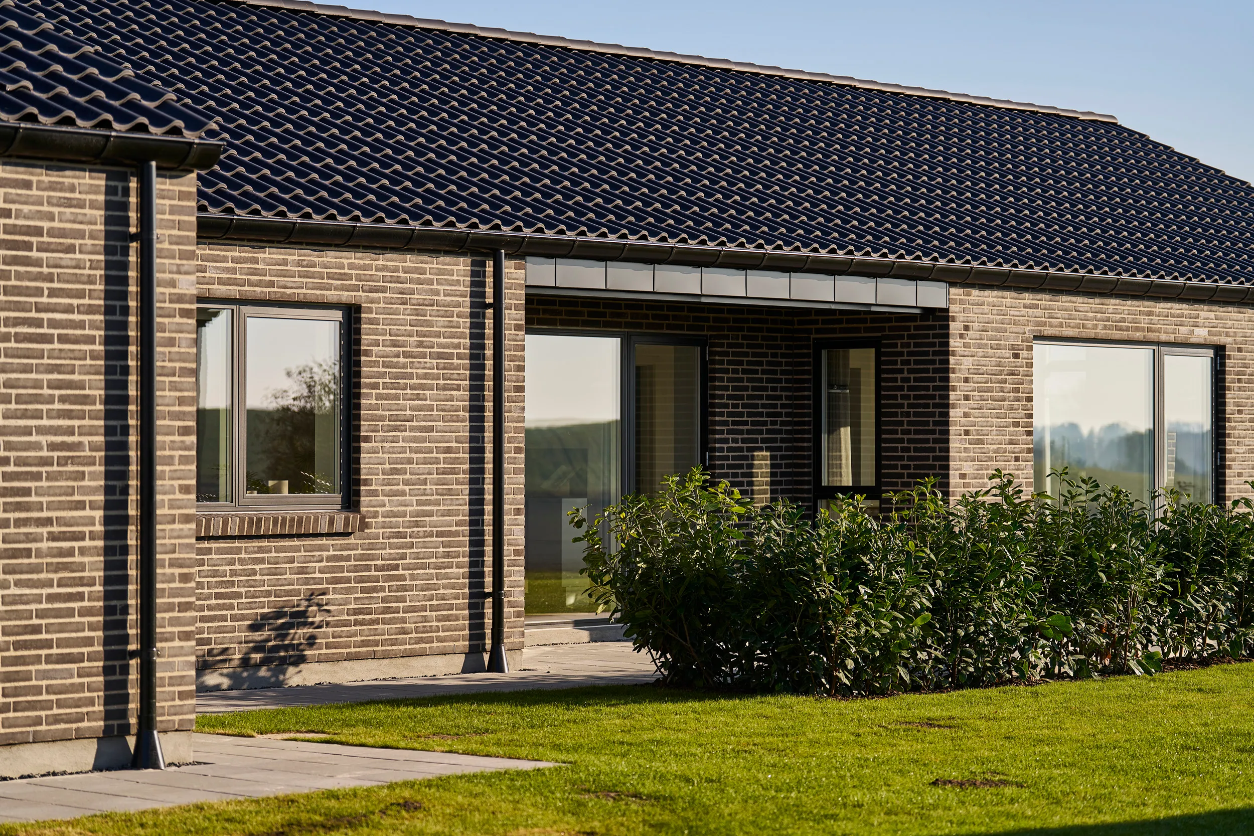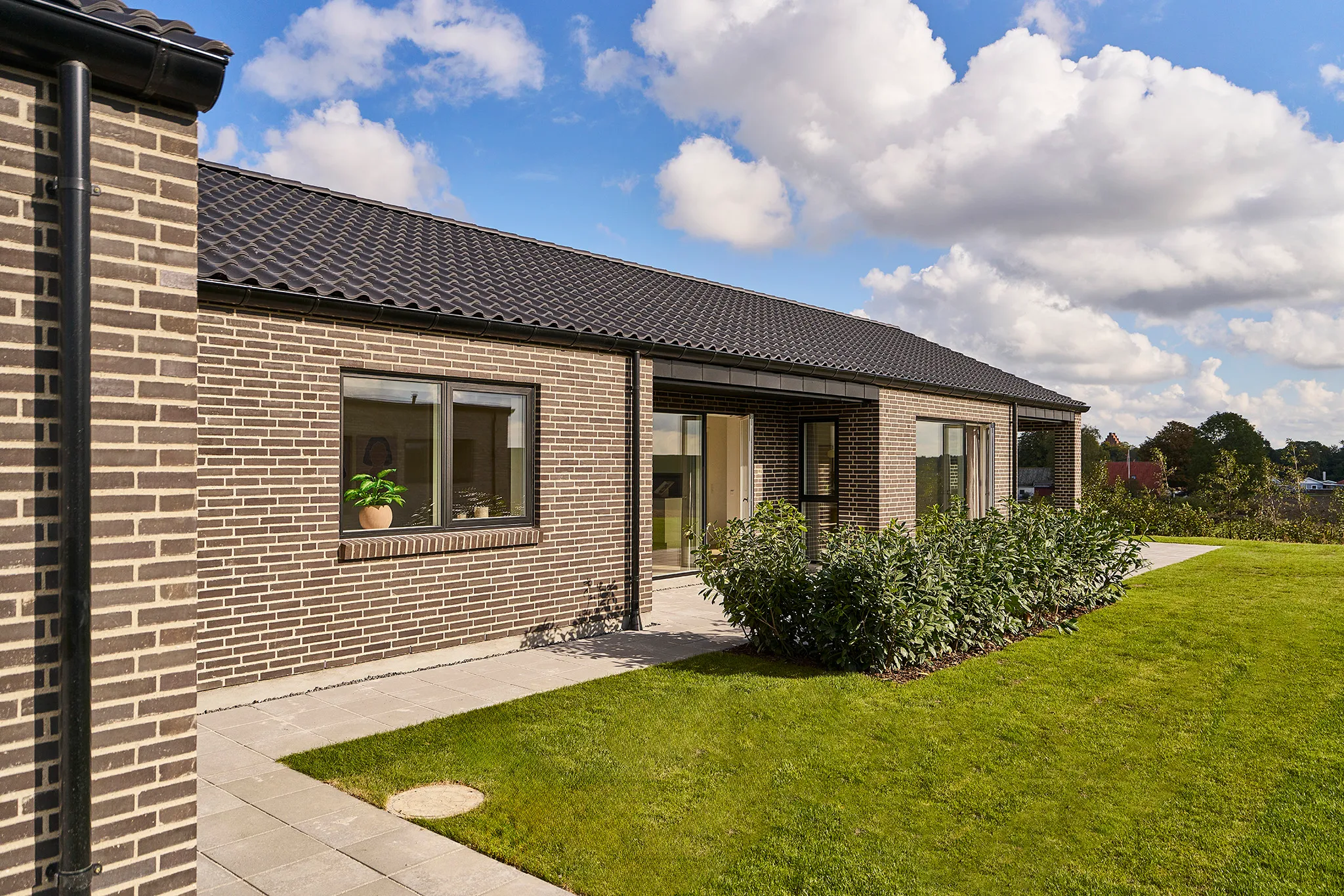 Længehus med solceller, teglsten, dobbelt garage, vinbar, skråloft og åbent køkken/alrum med store vinduespartier