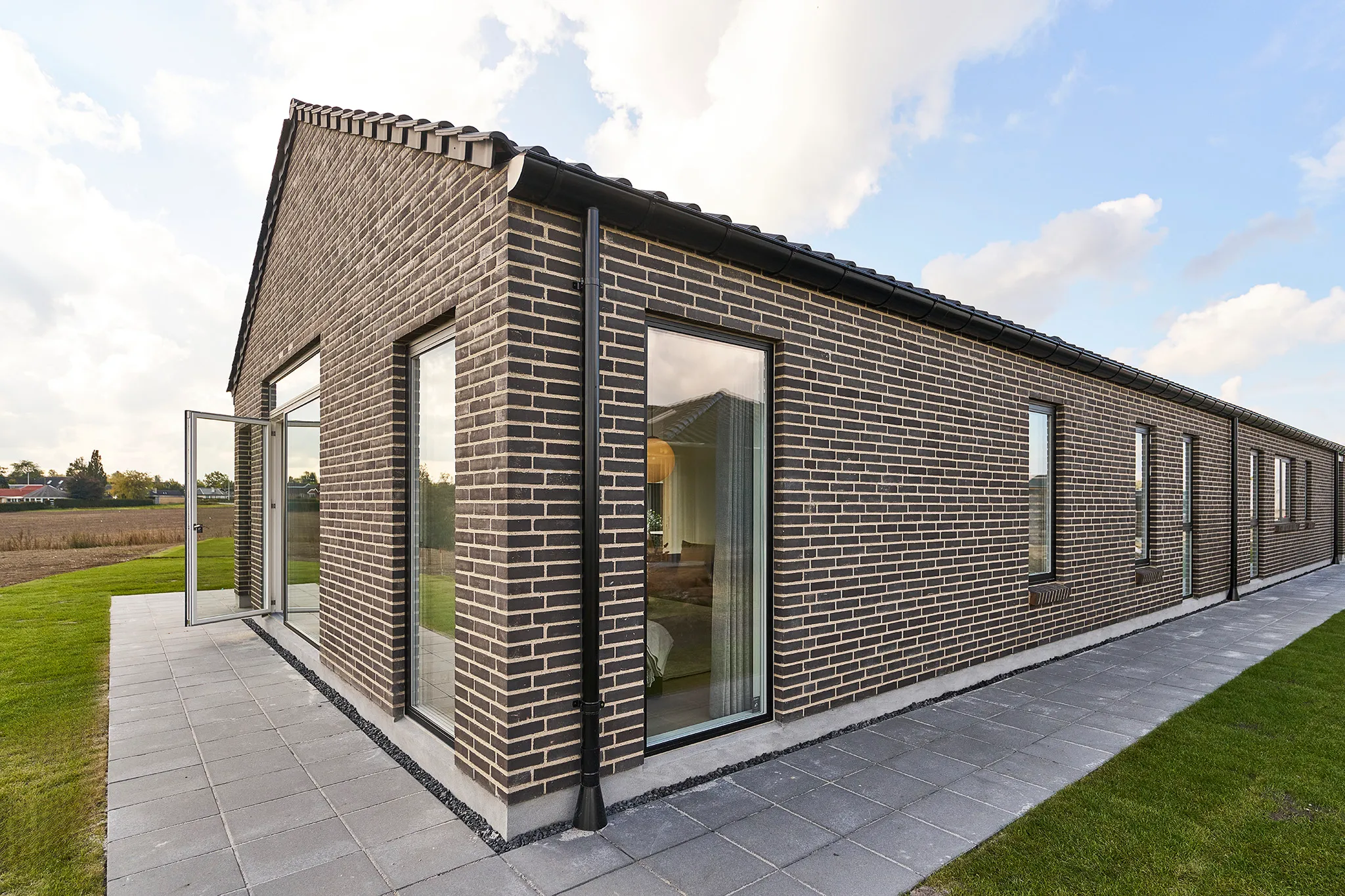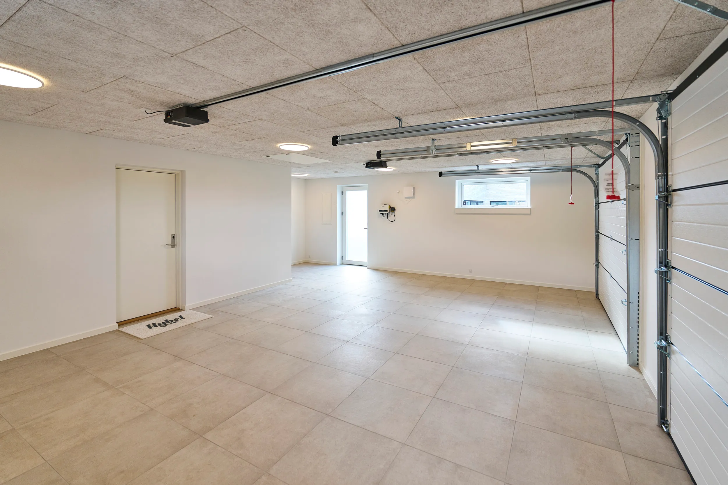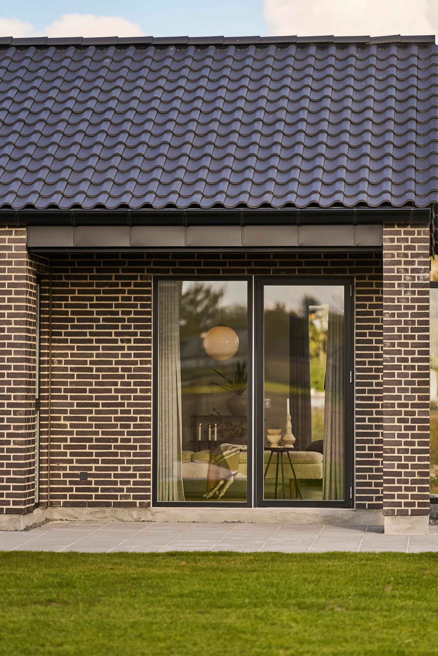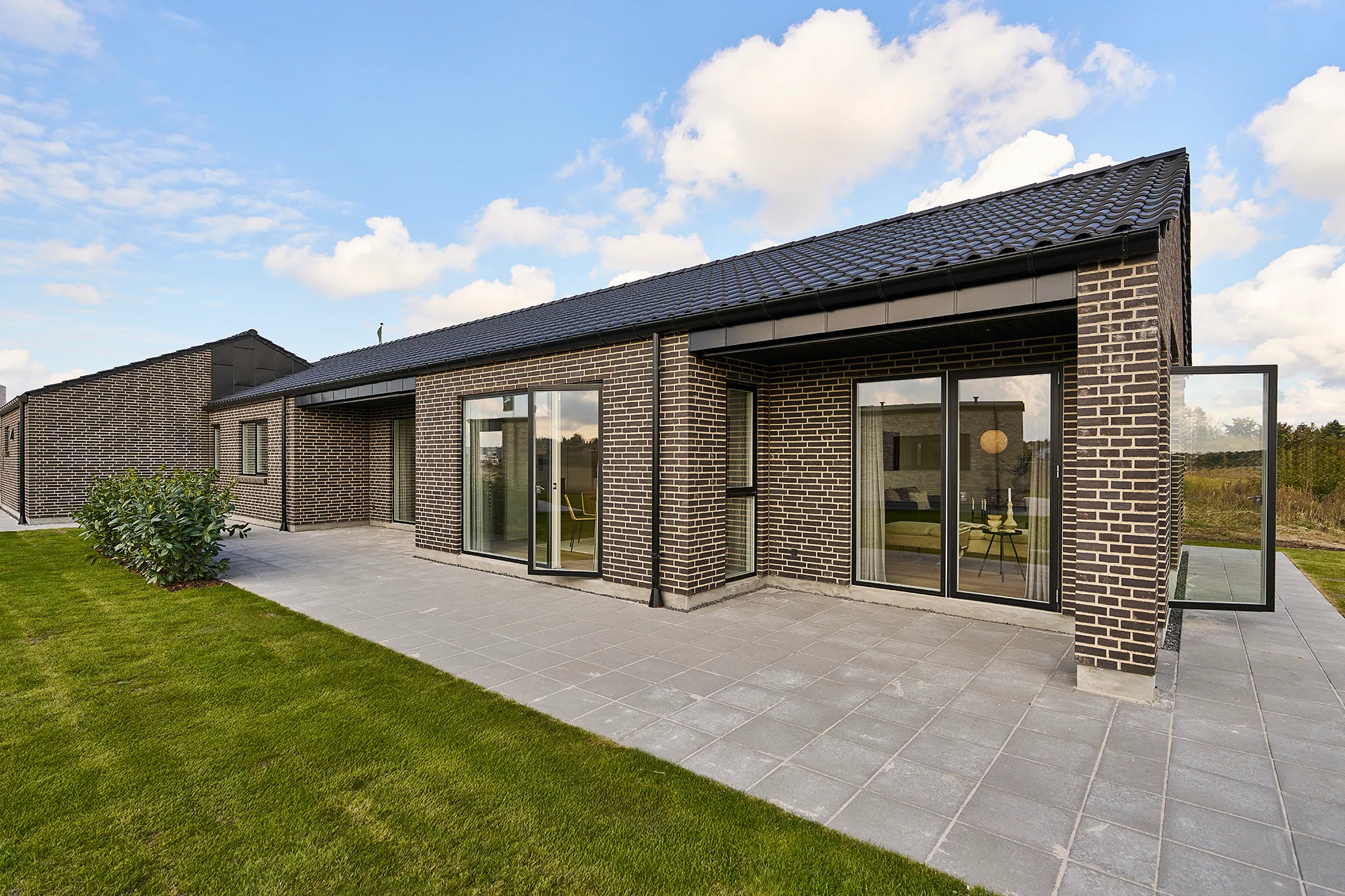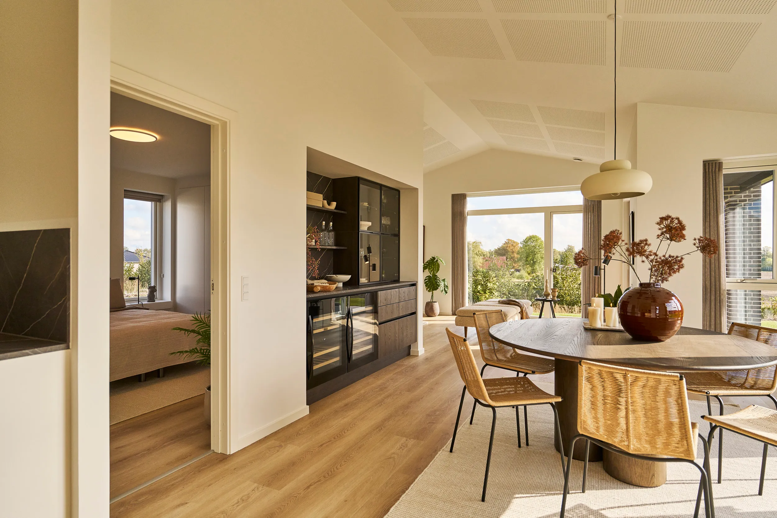 Længehus med solceller, teglsten, dobbelt garage, vinbar, skråloft og åbent køkken/alrum med store vinduespartier
