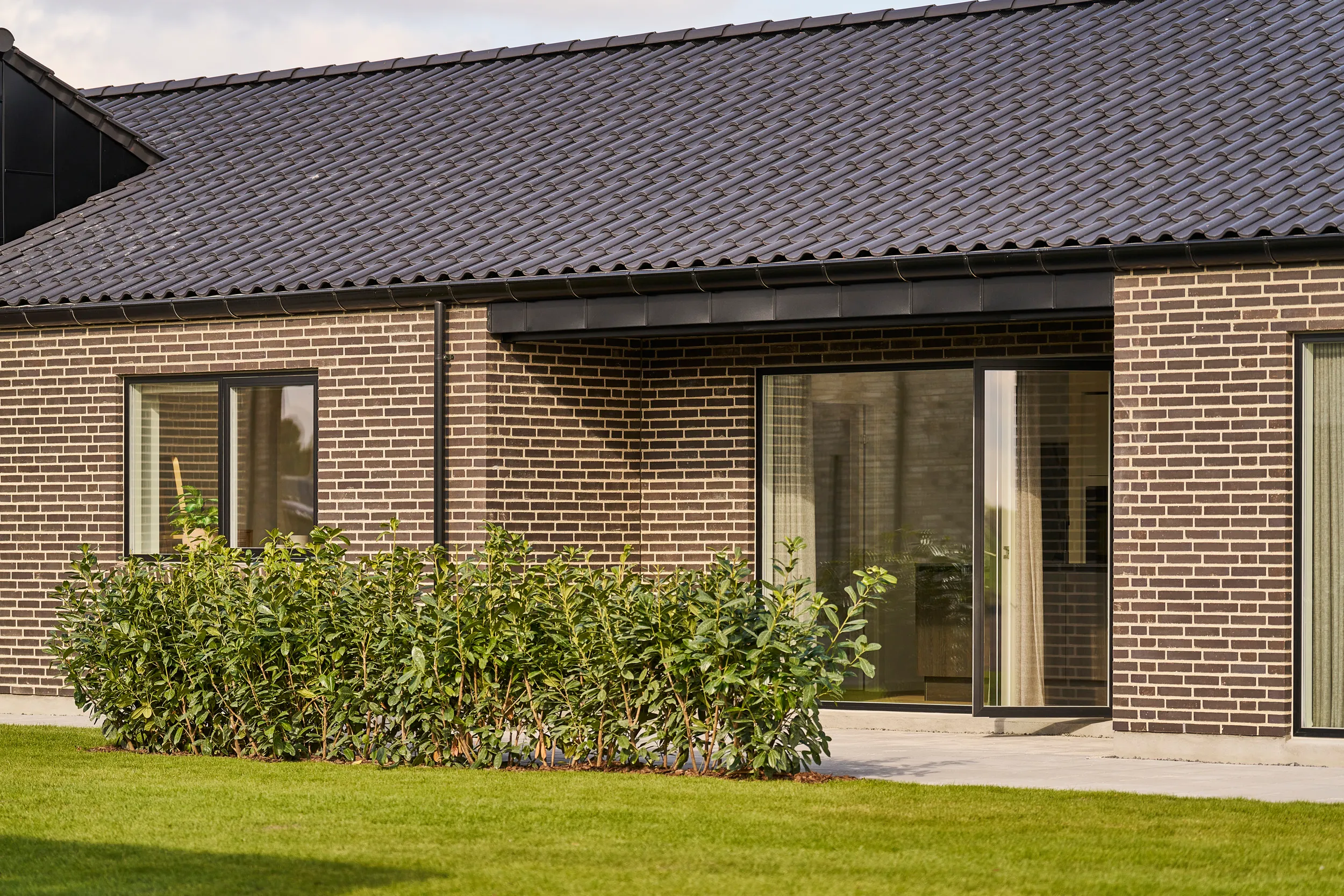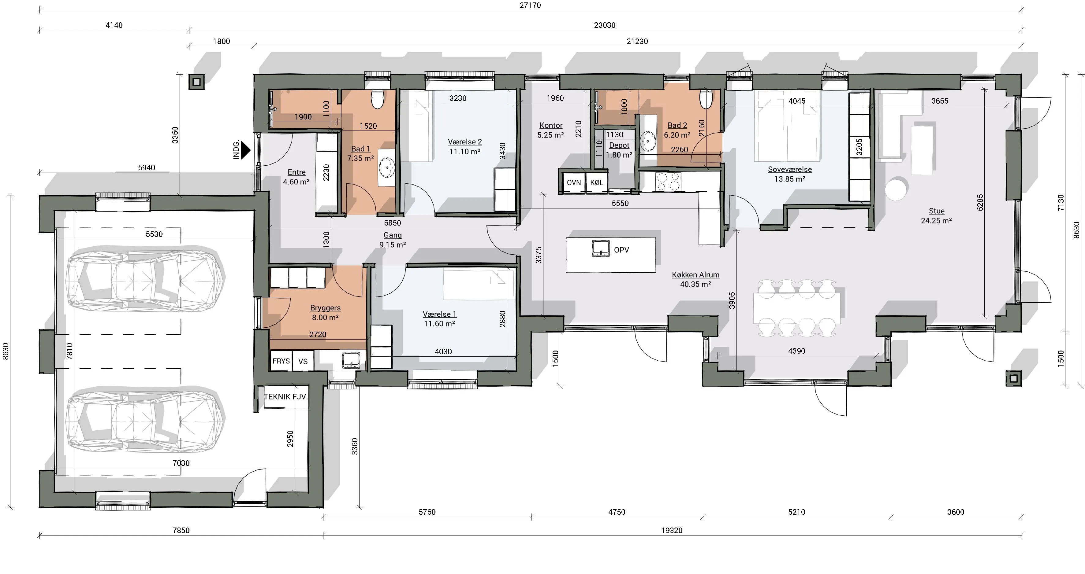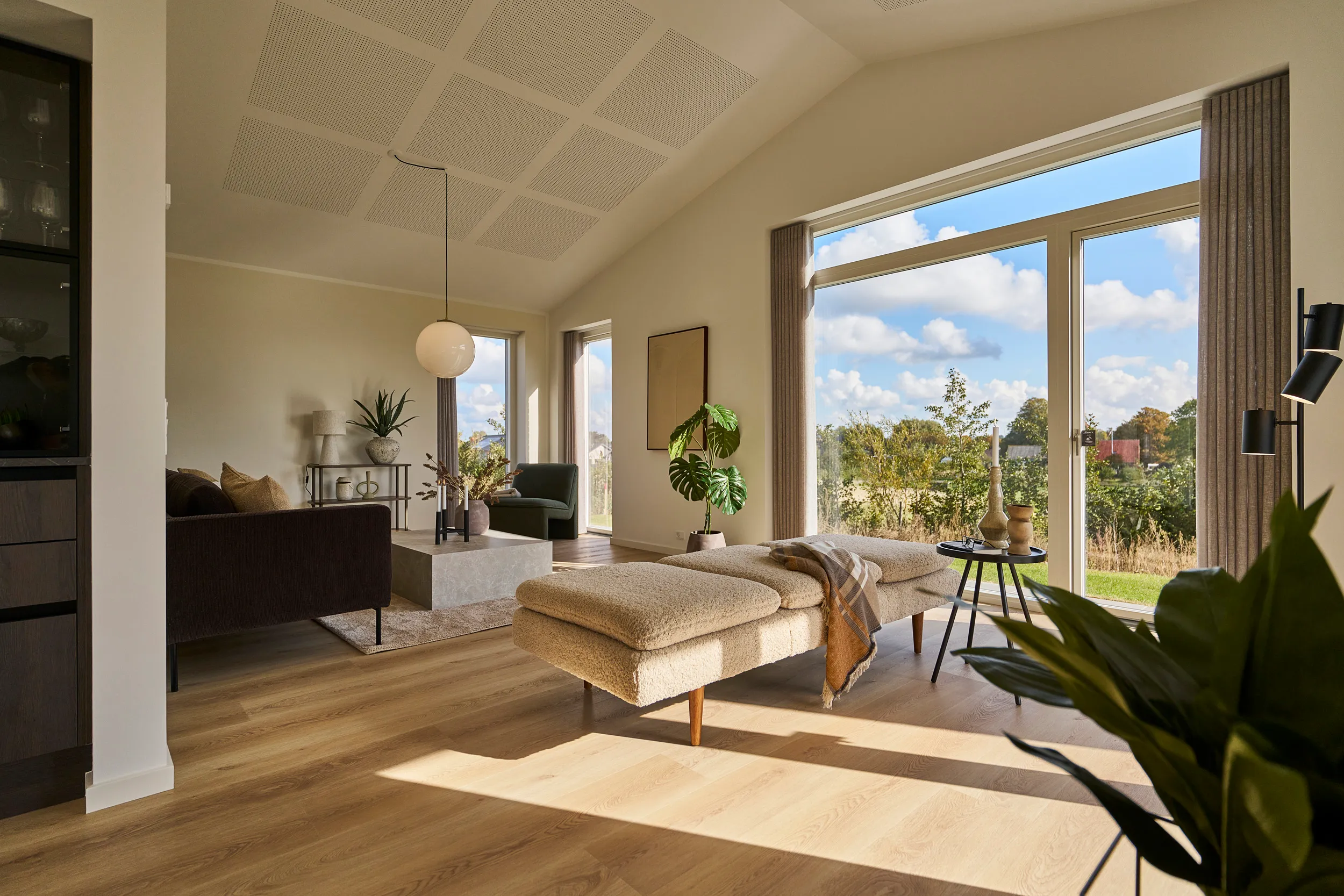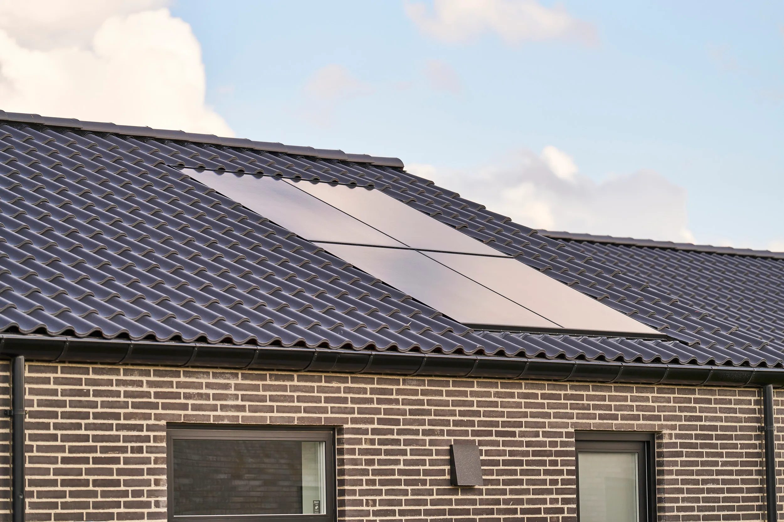 Længehus med solceller, teglsten, dobbelt garage, vinbar, skråloft og åbent køkken/alrum med store vinduespartier