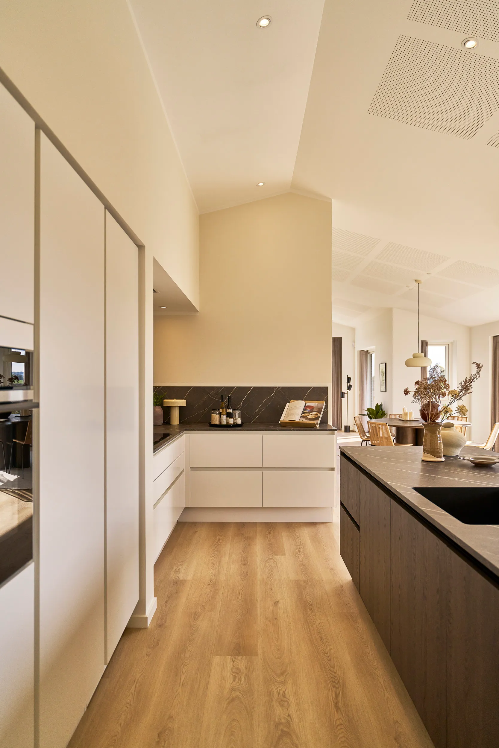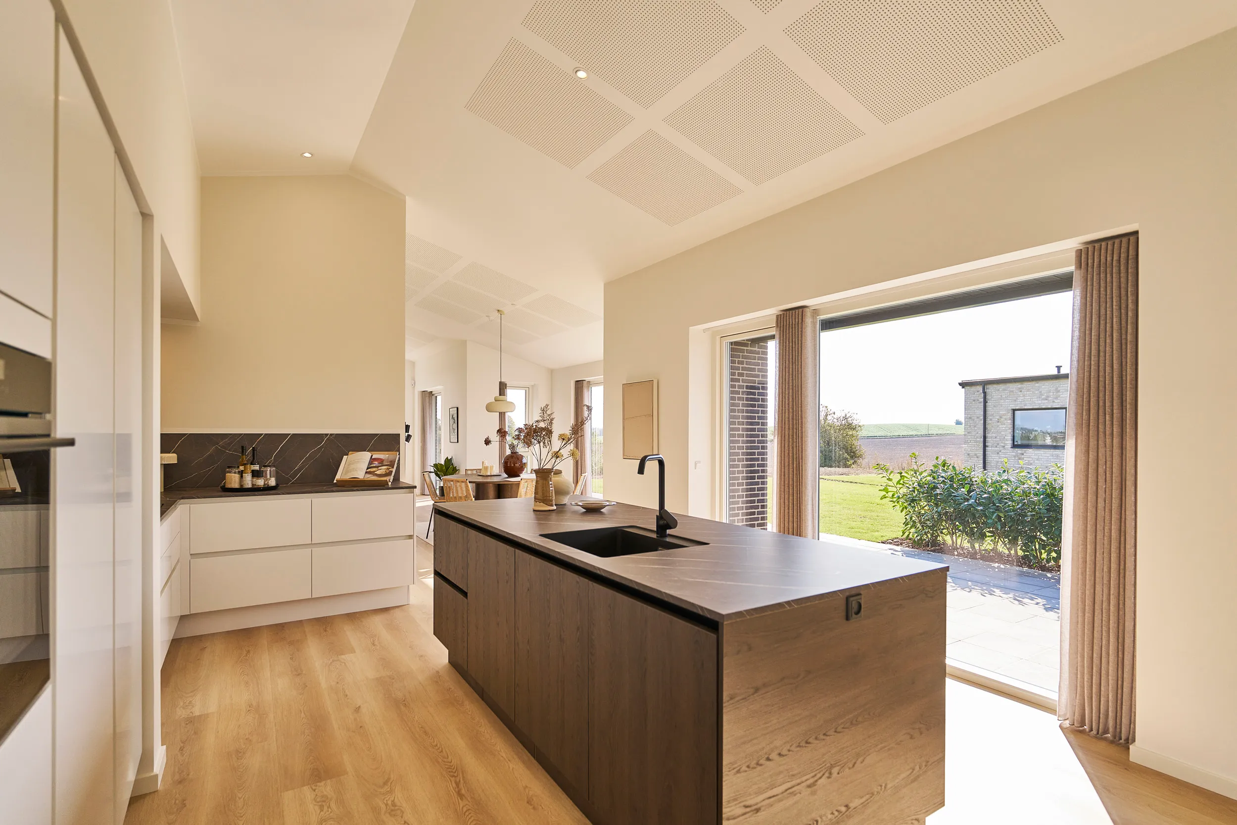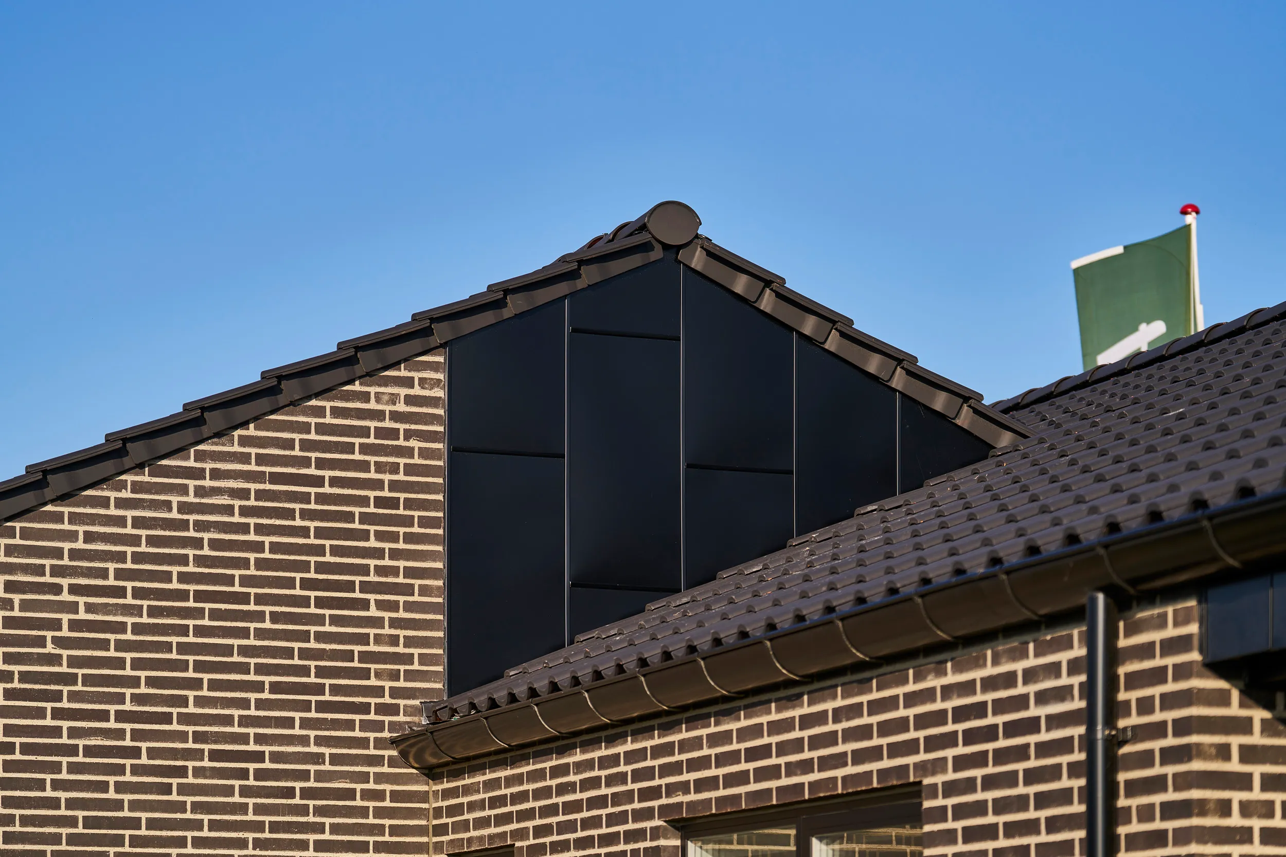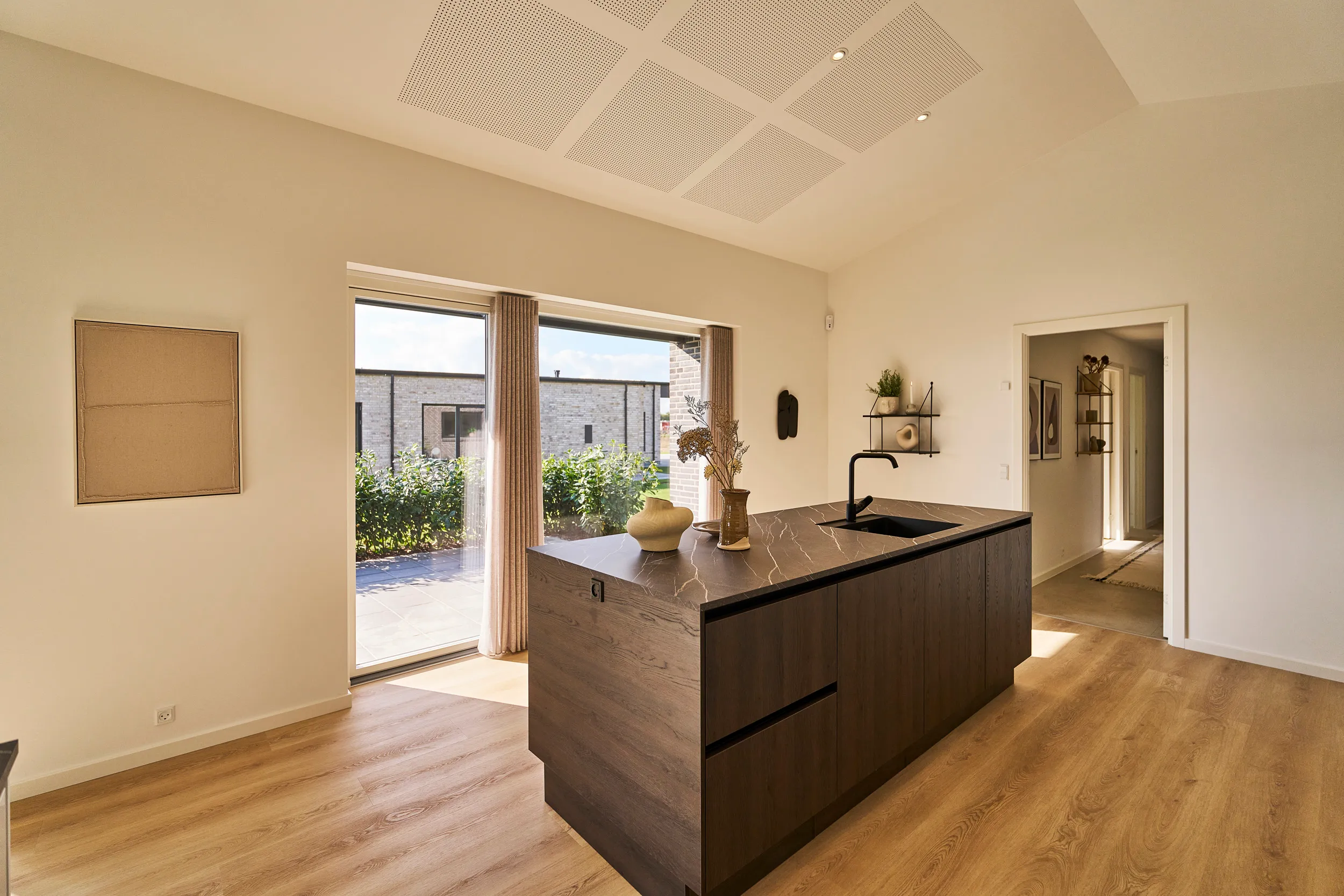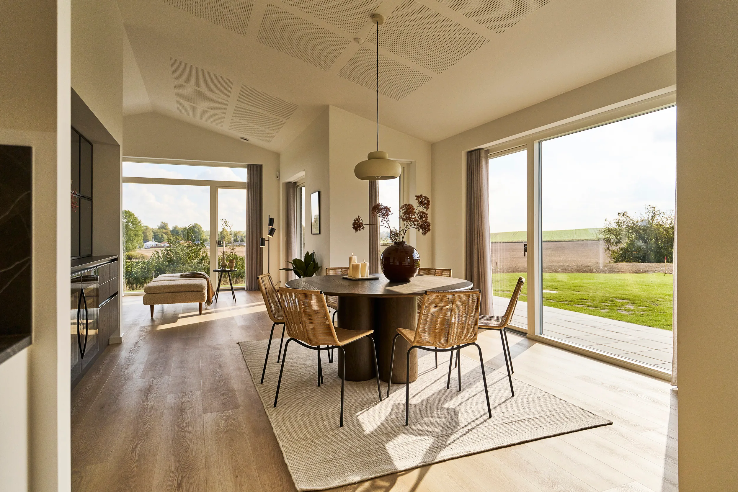 Længehus med solceller, teglsten, dobbelt garage, vinbar, skråloft og åbent køkken/alrum med store vinduespartier