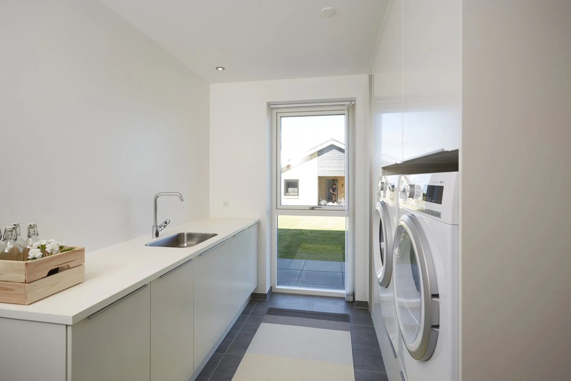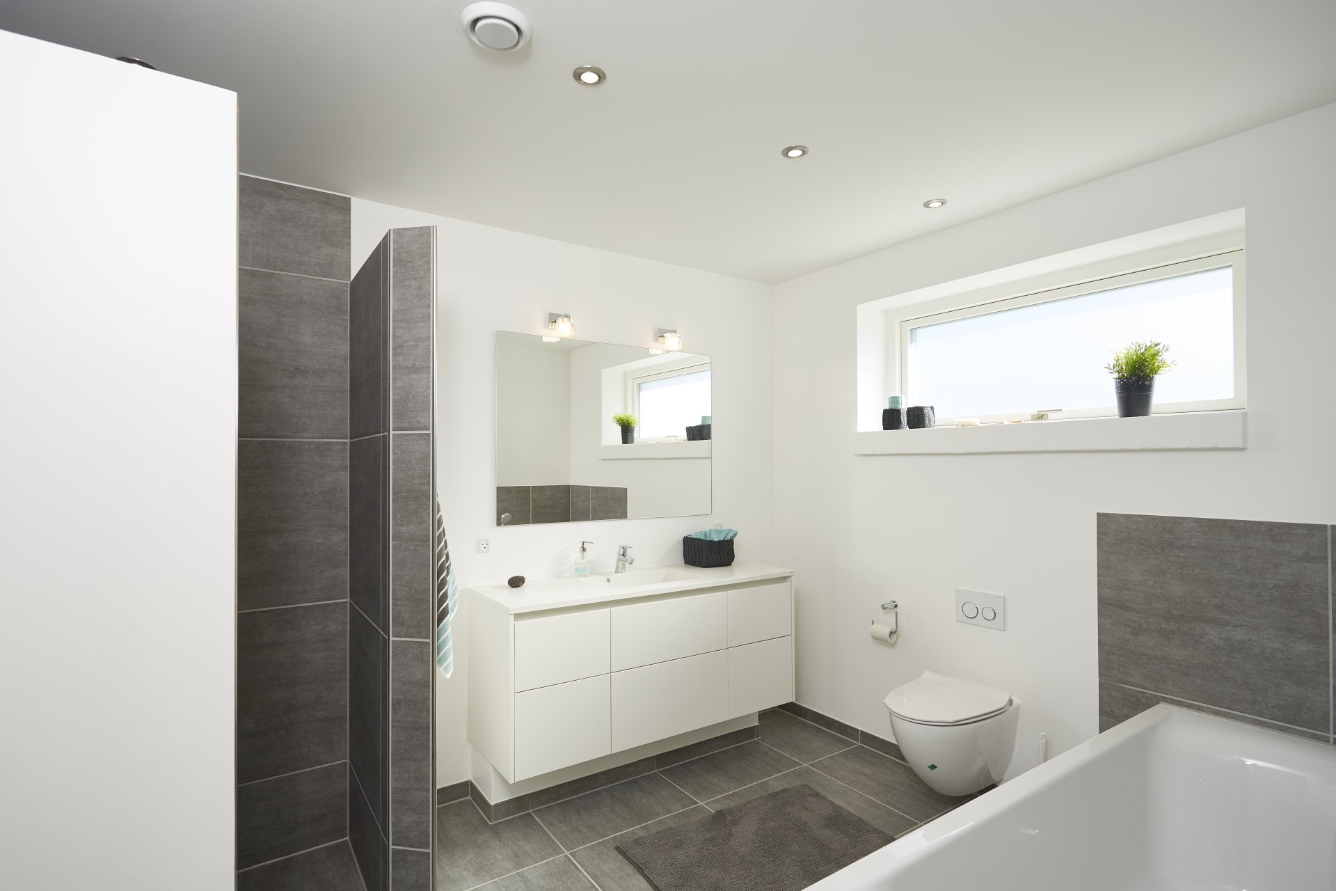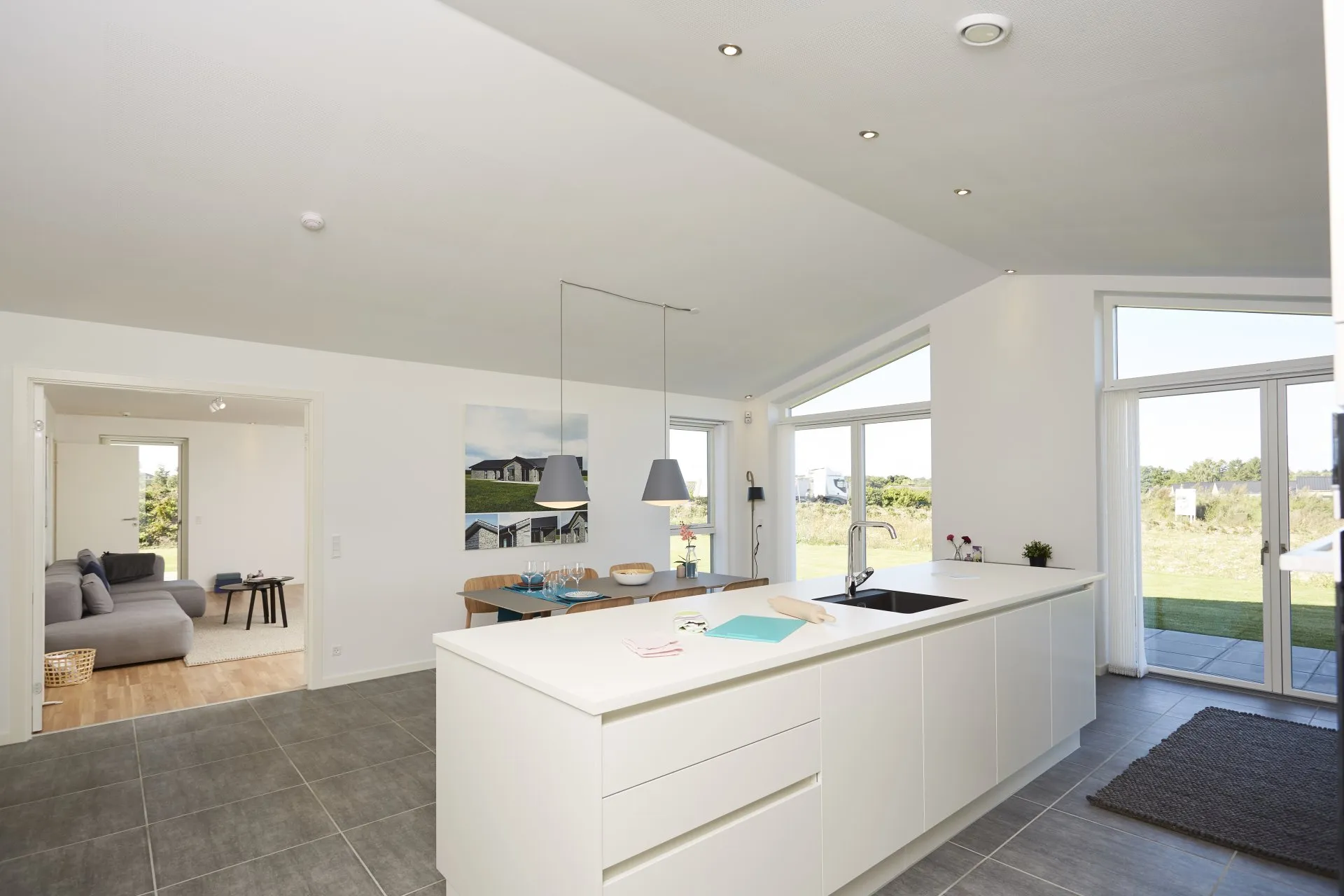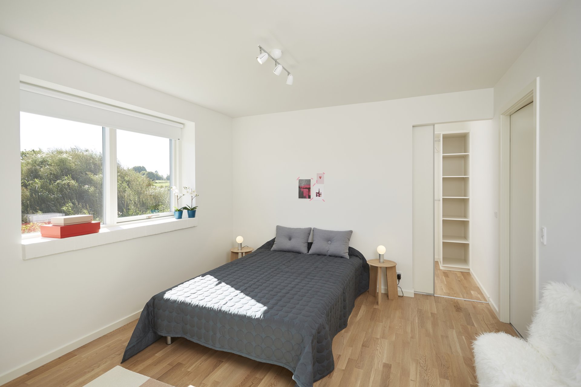 Indbyggede skabe, loft til kip og trekants-vinduer i køkken/alrum, badekar og walk-in.