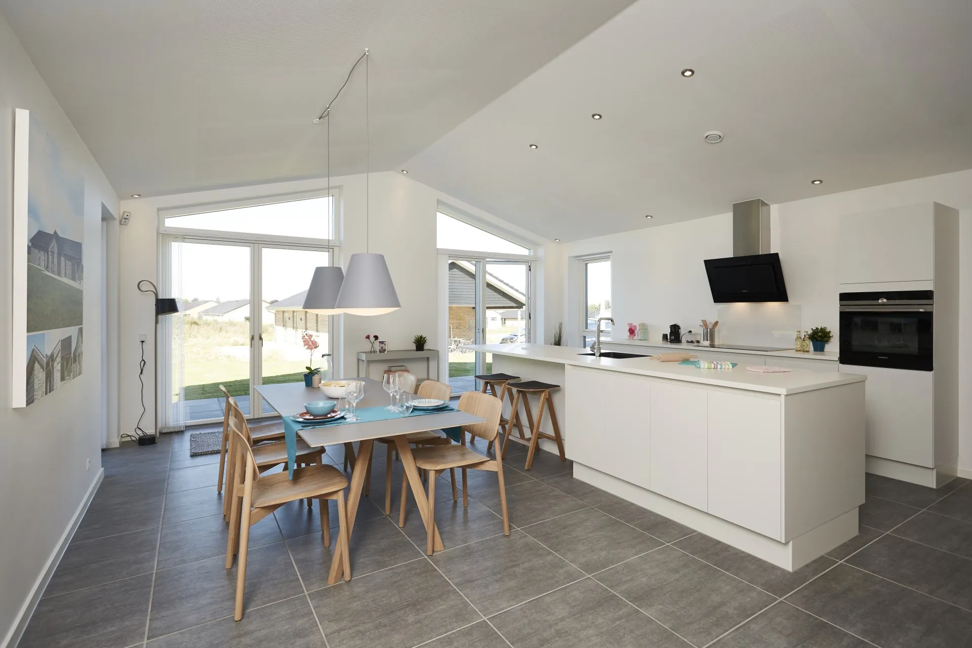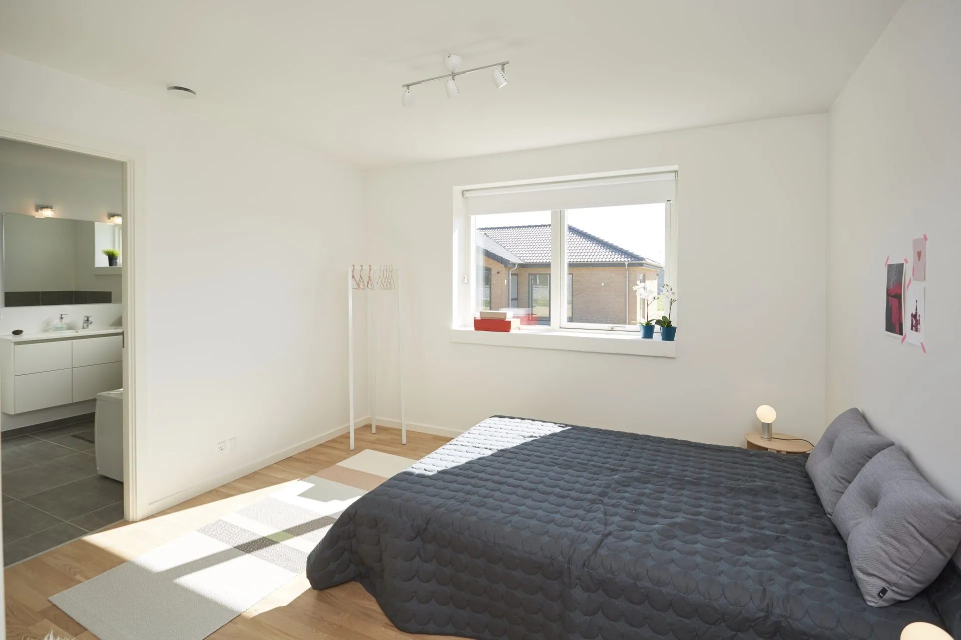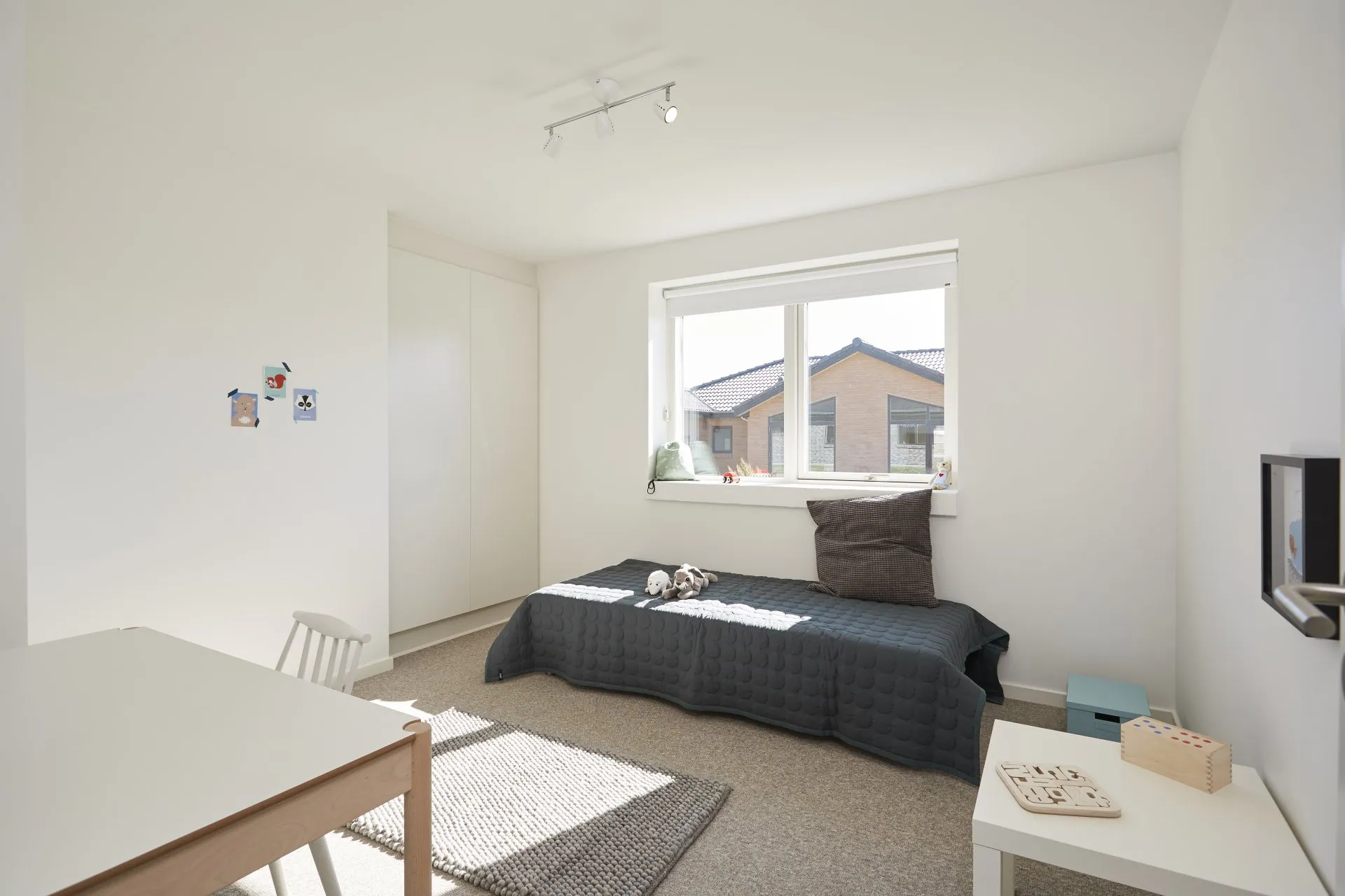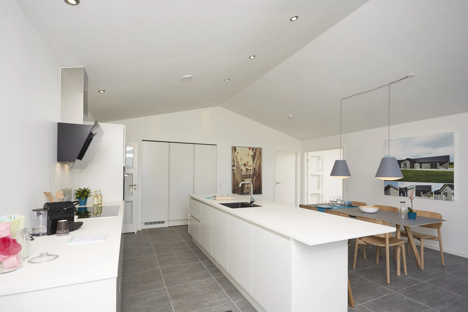 Indbyggede skabe, loft til kip og trekants-vinduer i køkken/alrum, badekar og walk-in.