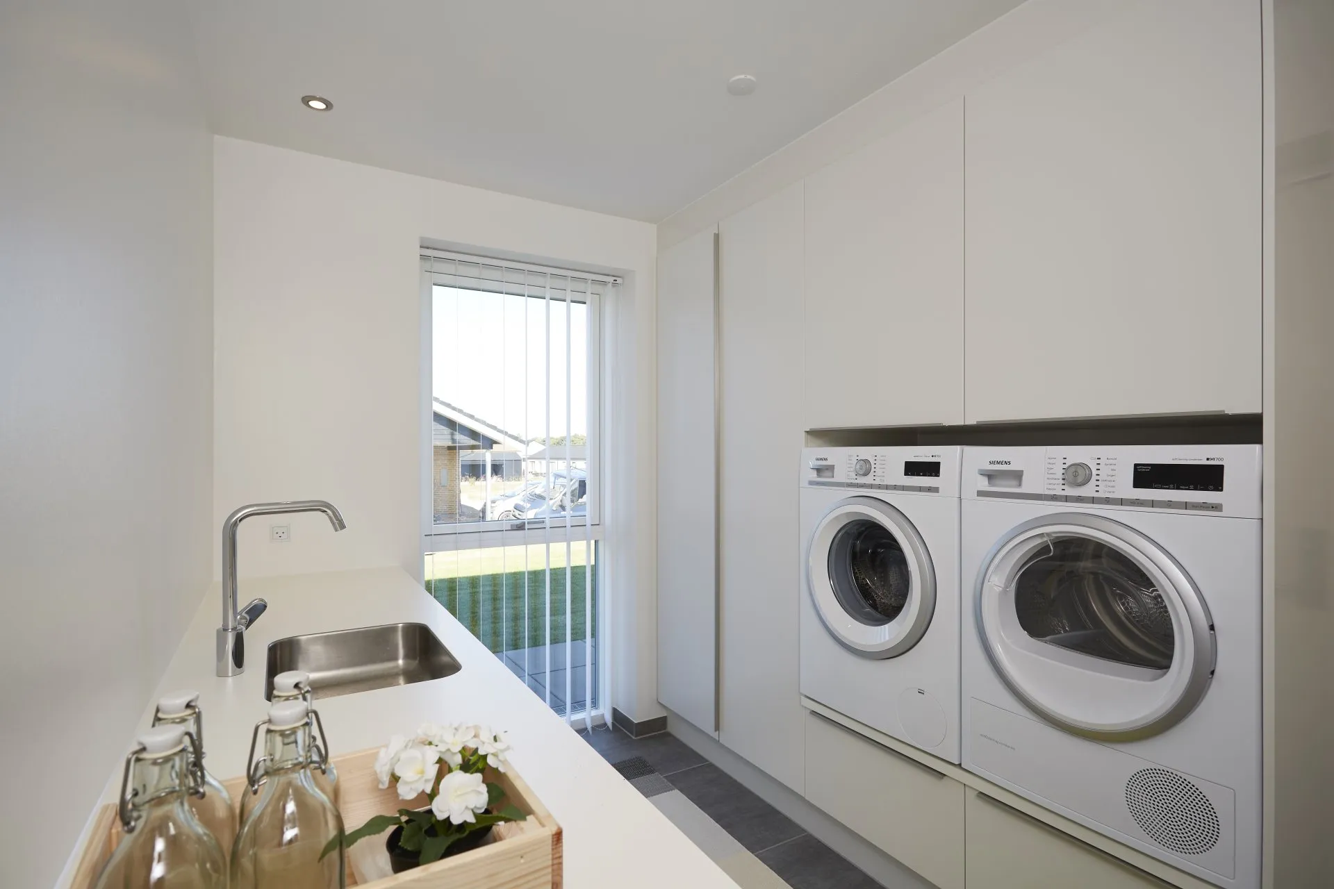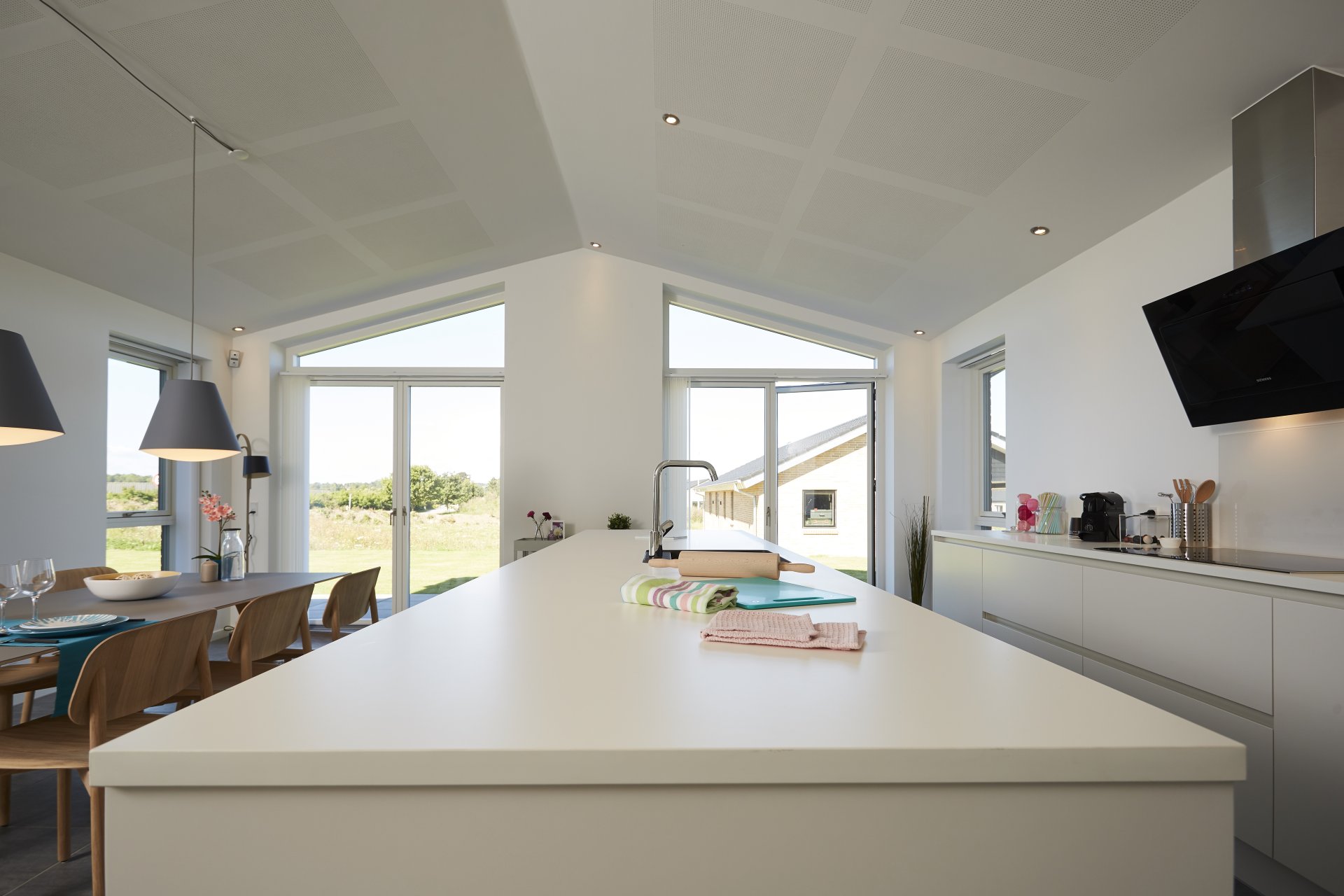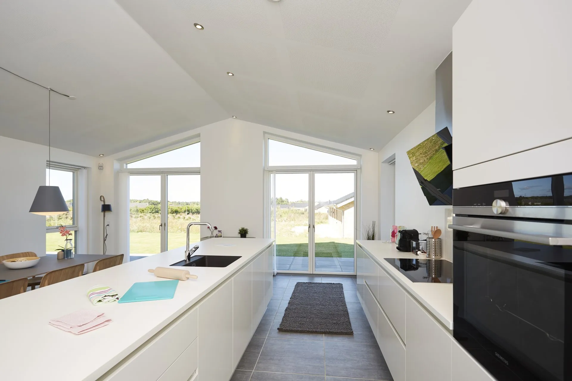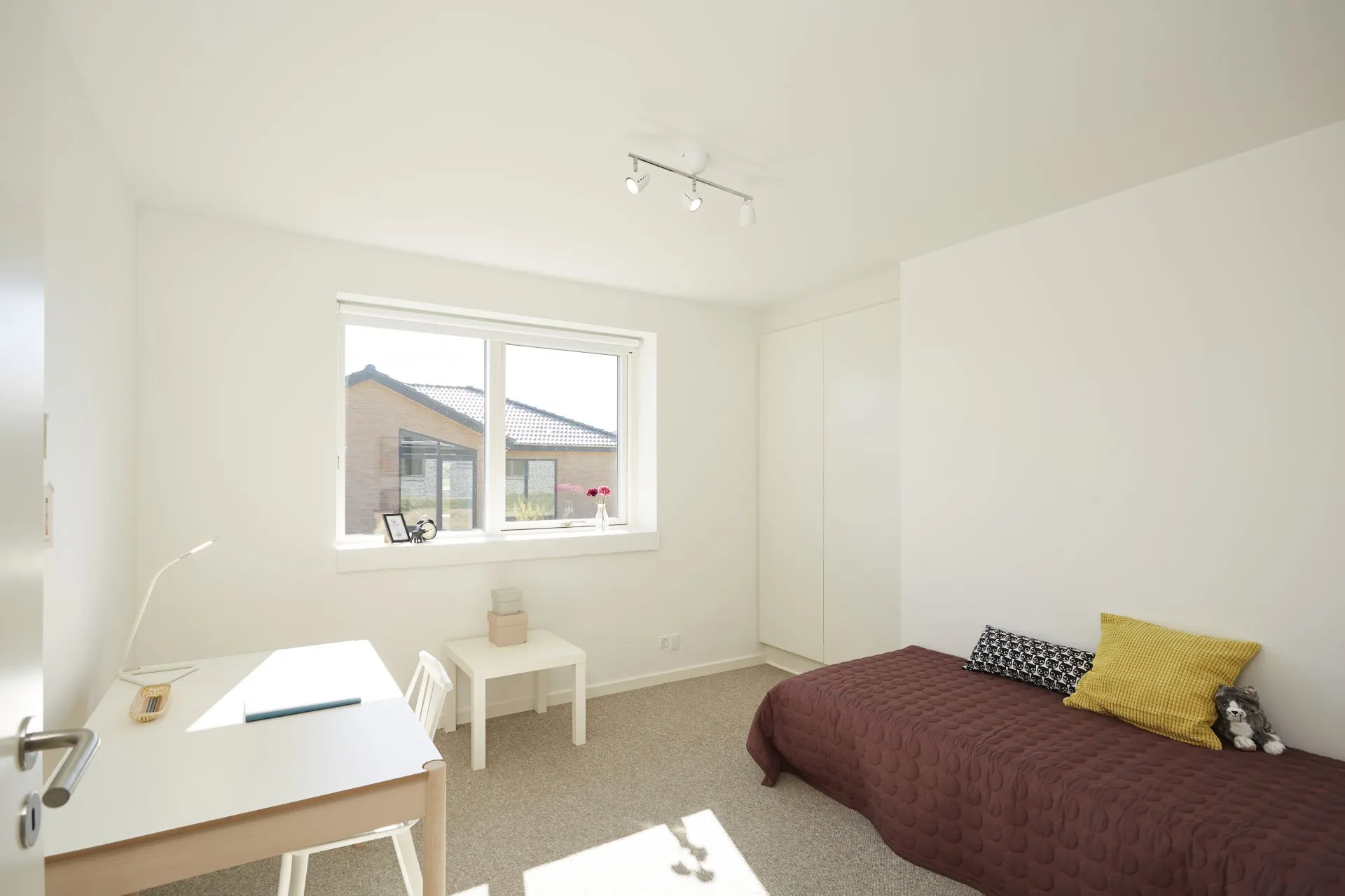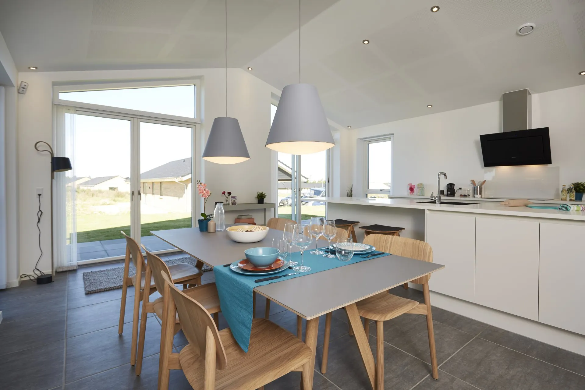 Indbyggede skabe, loft til kip og trekants-vinduer i køkken/alrum, badekar og walk-in.