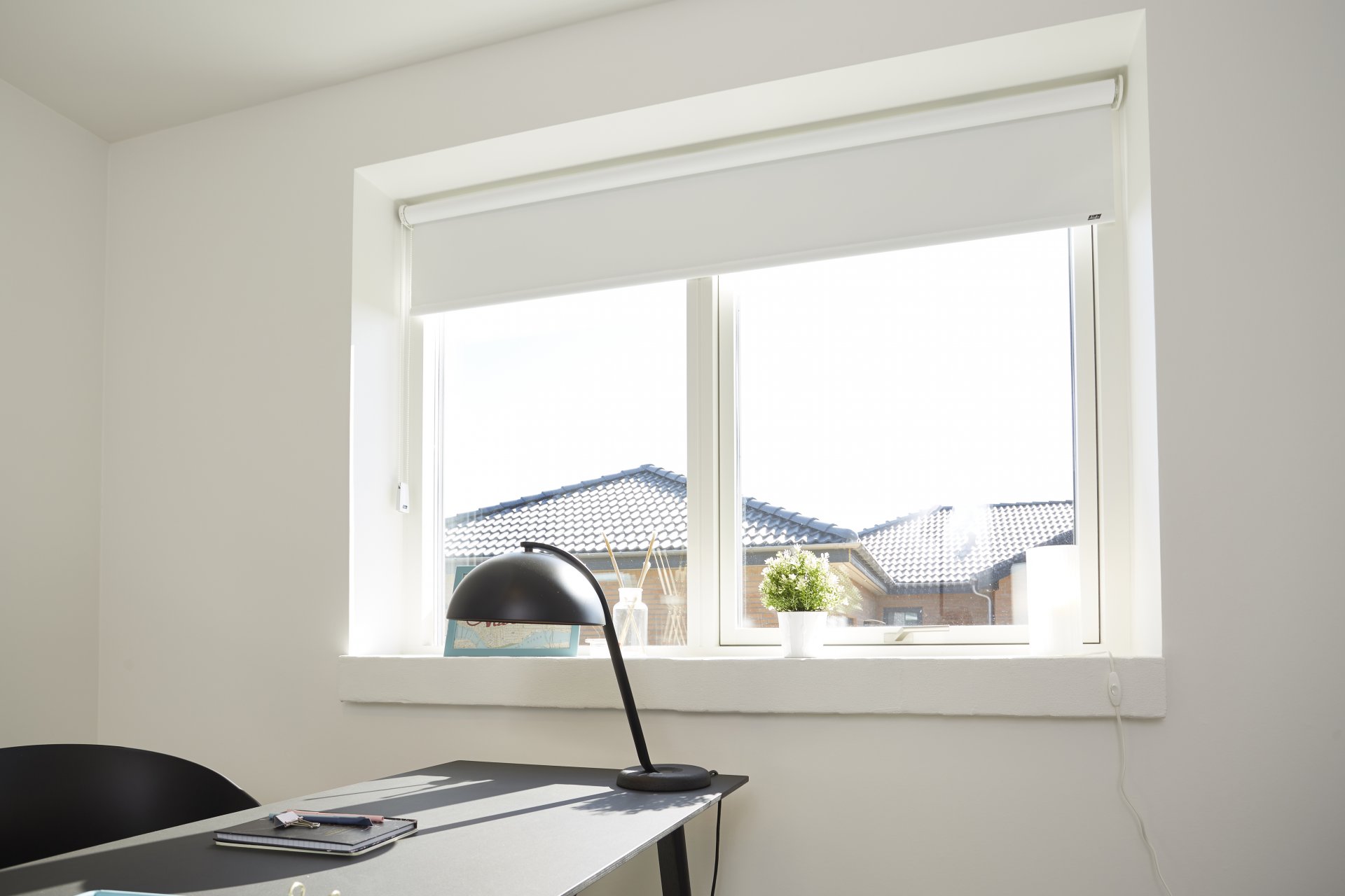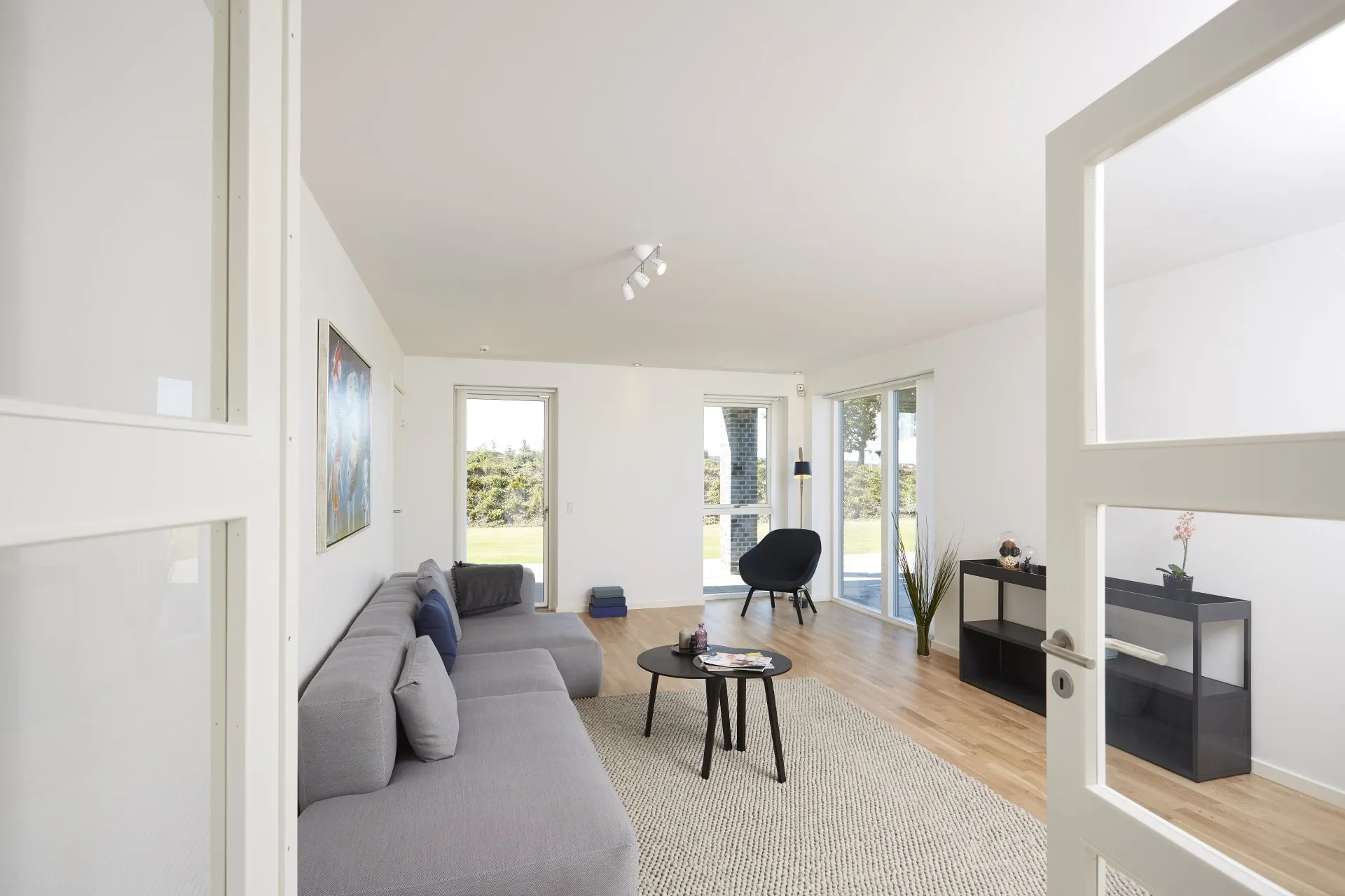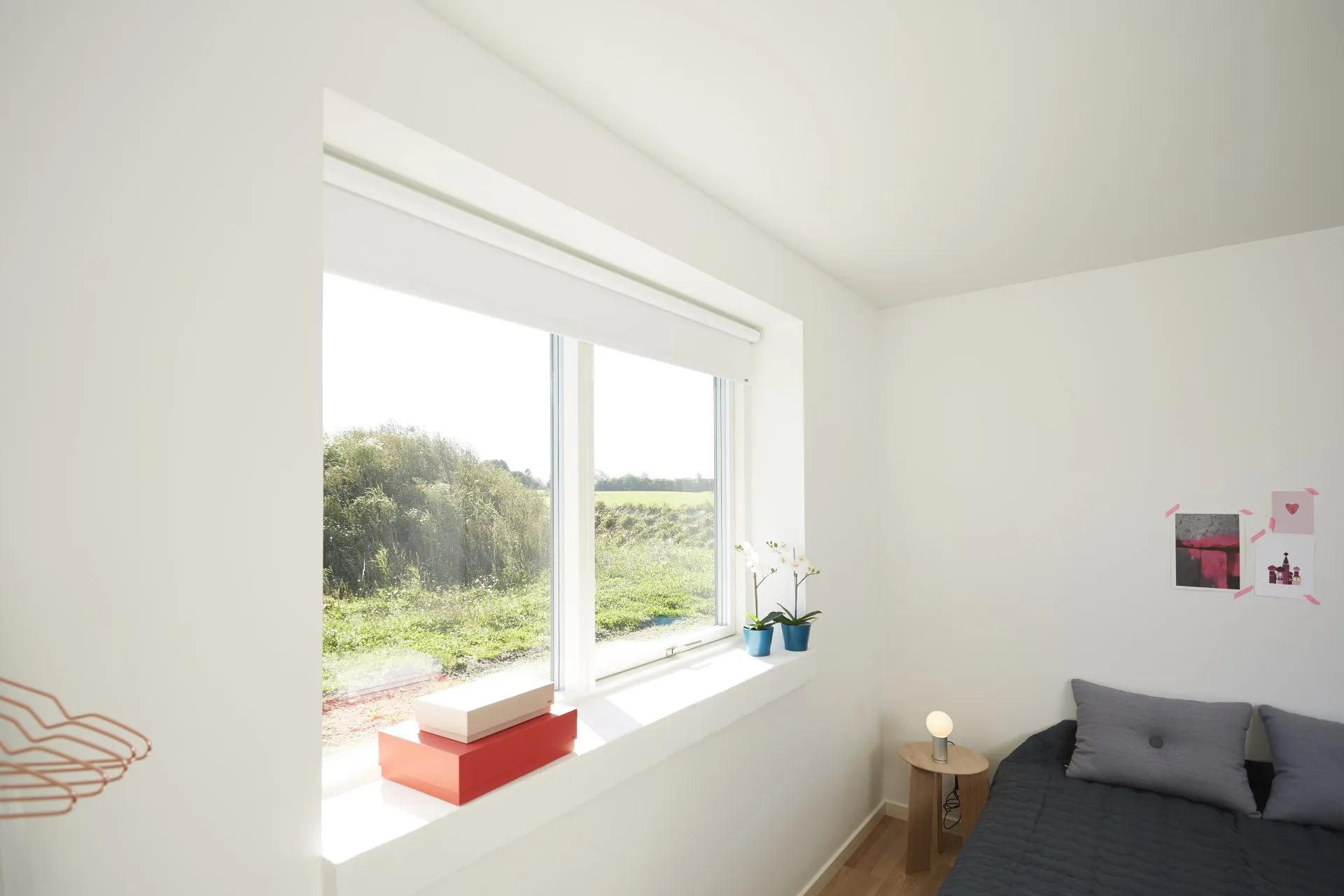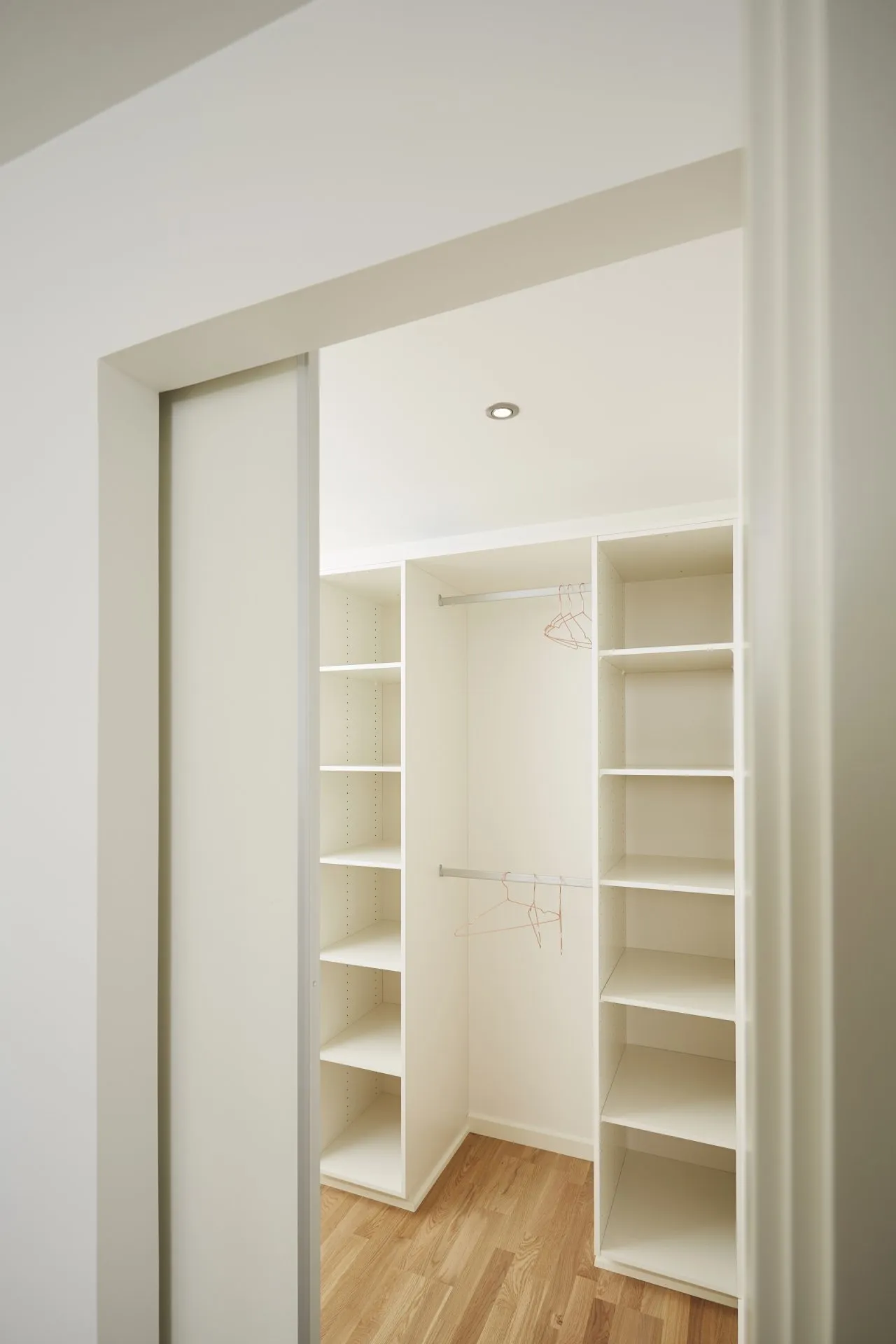 Indbyggede skabe, loft til kip og trekants-vinduer i køkken/alrum, badekar og walk-in.