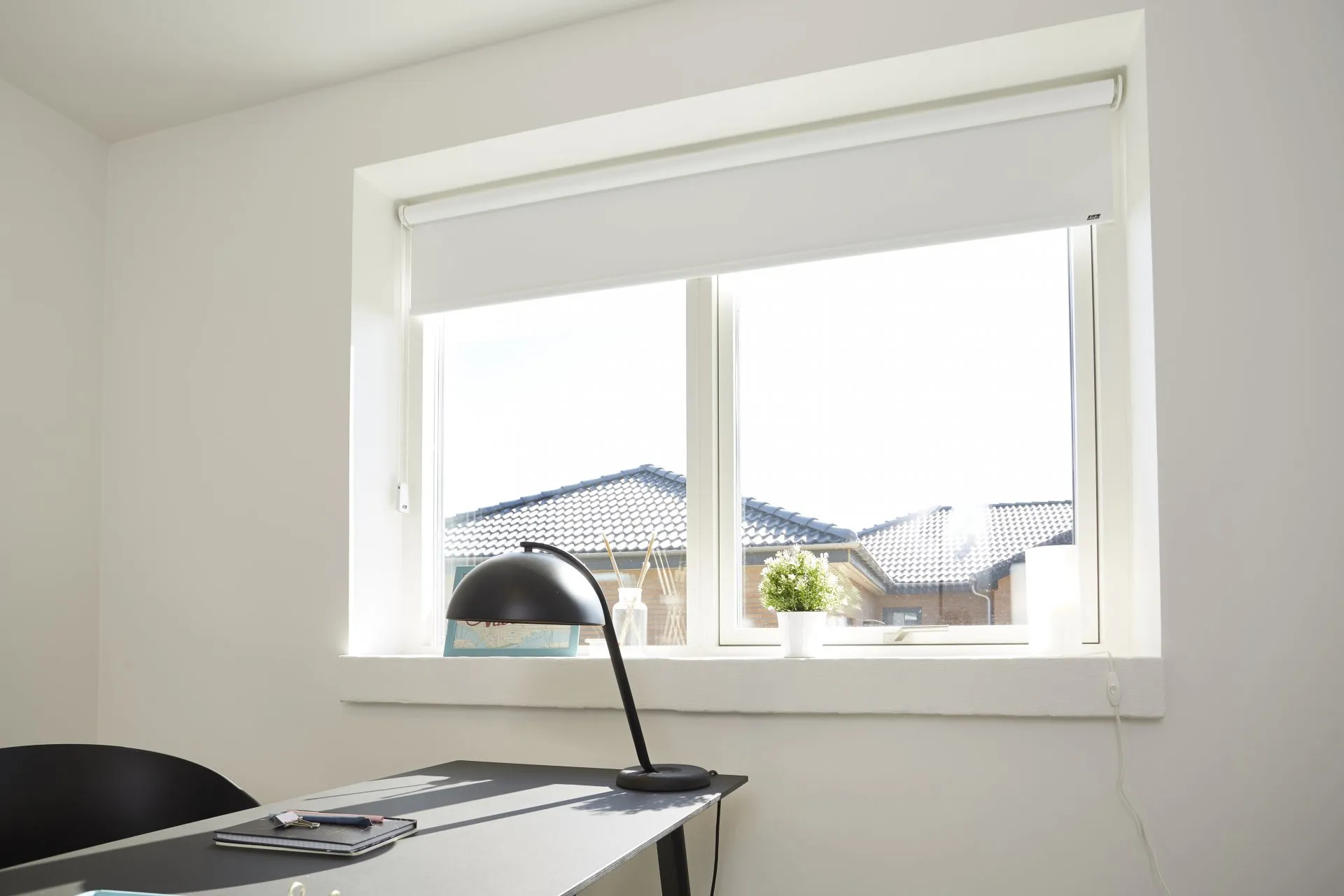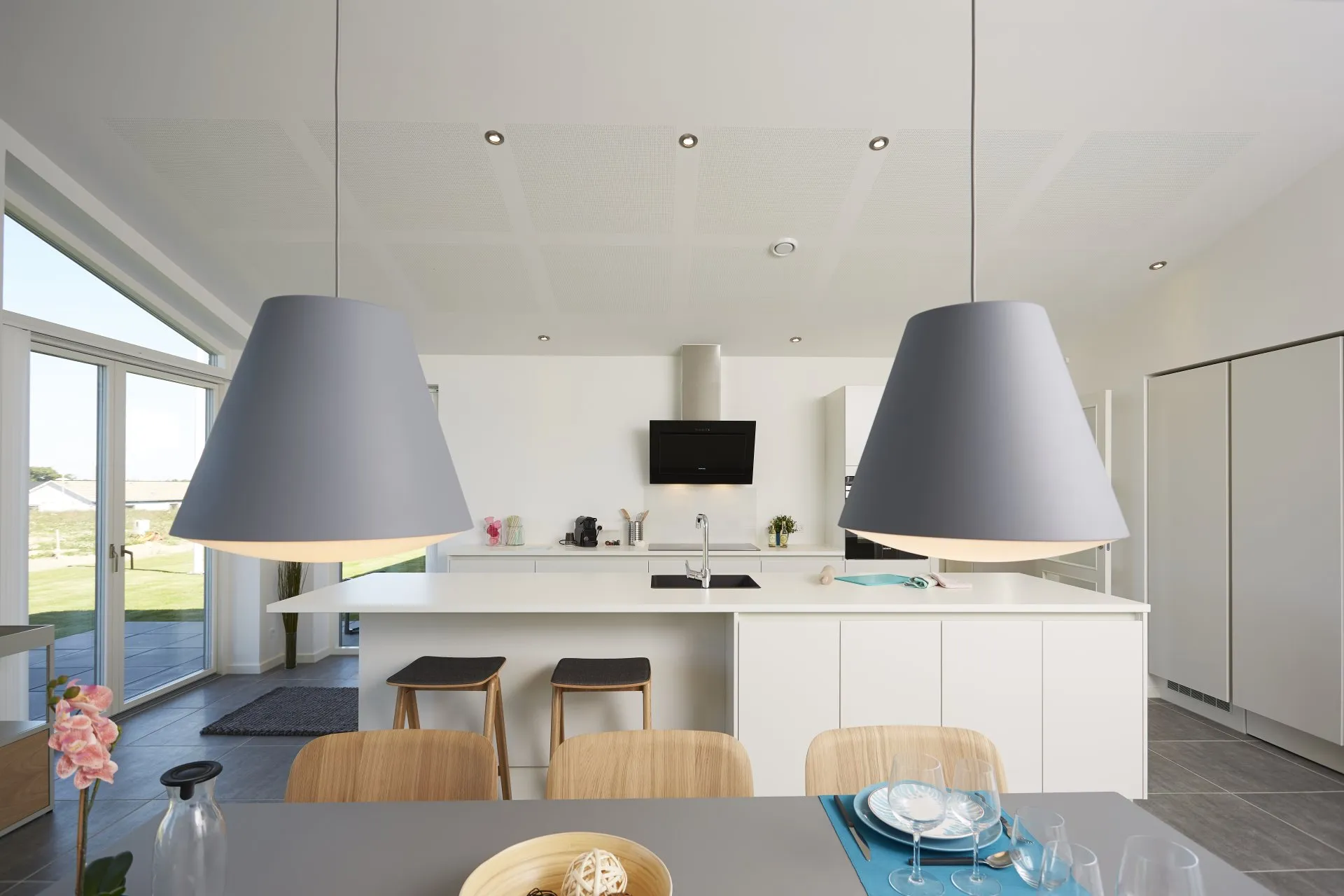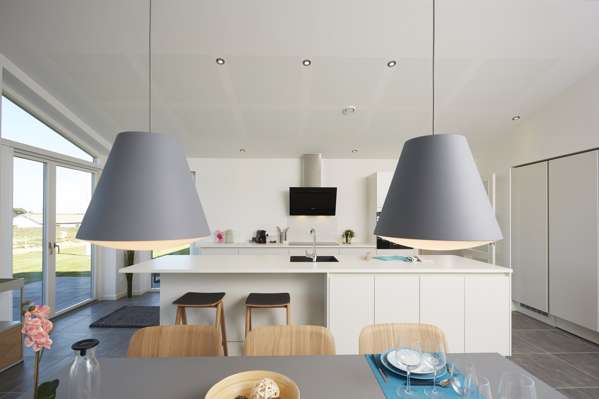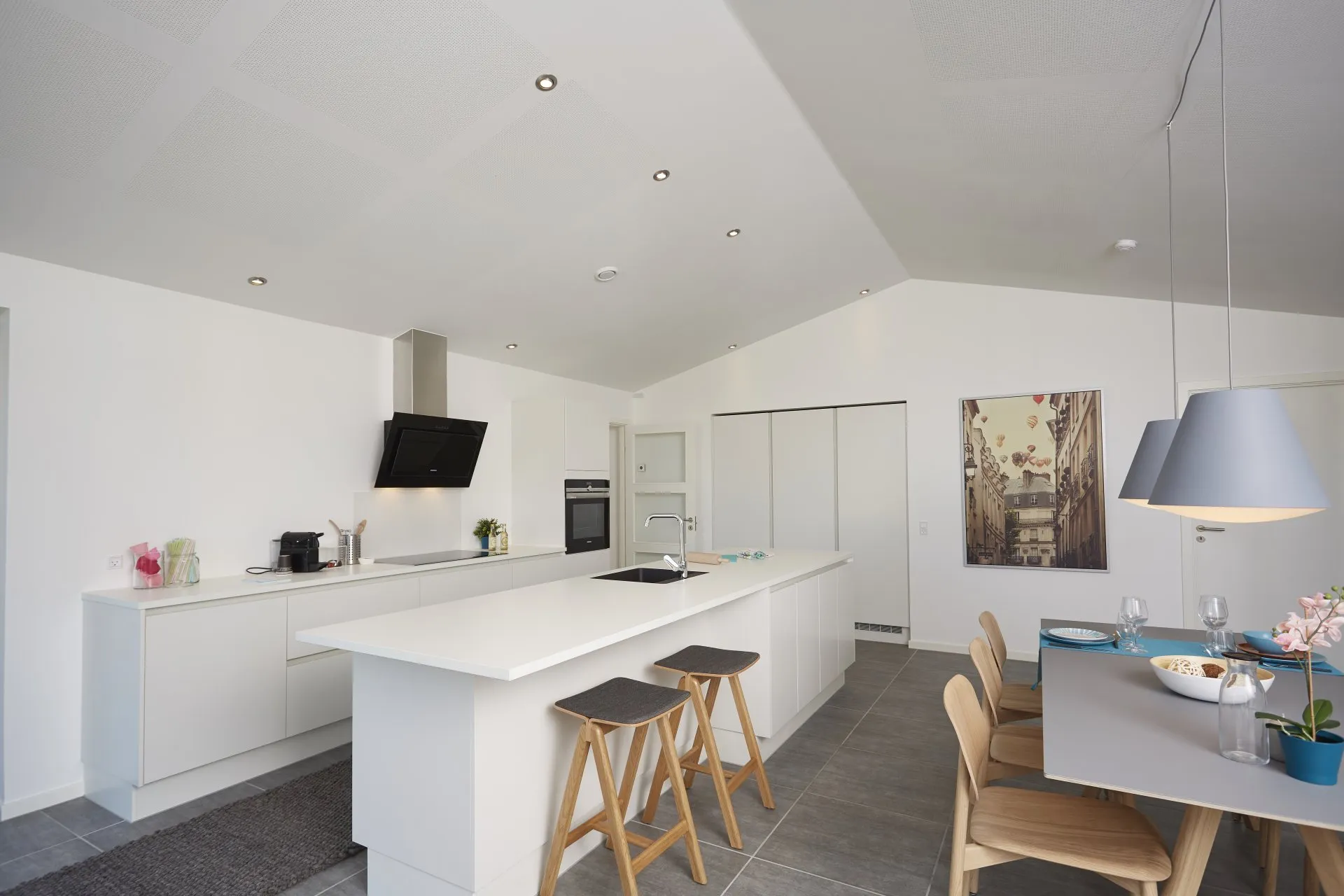 Indbyggede skabe, loft til kip og trekants-vinduer i køkken/alrum, badekar og walk-in.