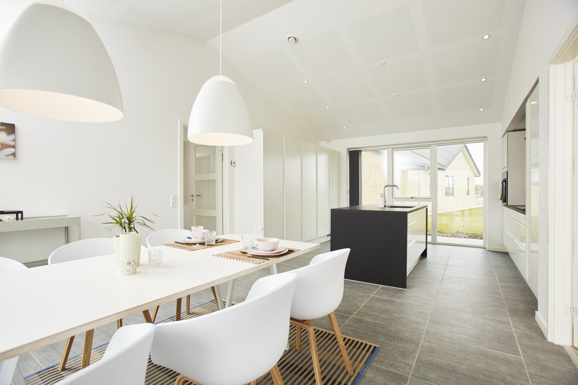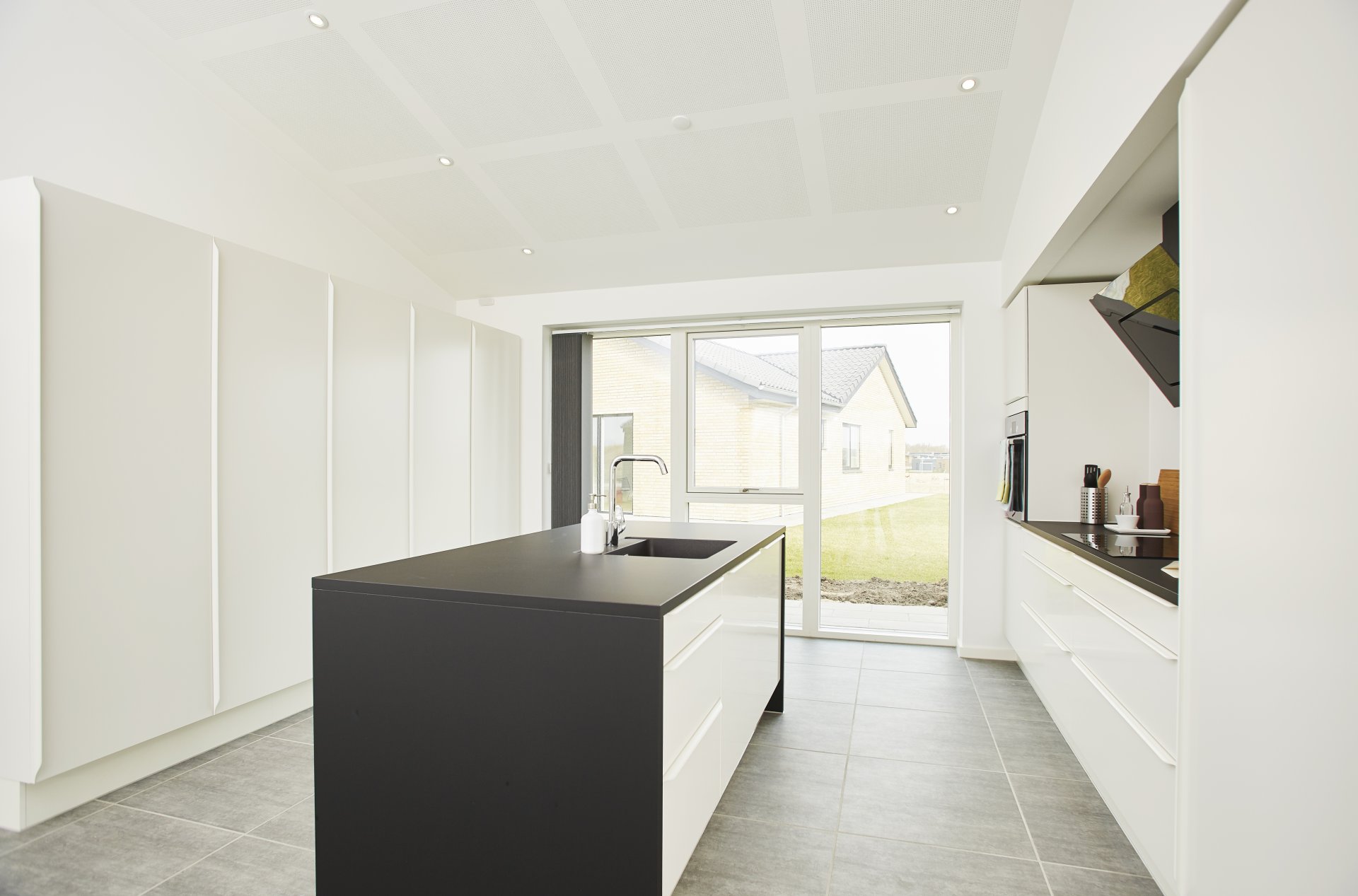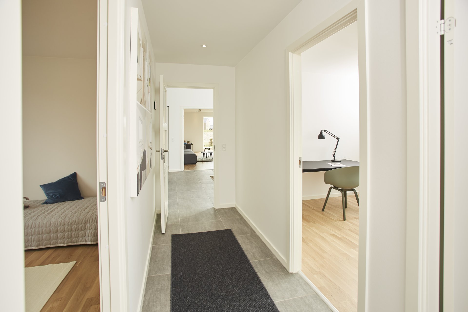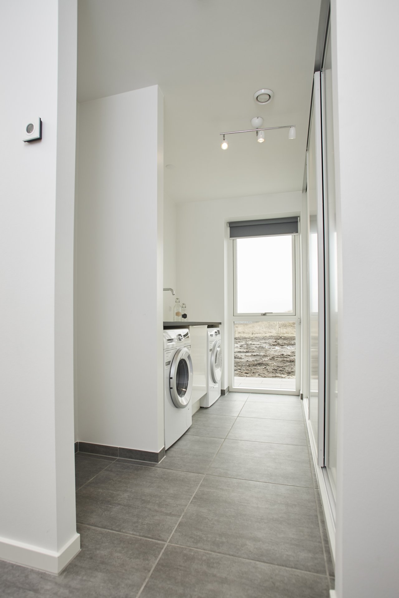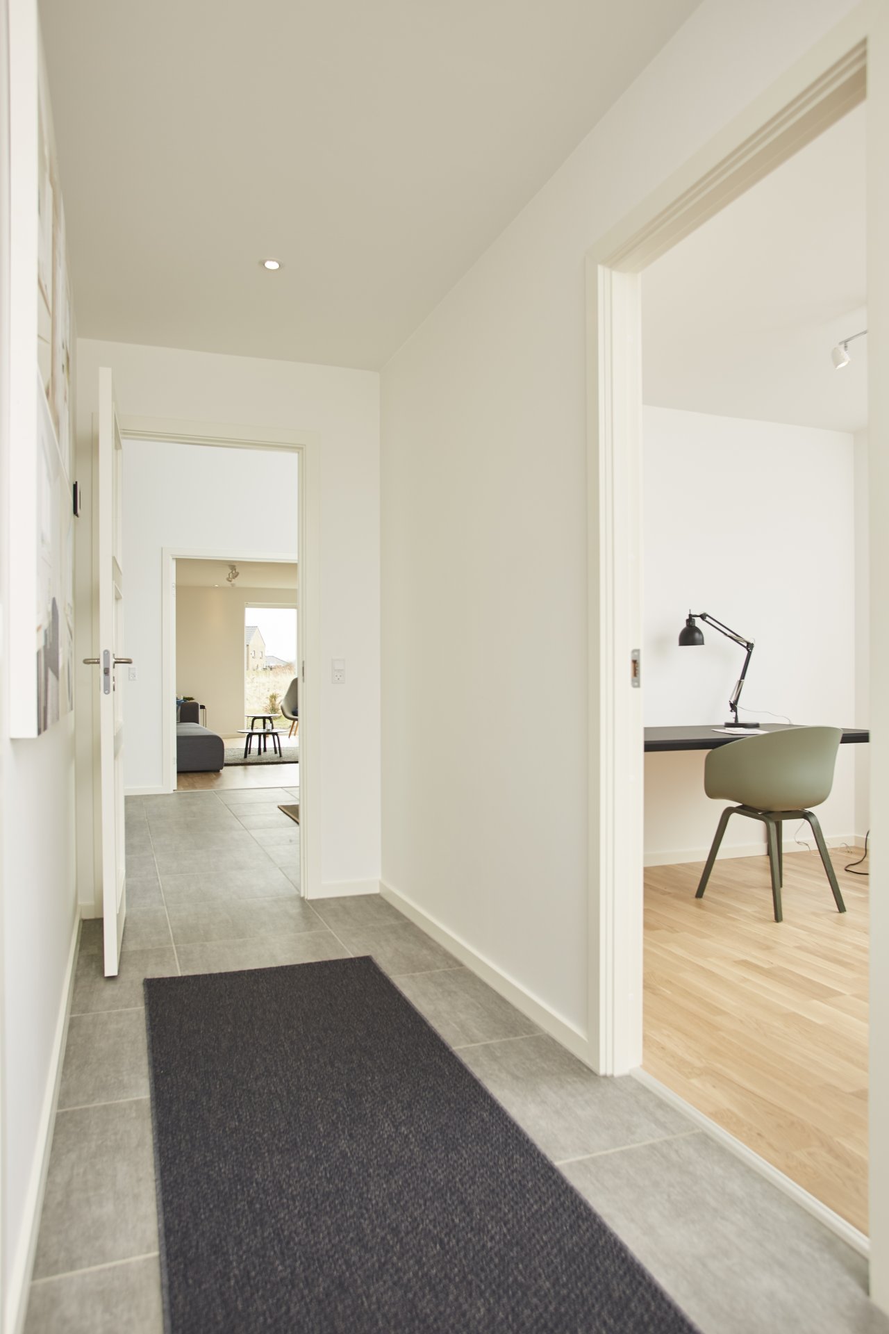 Forbundet entré og bryggers, vindueskarme samt skråloft med akustikplader.