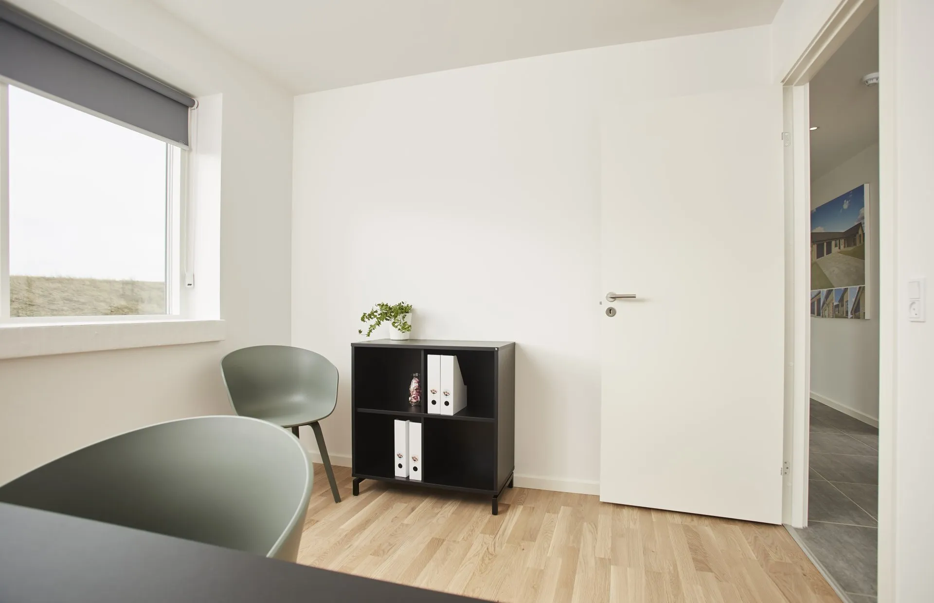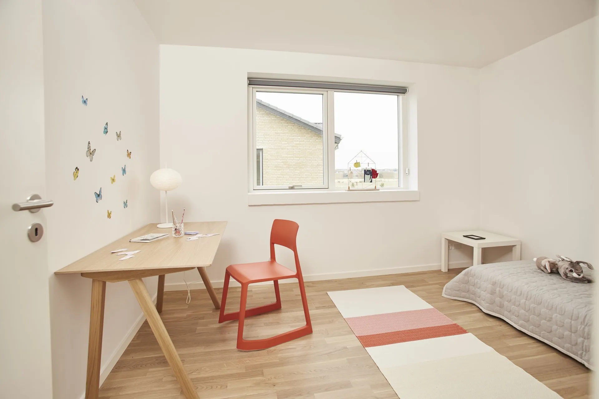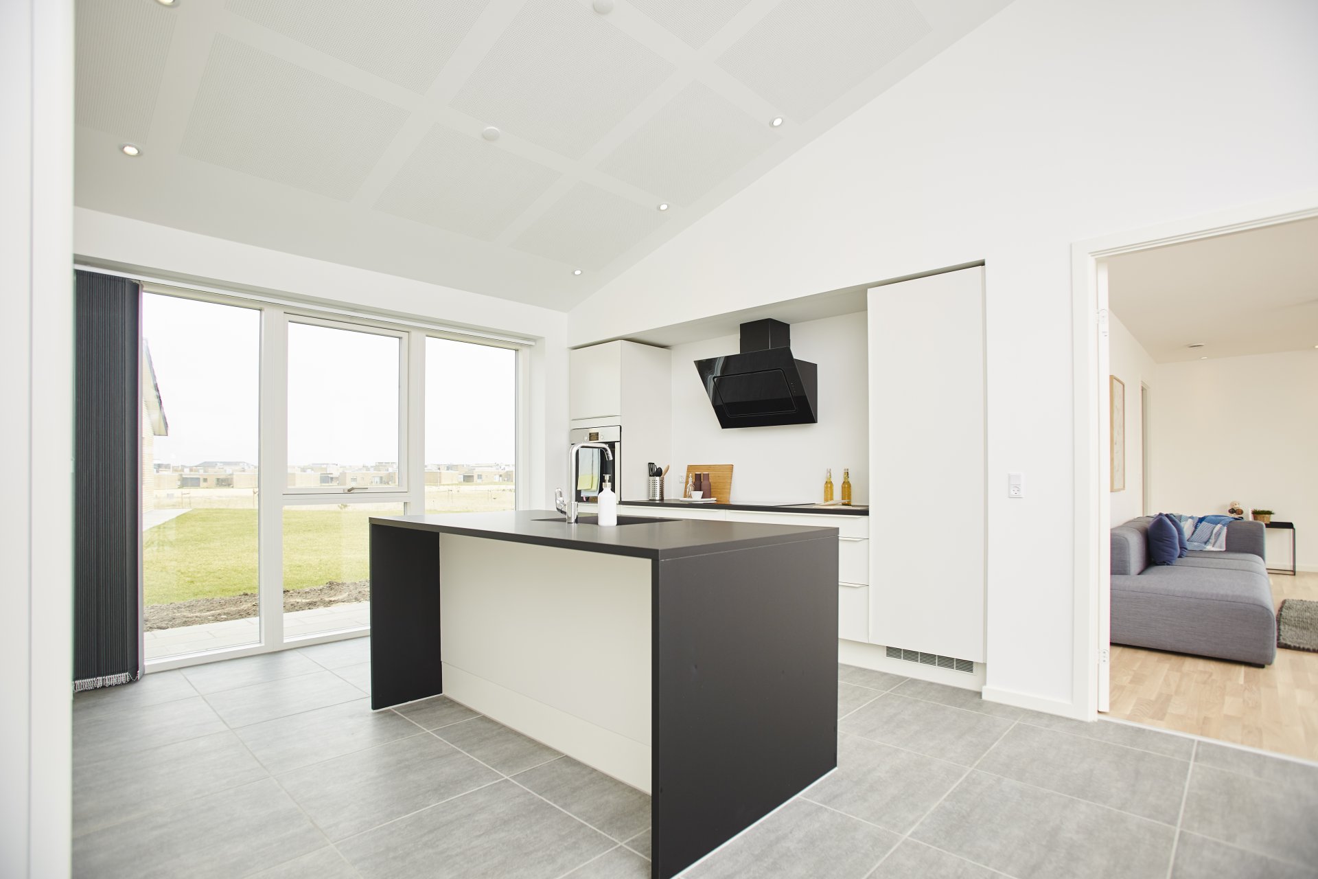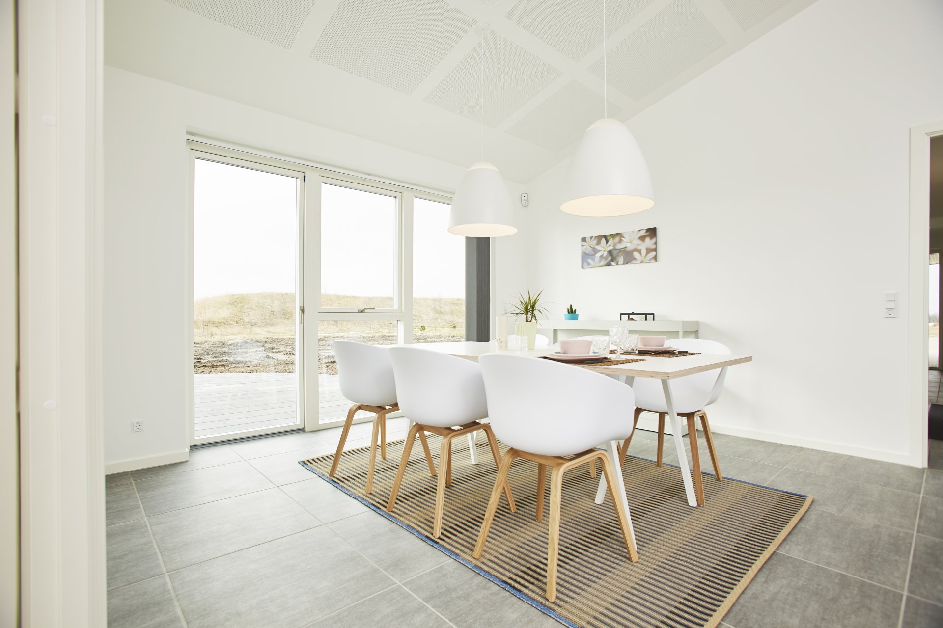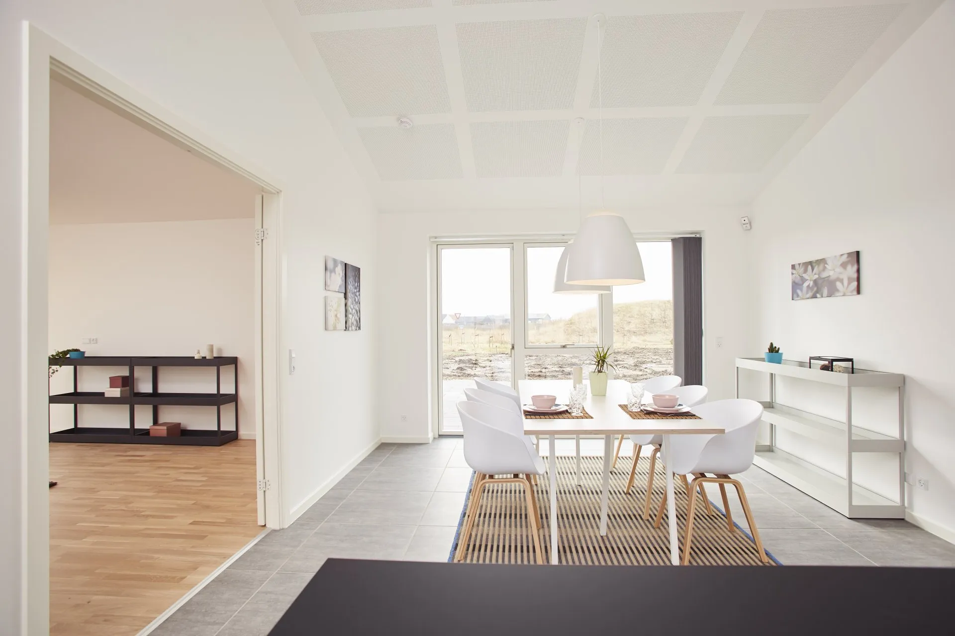 Forbundet entré og bryggers, vindueskarme samt skråloft med akustikplader.