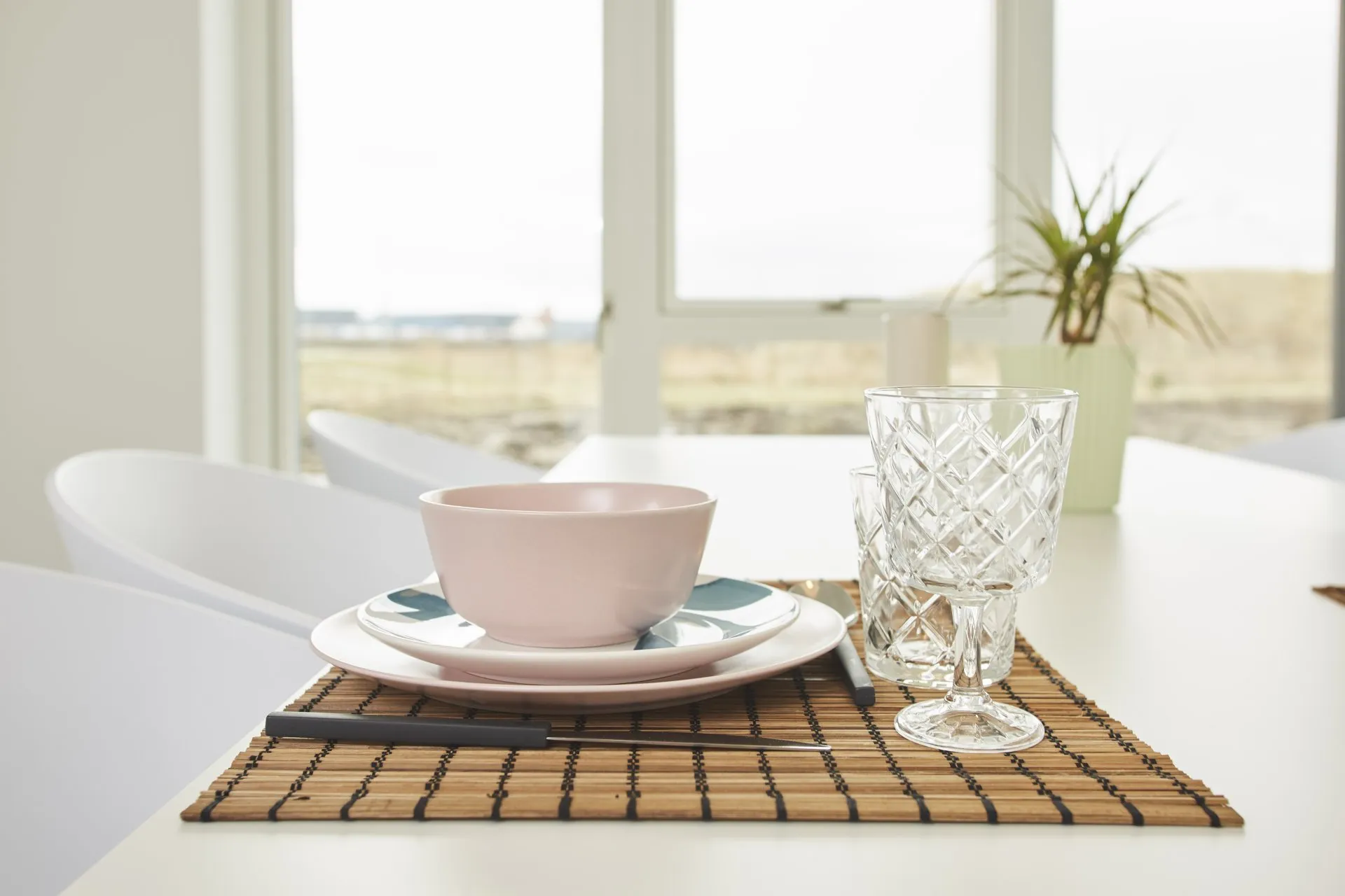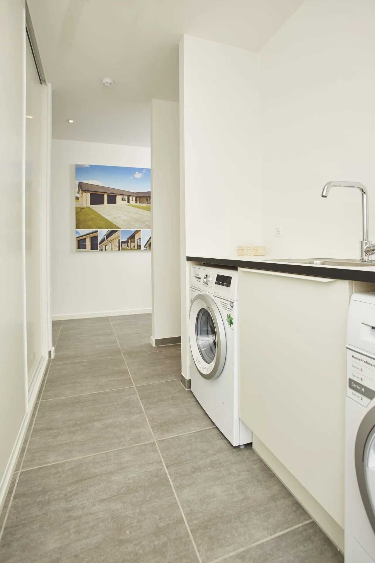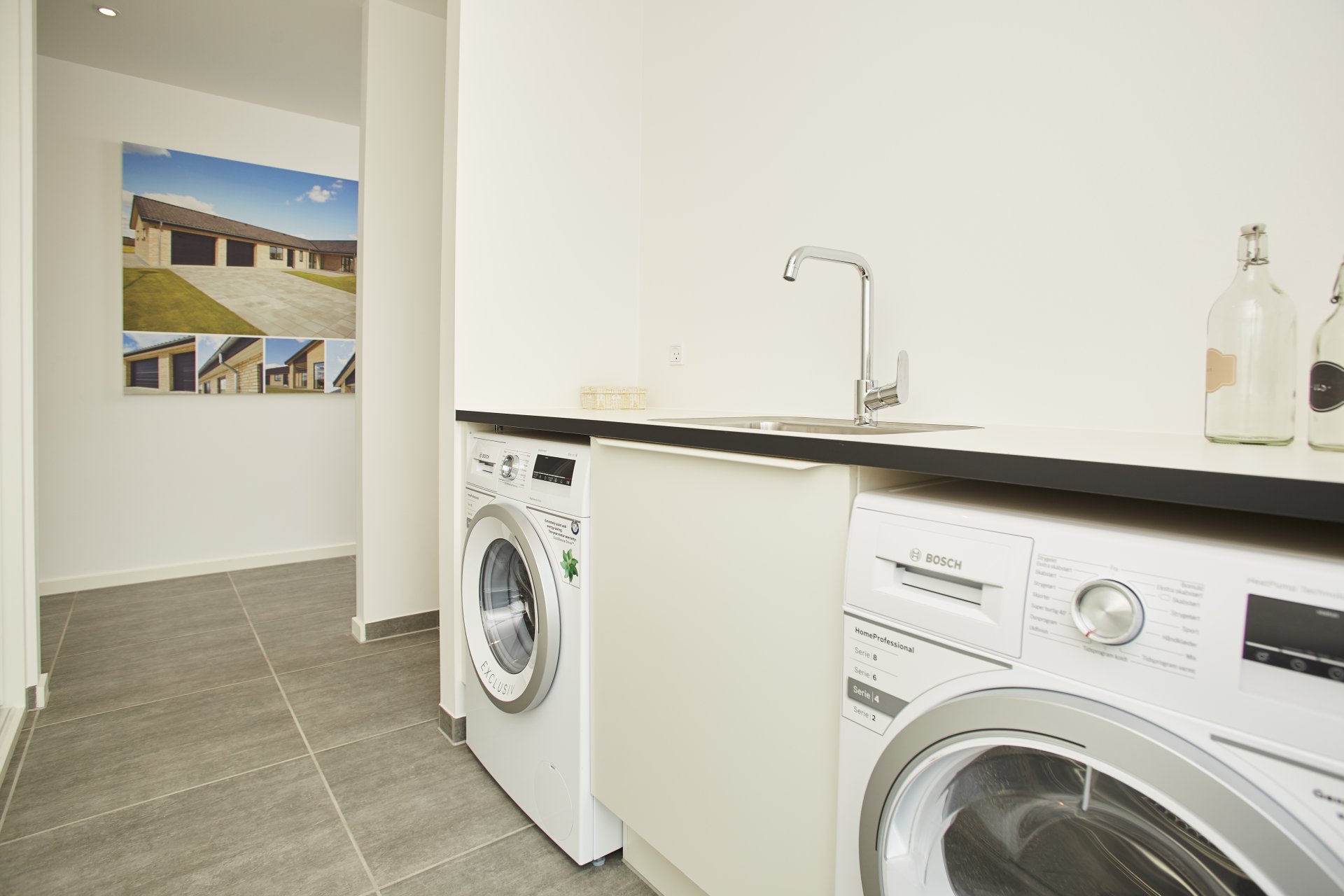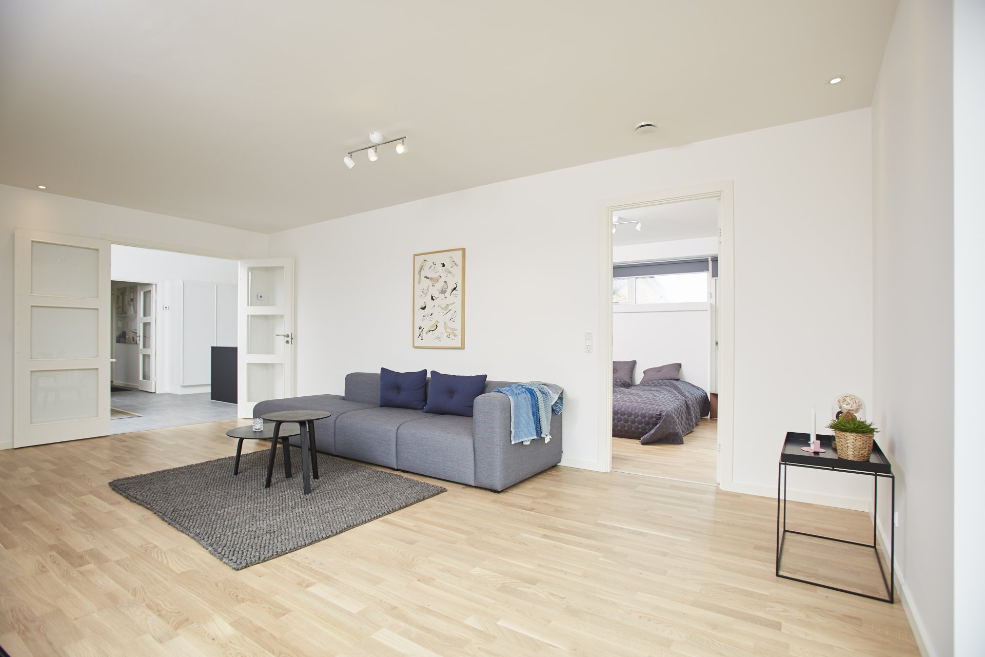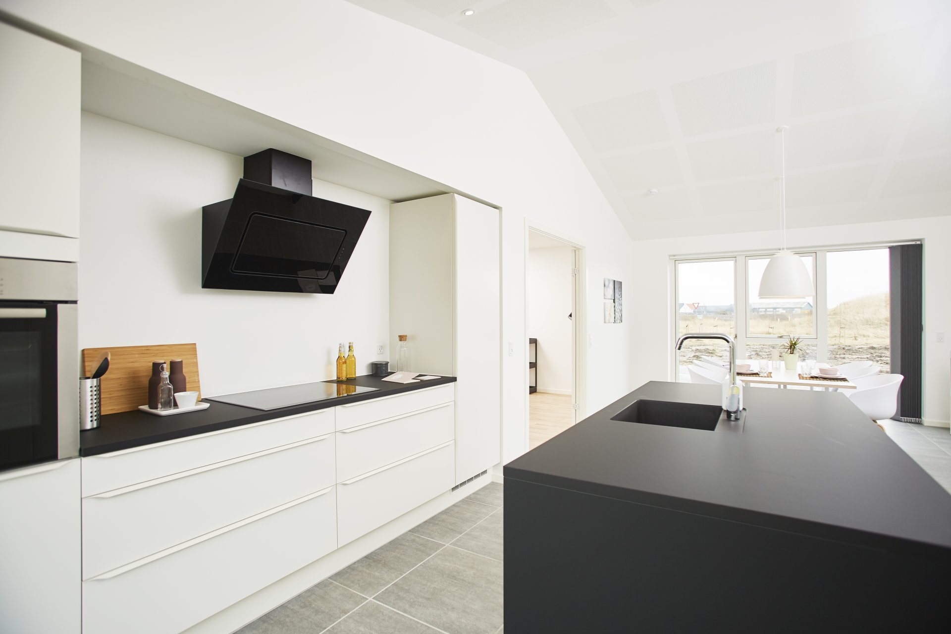 Forbundet entré og bryggers, vindueskarme samt skråloft med akustikplader.