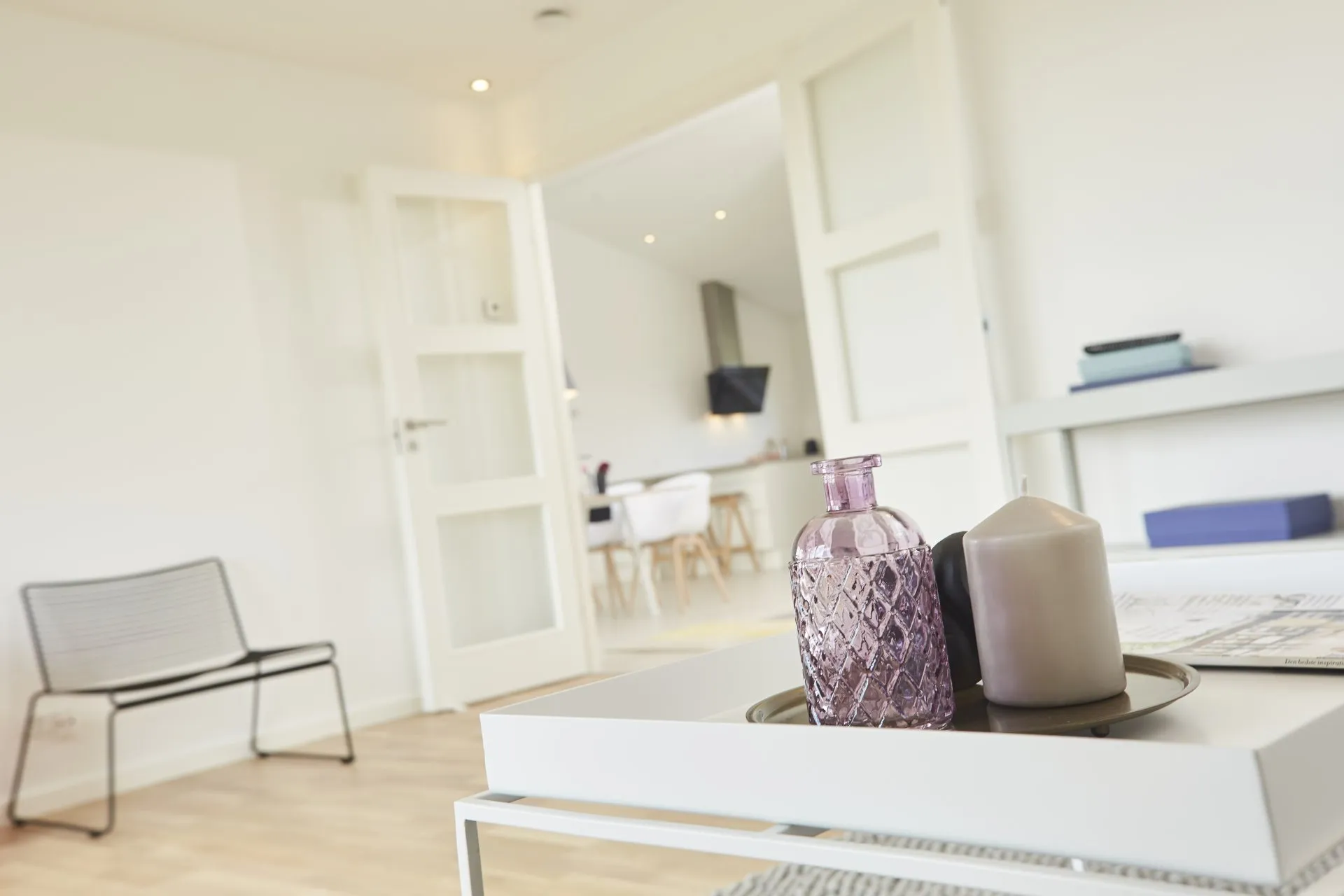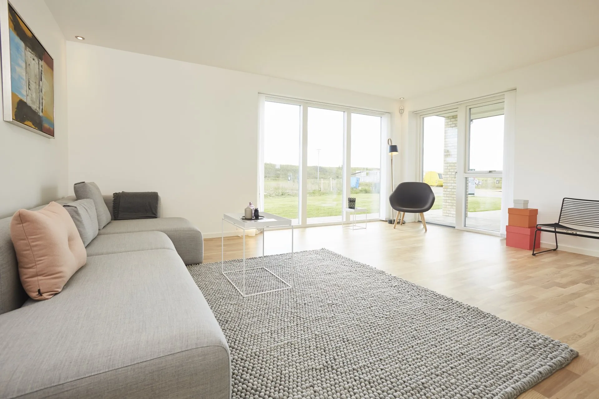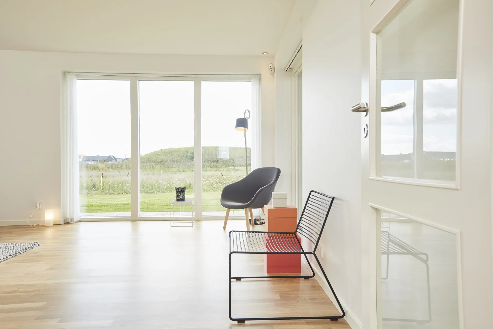 Eksklusivt walk-in, lyse materialer, dobbelte franske døre, indbyggede køkkenskabe og skjult viktualierum i køkken.