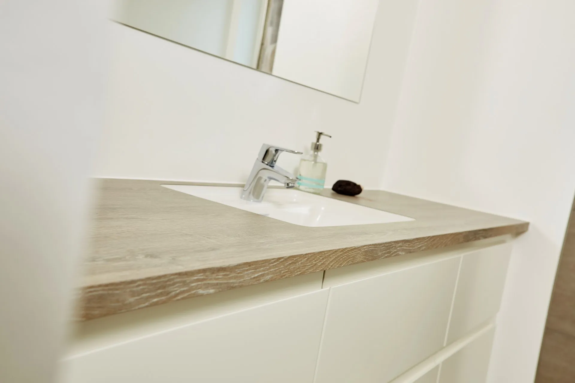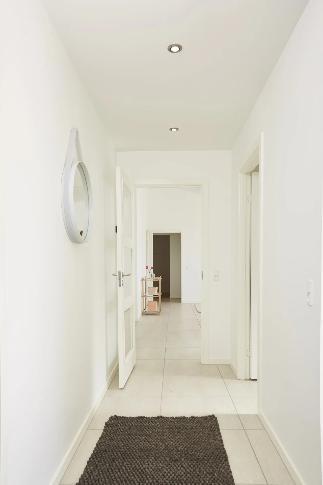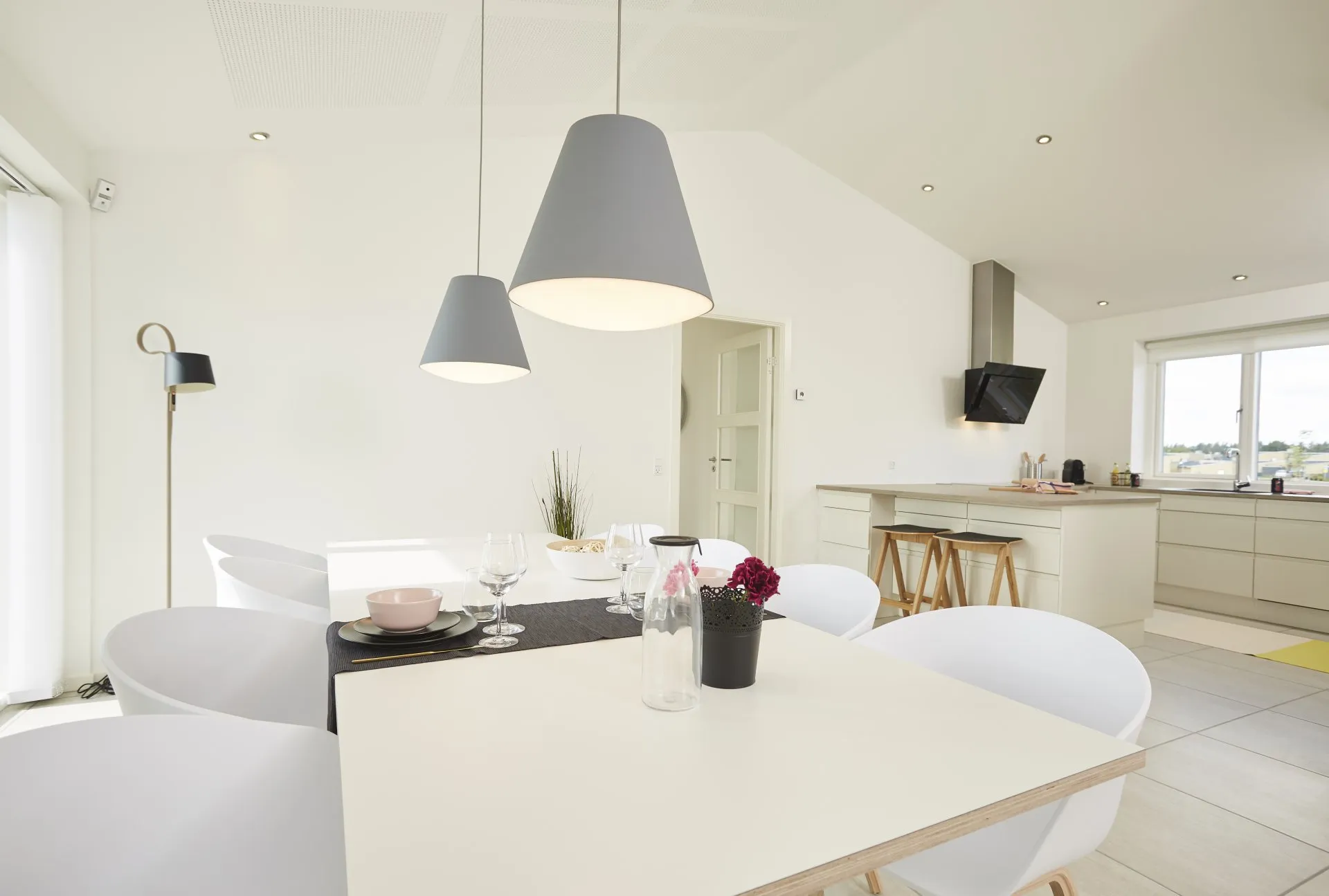Eksklusivt walk-in, lyse materialer, dobbelte franske døre, indbyggede køkkenskabe og skjult viktualierum i køkken.