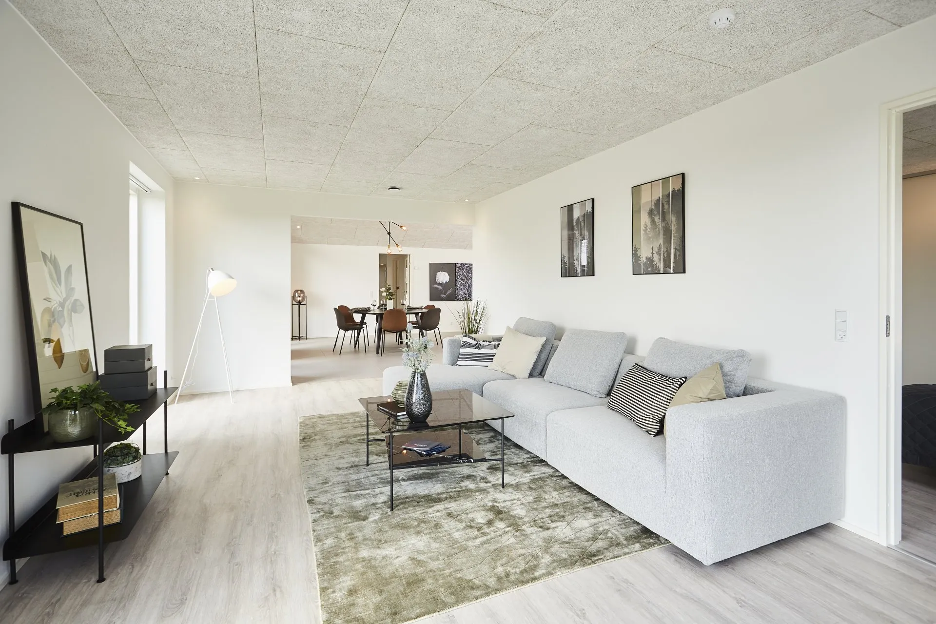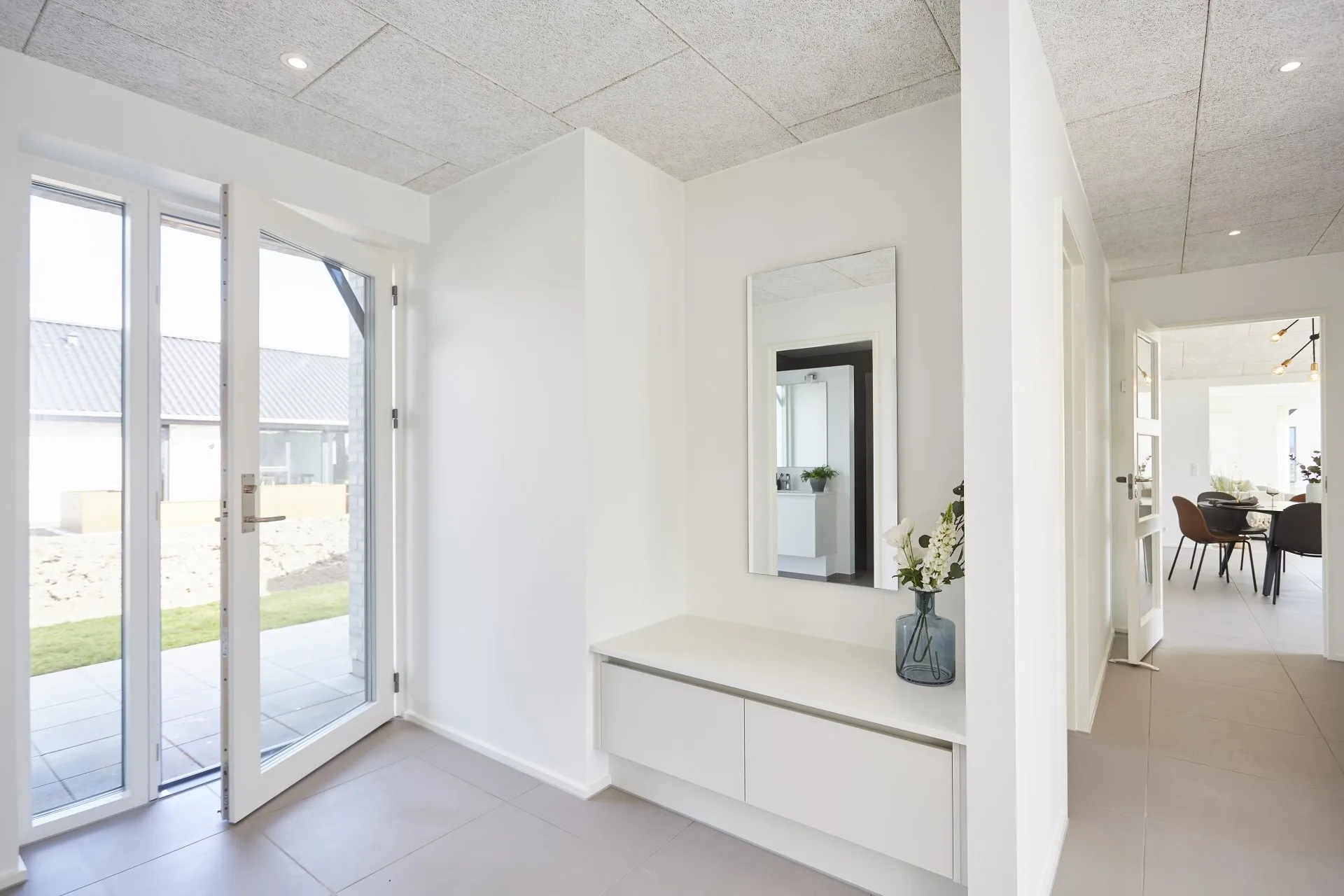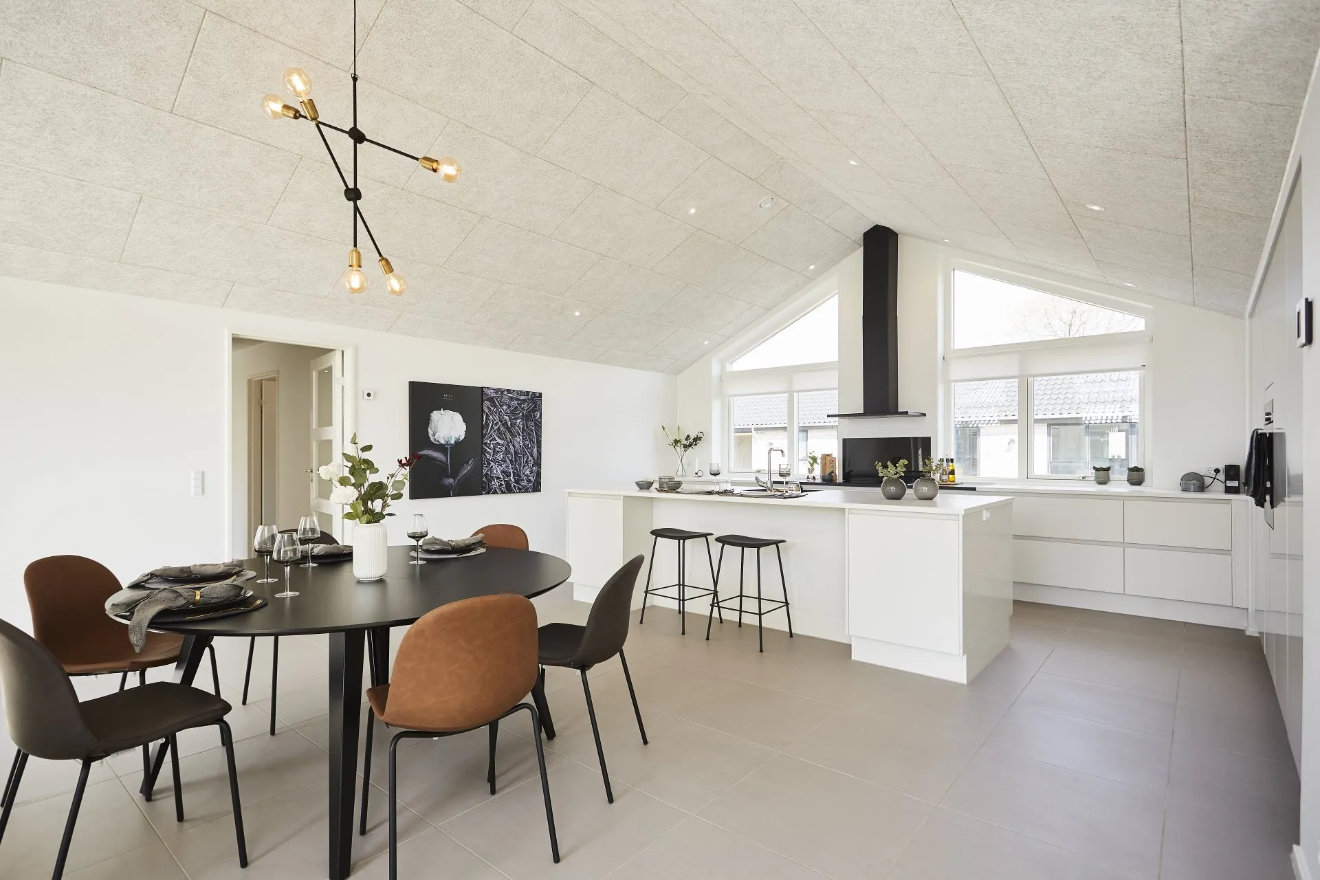Bænk i entré samt stort og lyst køkken/alrum med loft til kip.