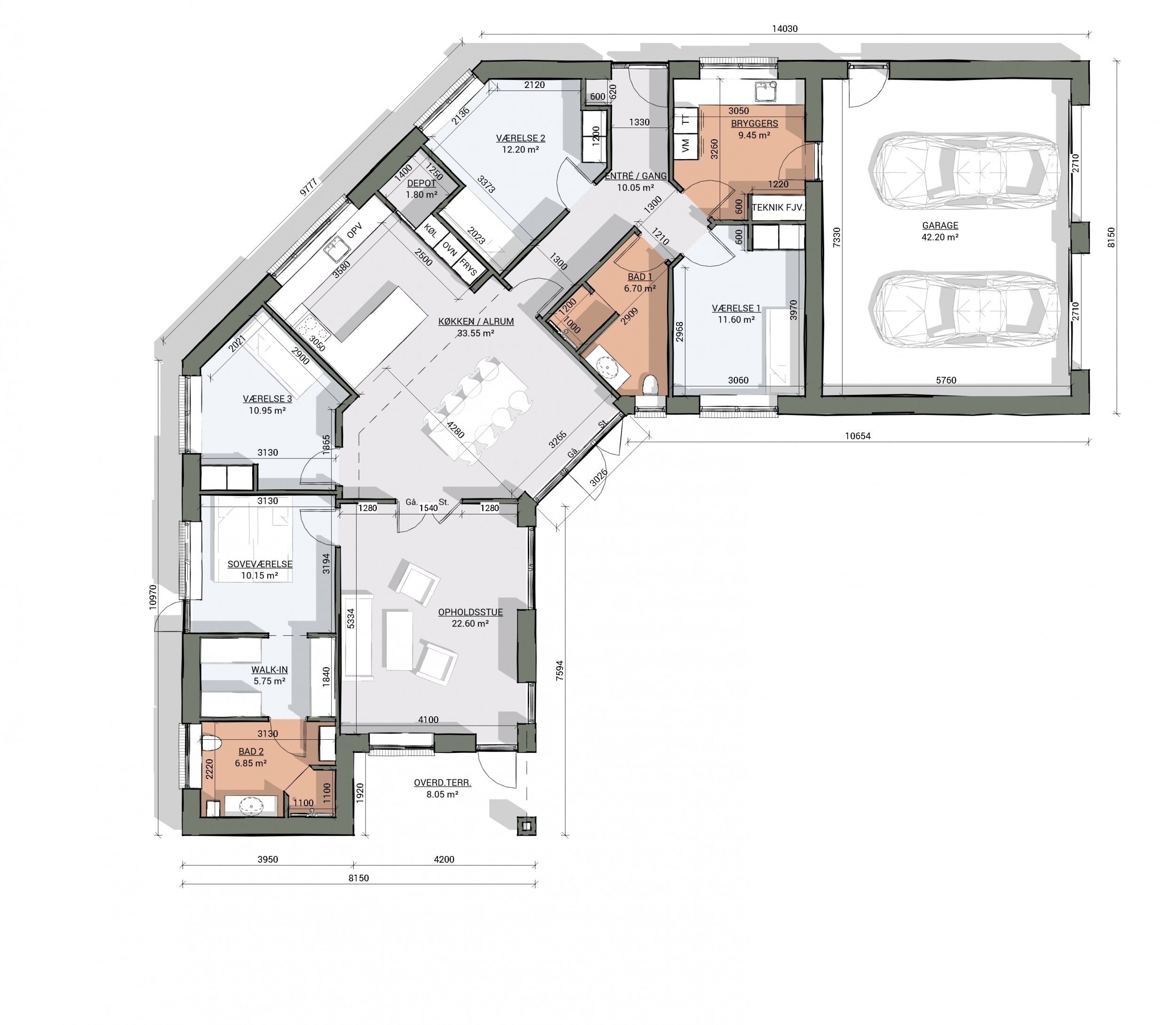 Bolig: 170 m2. Garage: 50 m2.