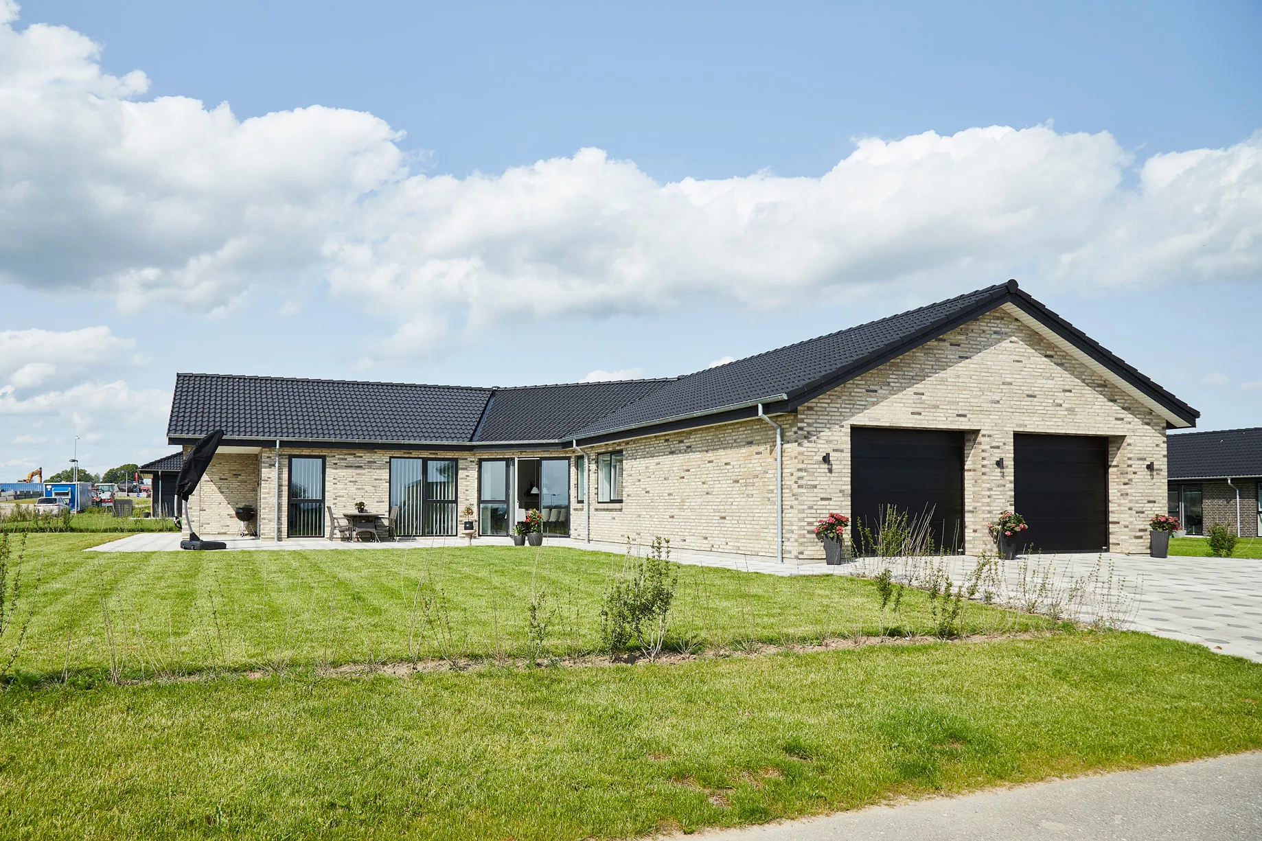 Integreret garage, skråloft og karakteristisk knækhus-arkitektur.