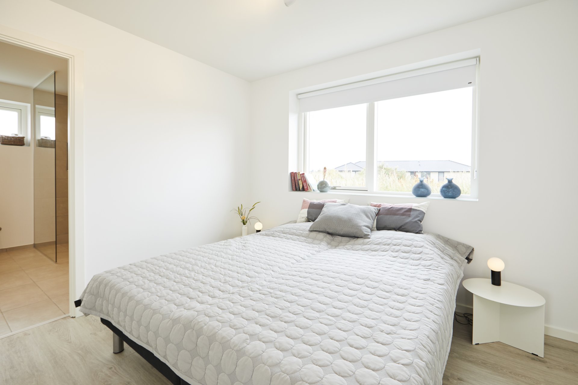 Hall med stort vinduesparti, indvendig murstensvæg og bruseniche af glas.