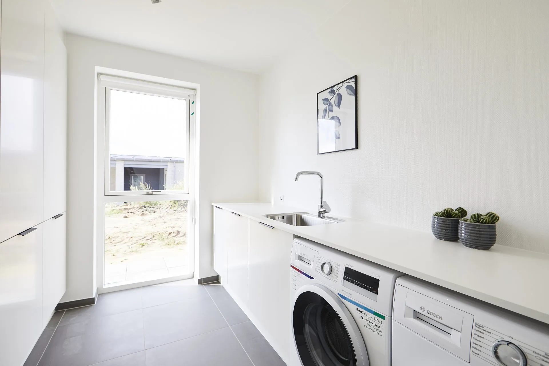 Ovenlysvinduer, indbyggede shambpoohylder samt køkken/alrum og stue i åben forbindelse.