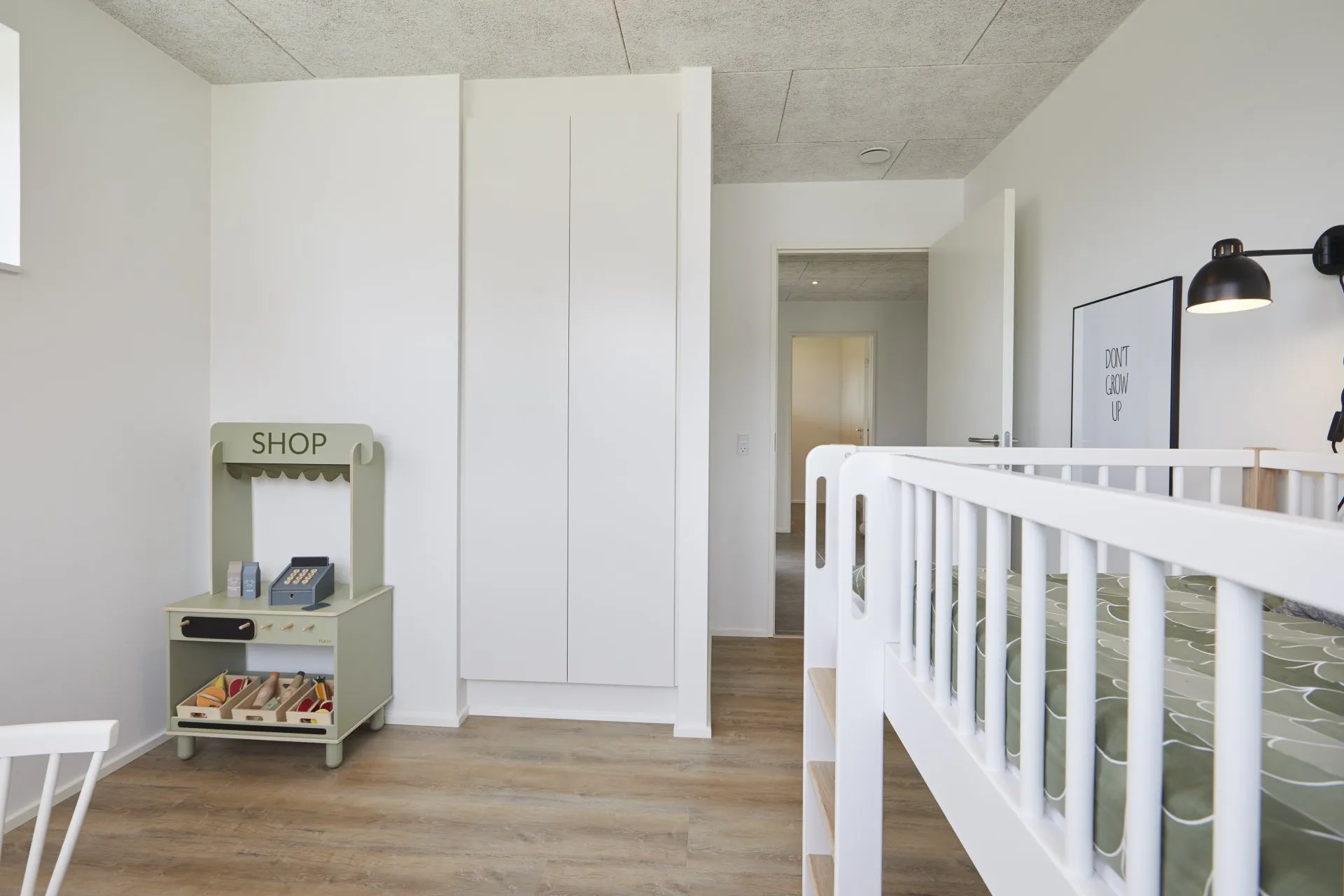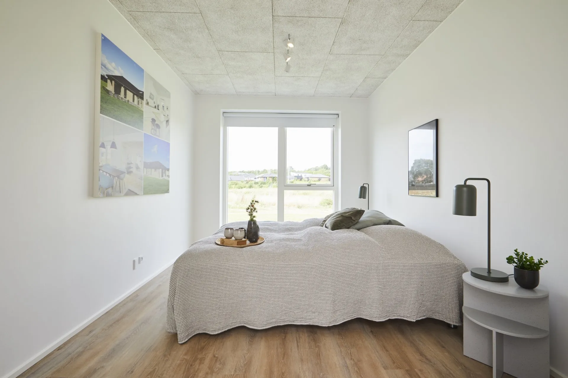 Troldtektslofter, stor overdækket terrasse og helvægsvinduer i soveværelset.