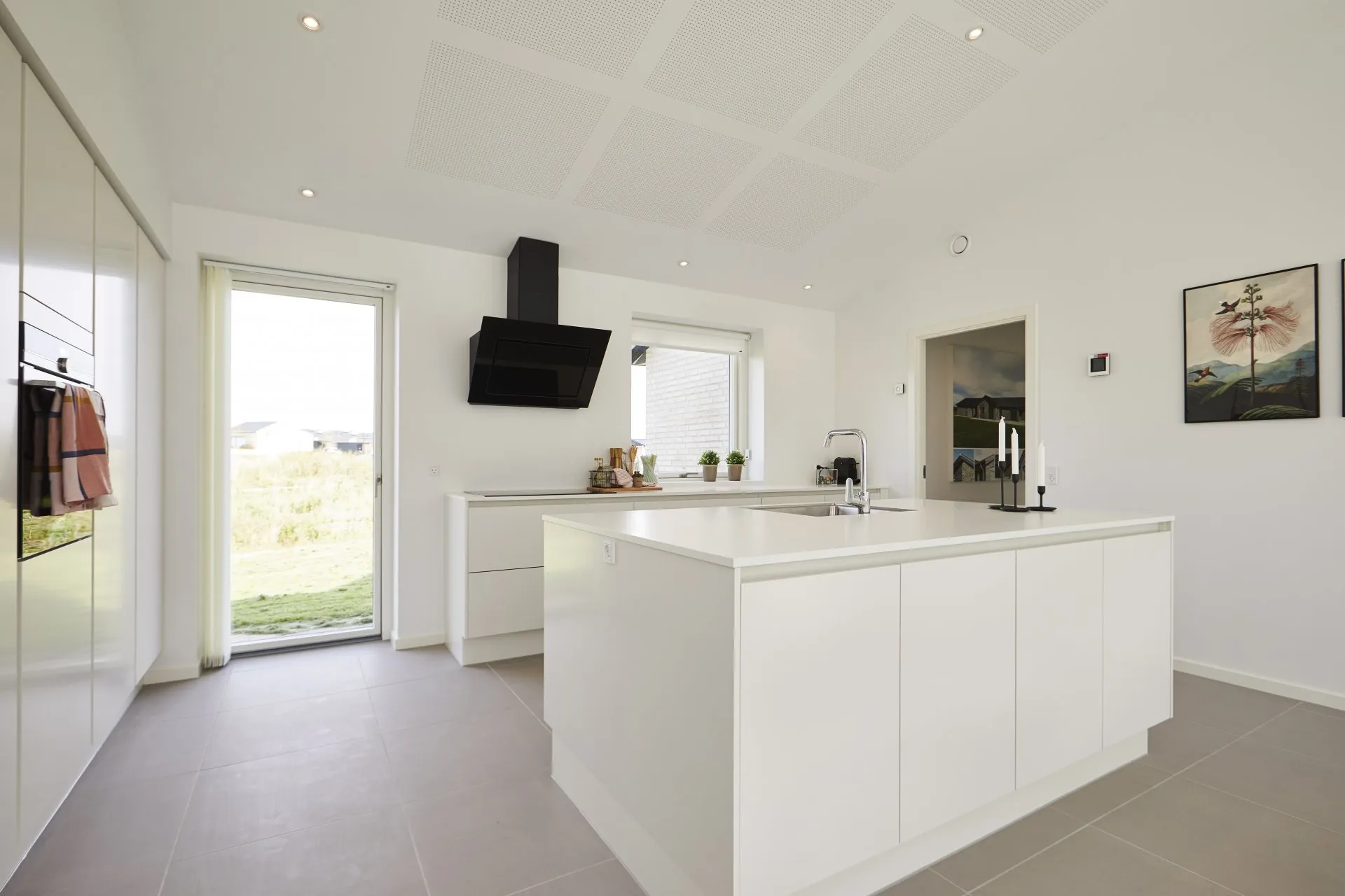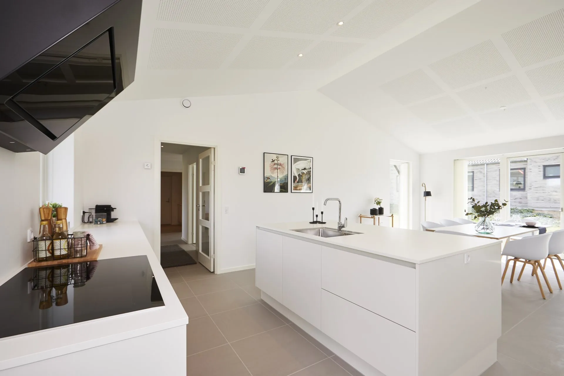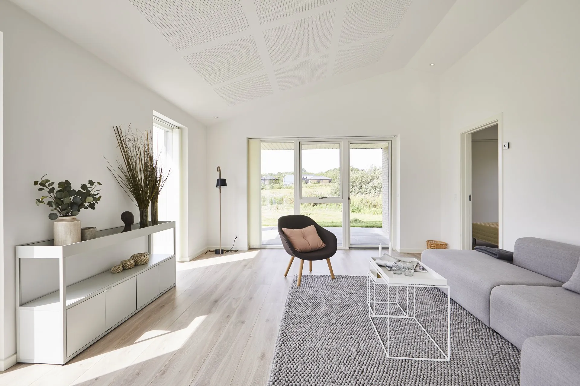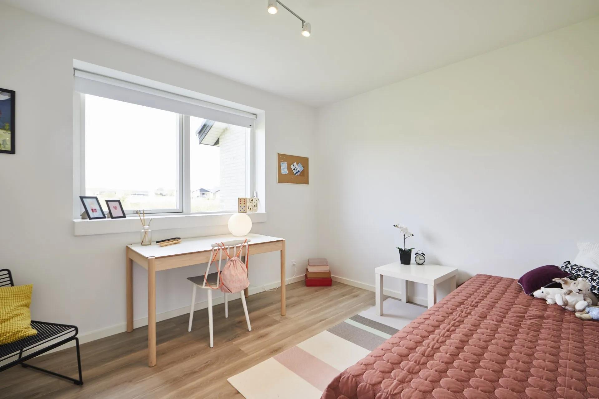 15° dobbeltsidet skråloft, gipdloft med akustikfelter og indbyggede skabe.