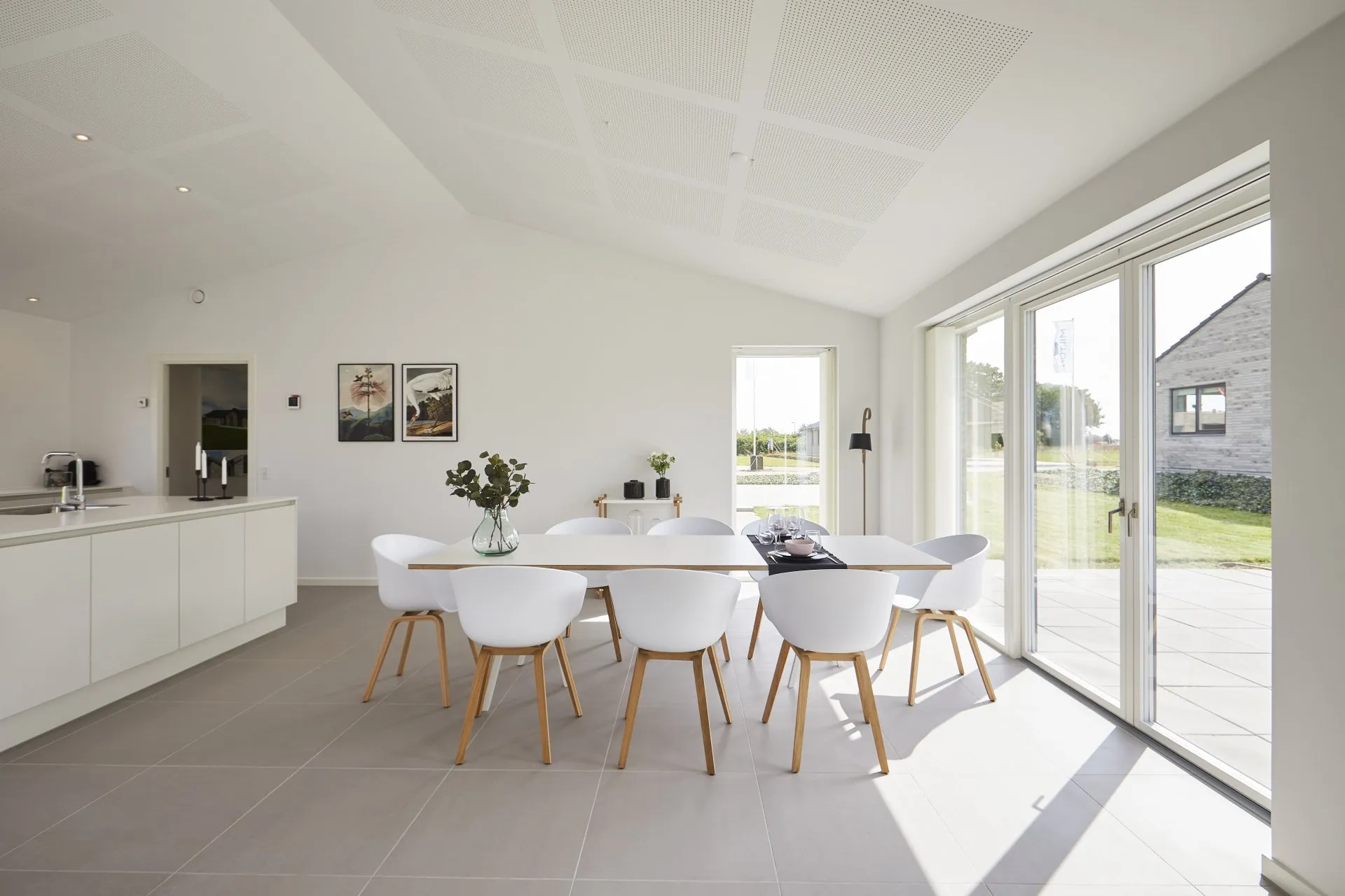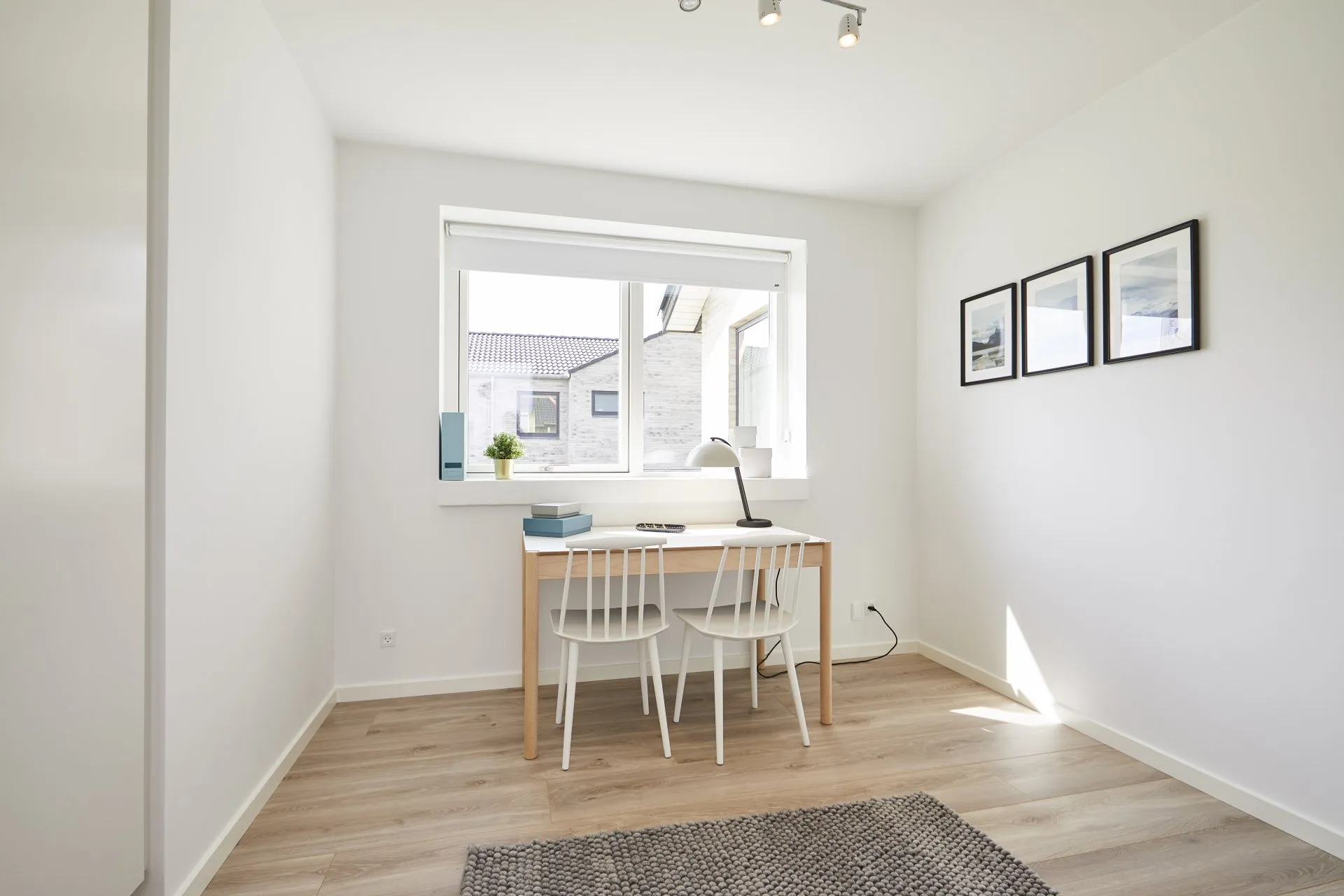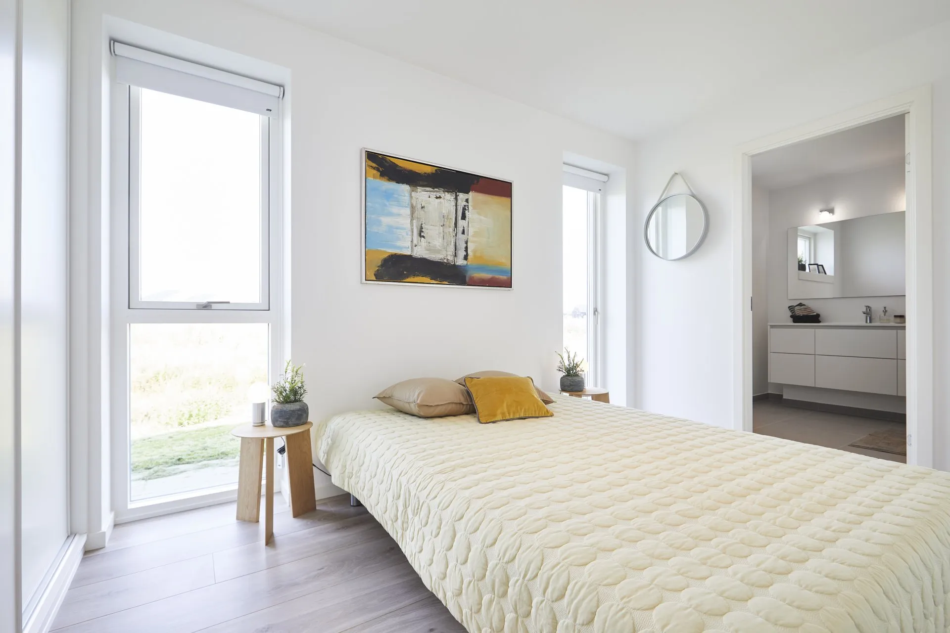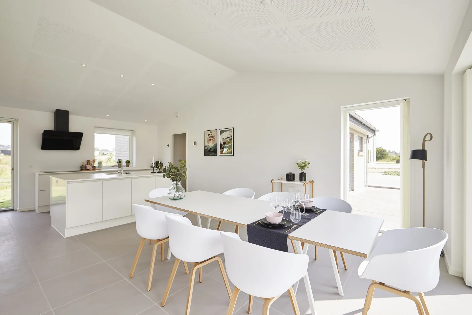 15° dobbeltsidet skråloft, gipdloft med akustikfelter og indbyggede skabe.