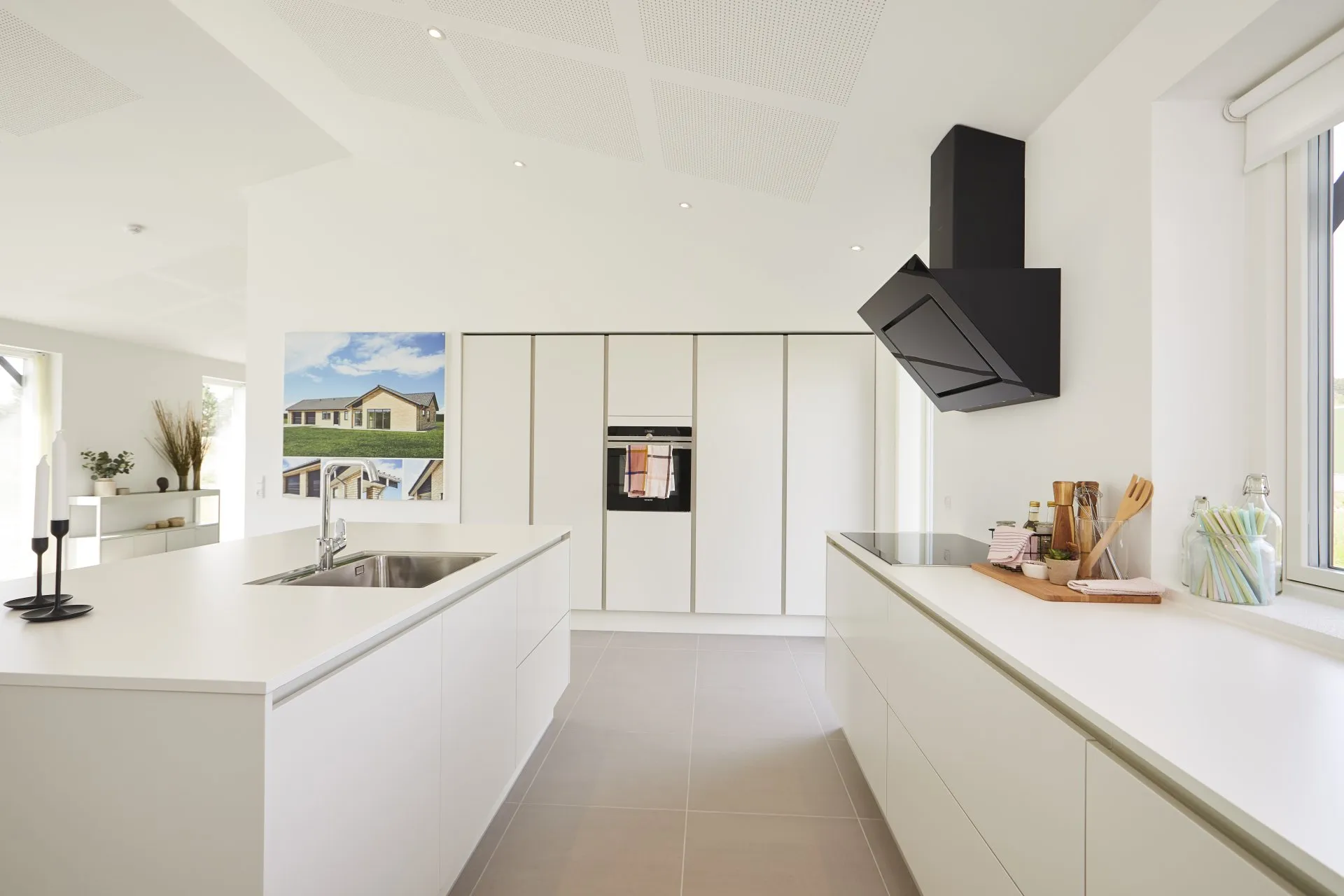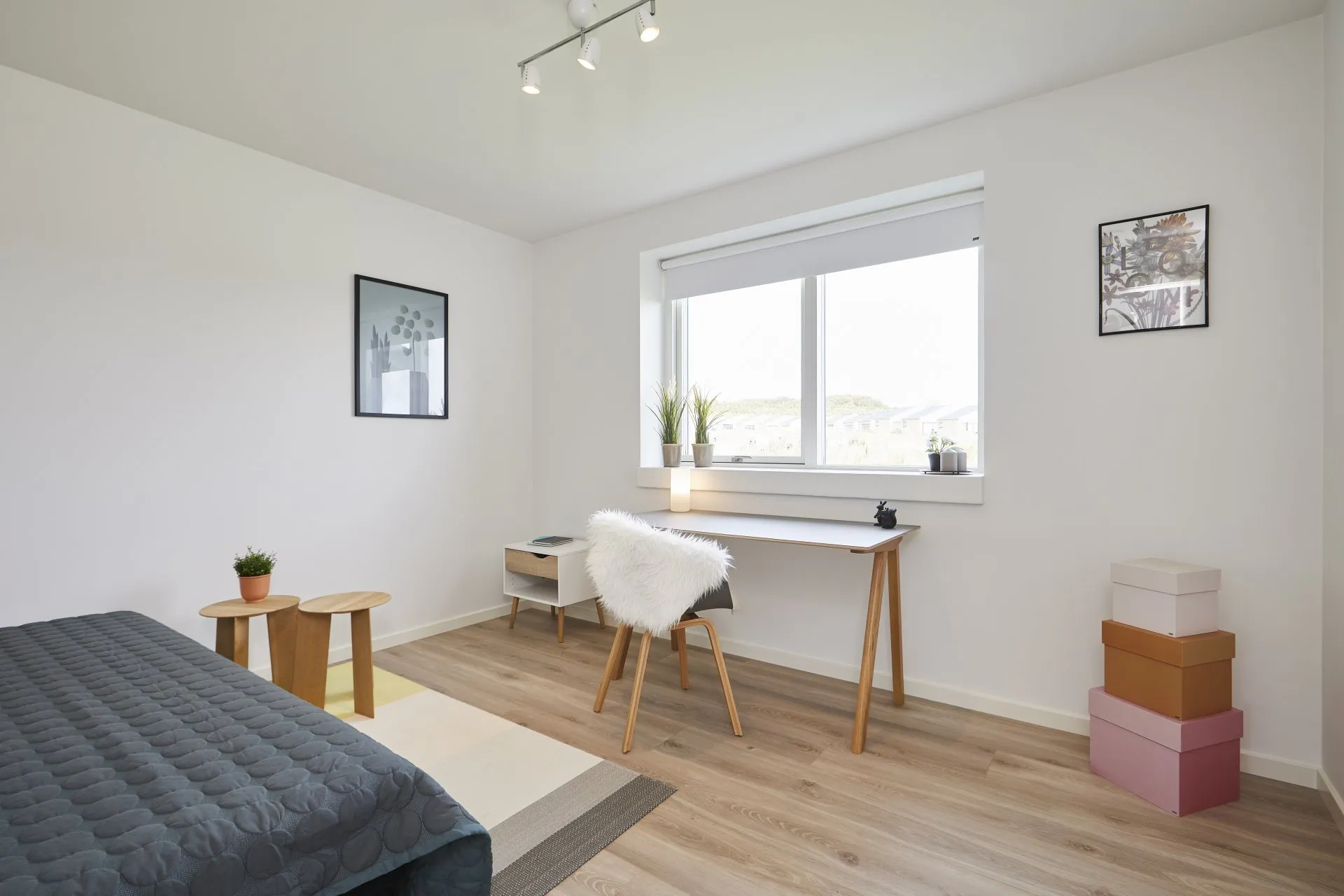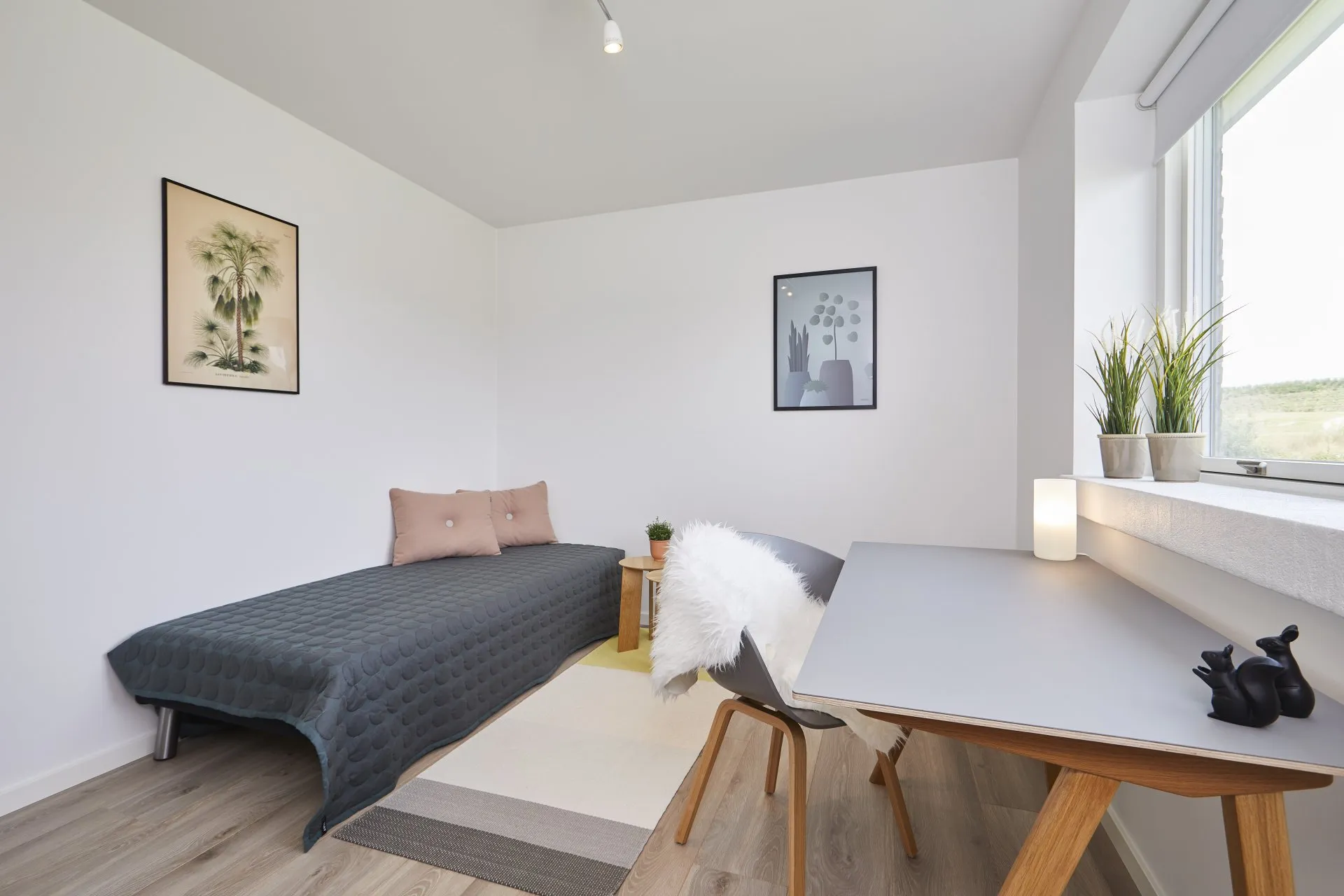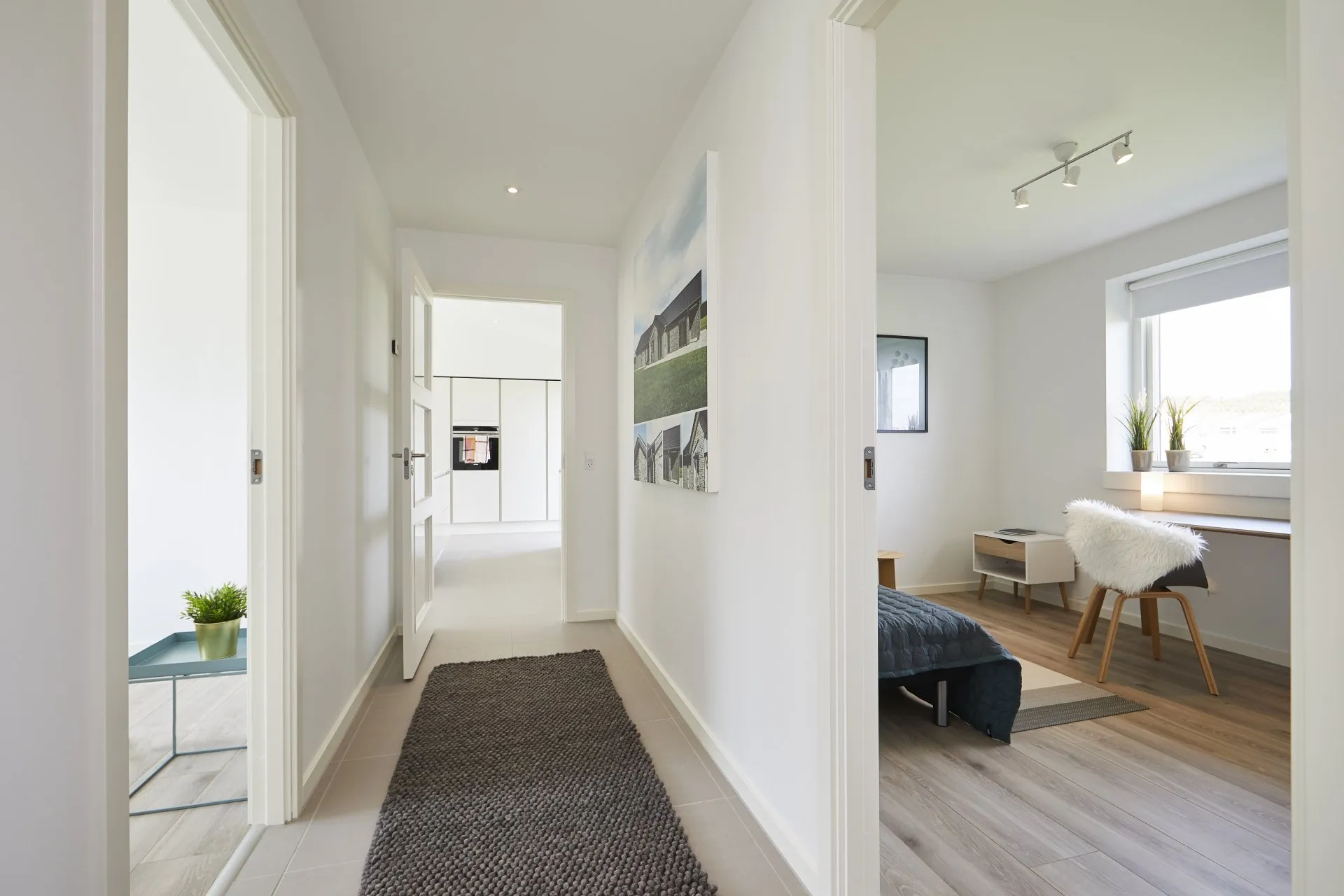 15° dobbeltsidet skråloft, gipdloft med akustikfelter og indbyggede skabe.