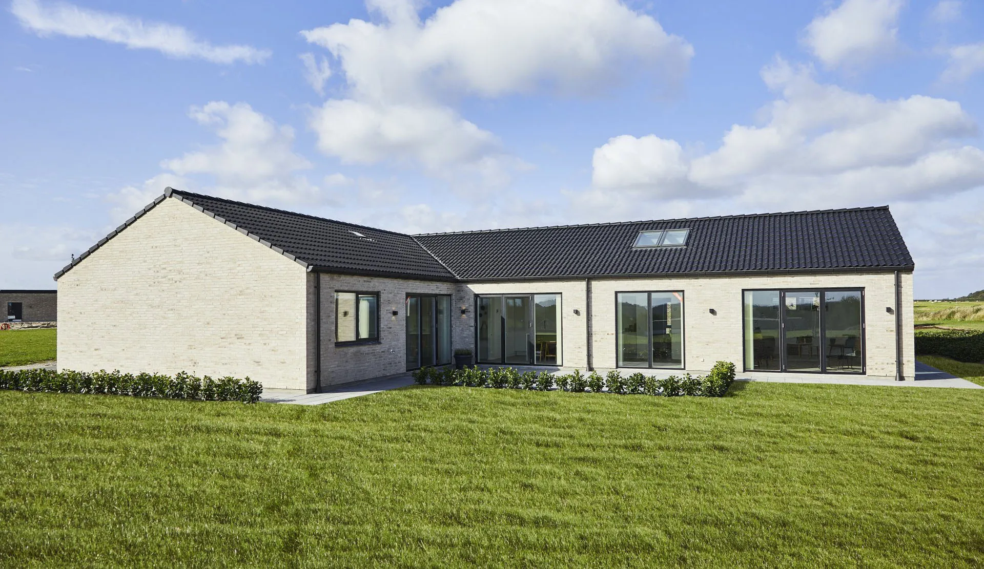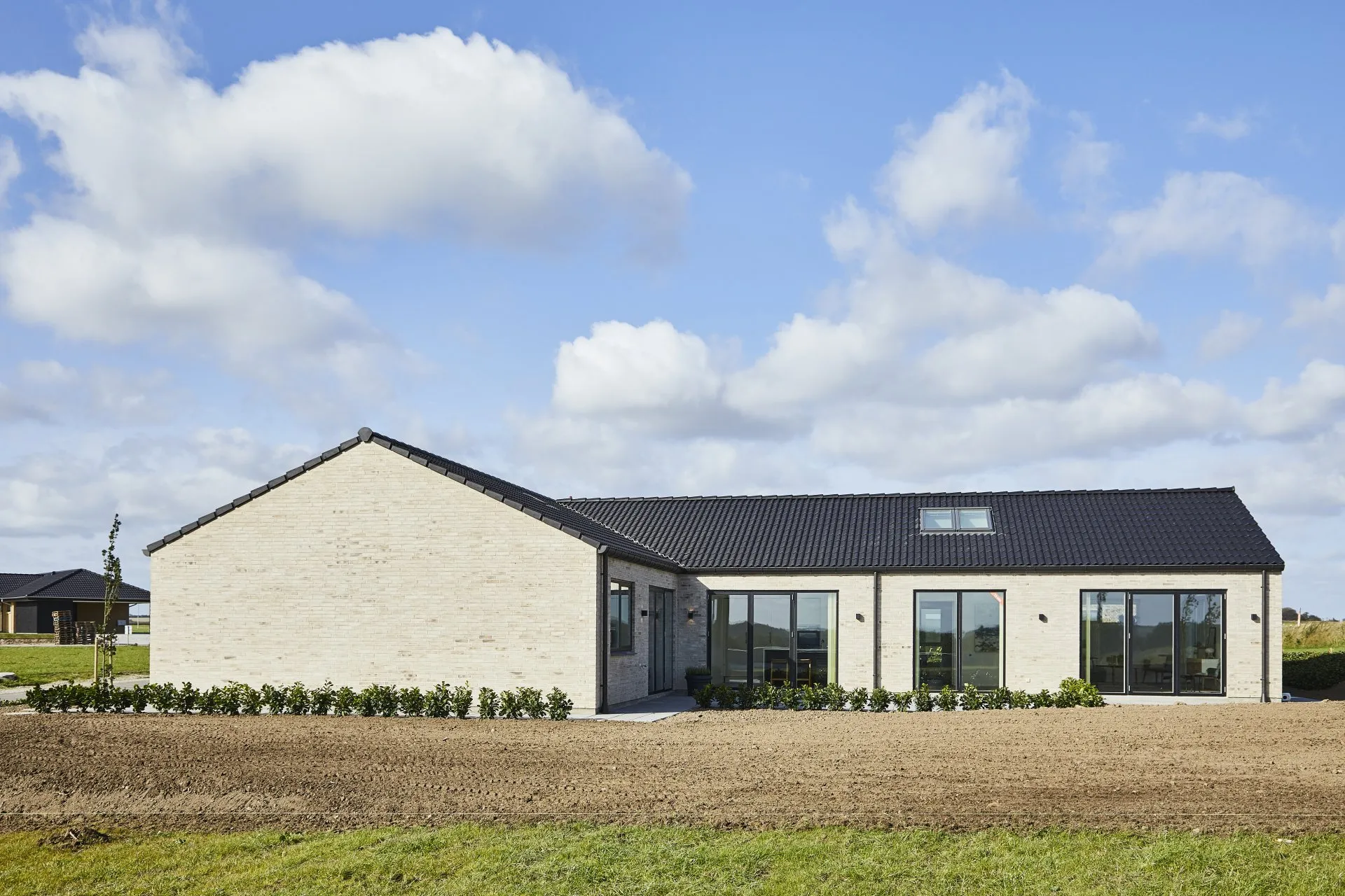 Vinkelhus med opmurede gavle og saddeltag uden udhæng.