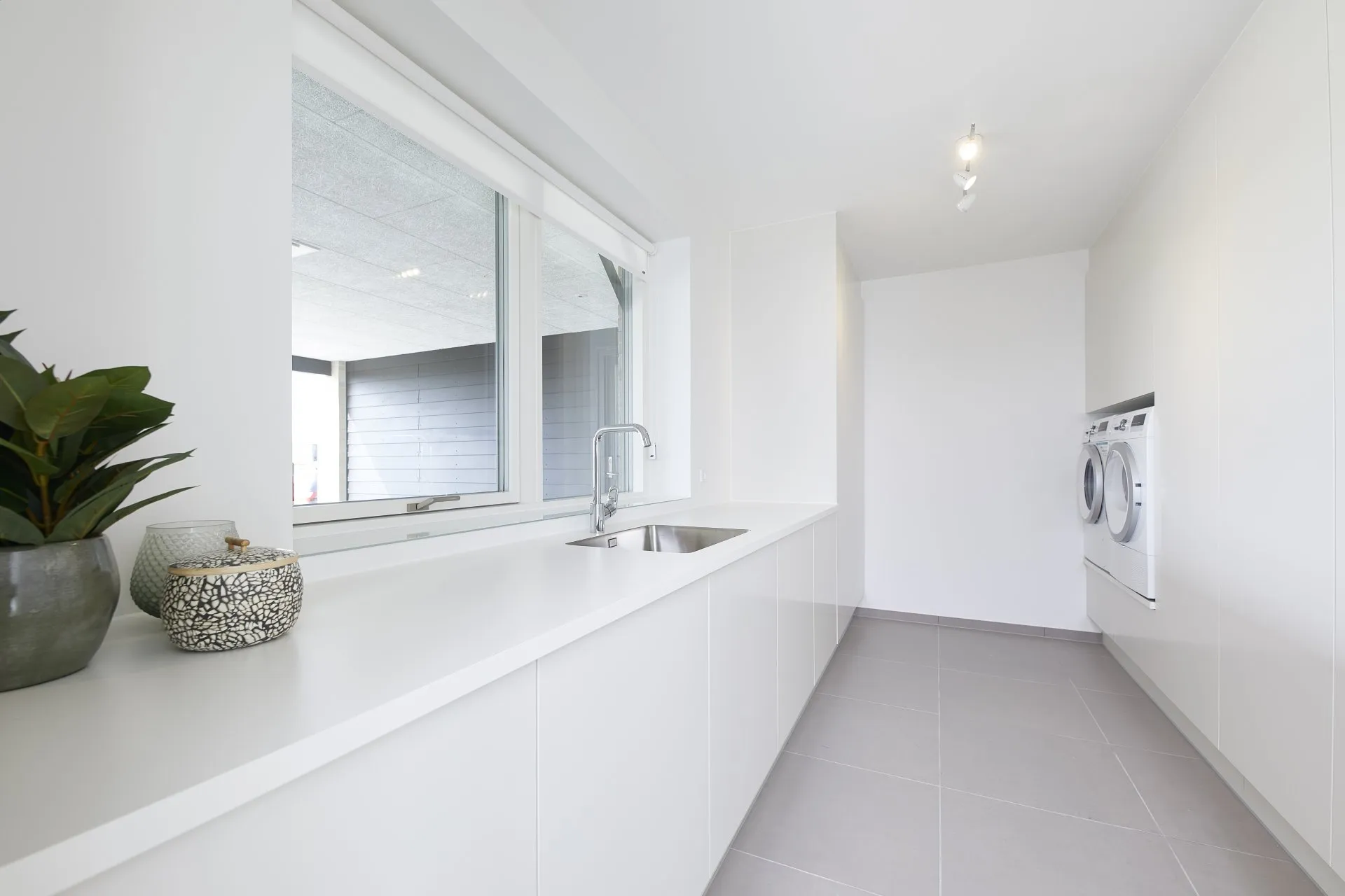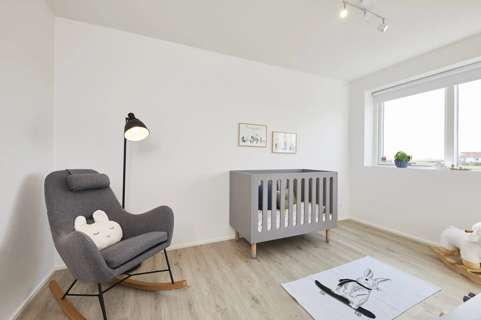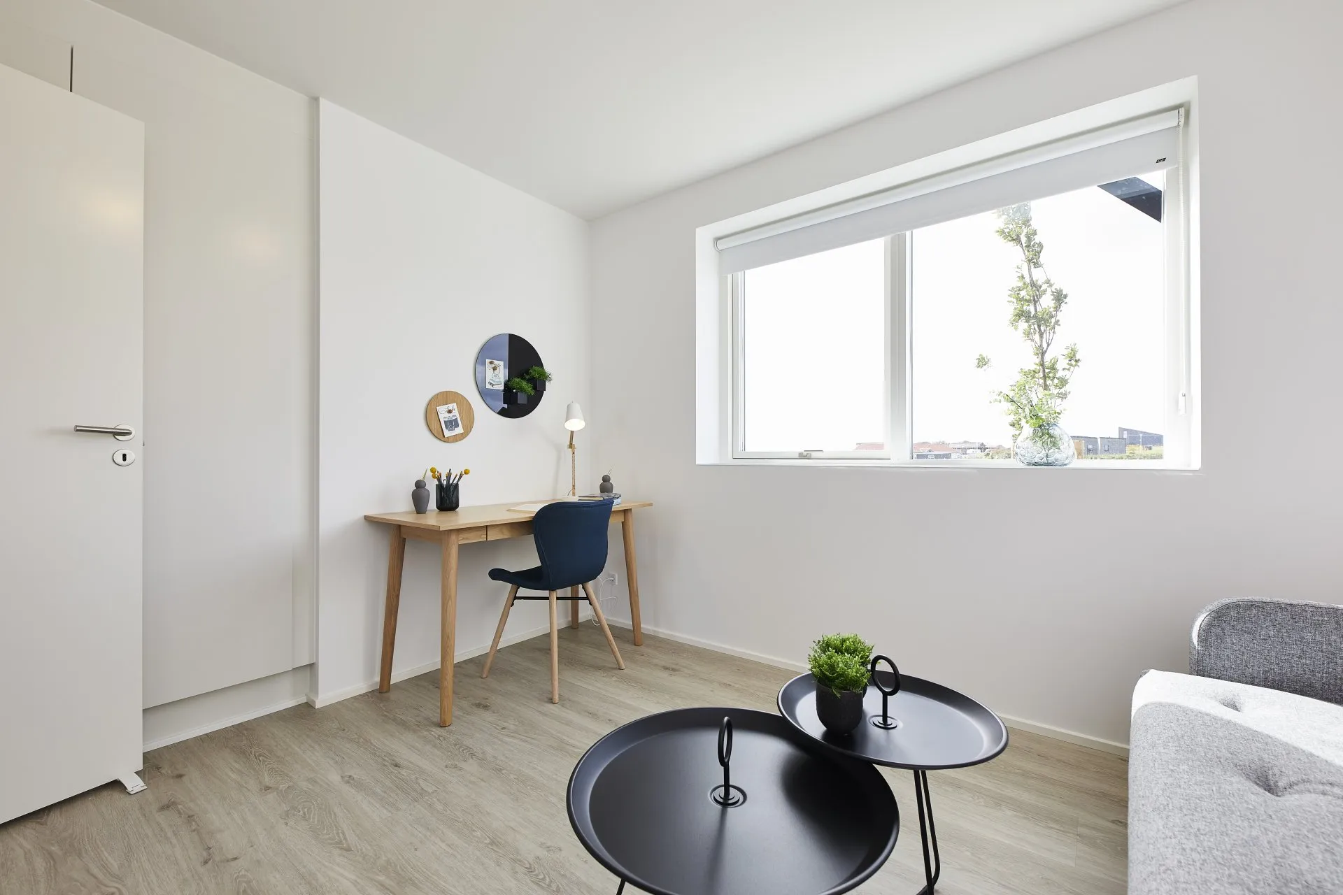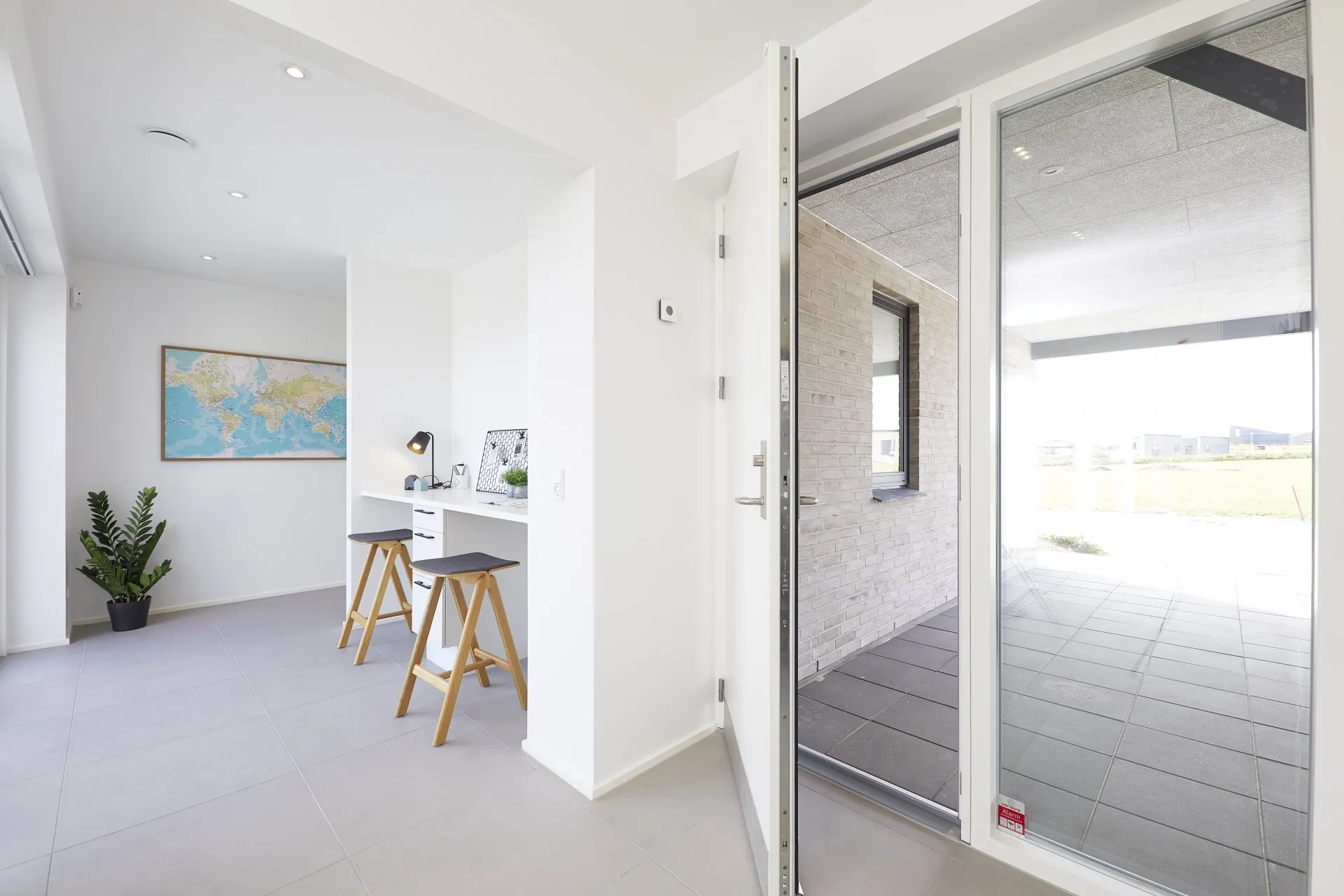 Lektieplads i multirum, ovenlysvindue og stor vinduesvæg.