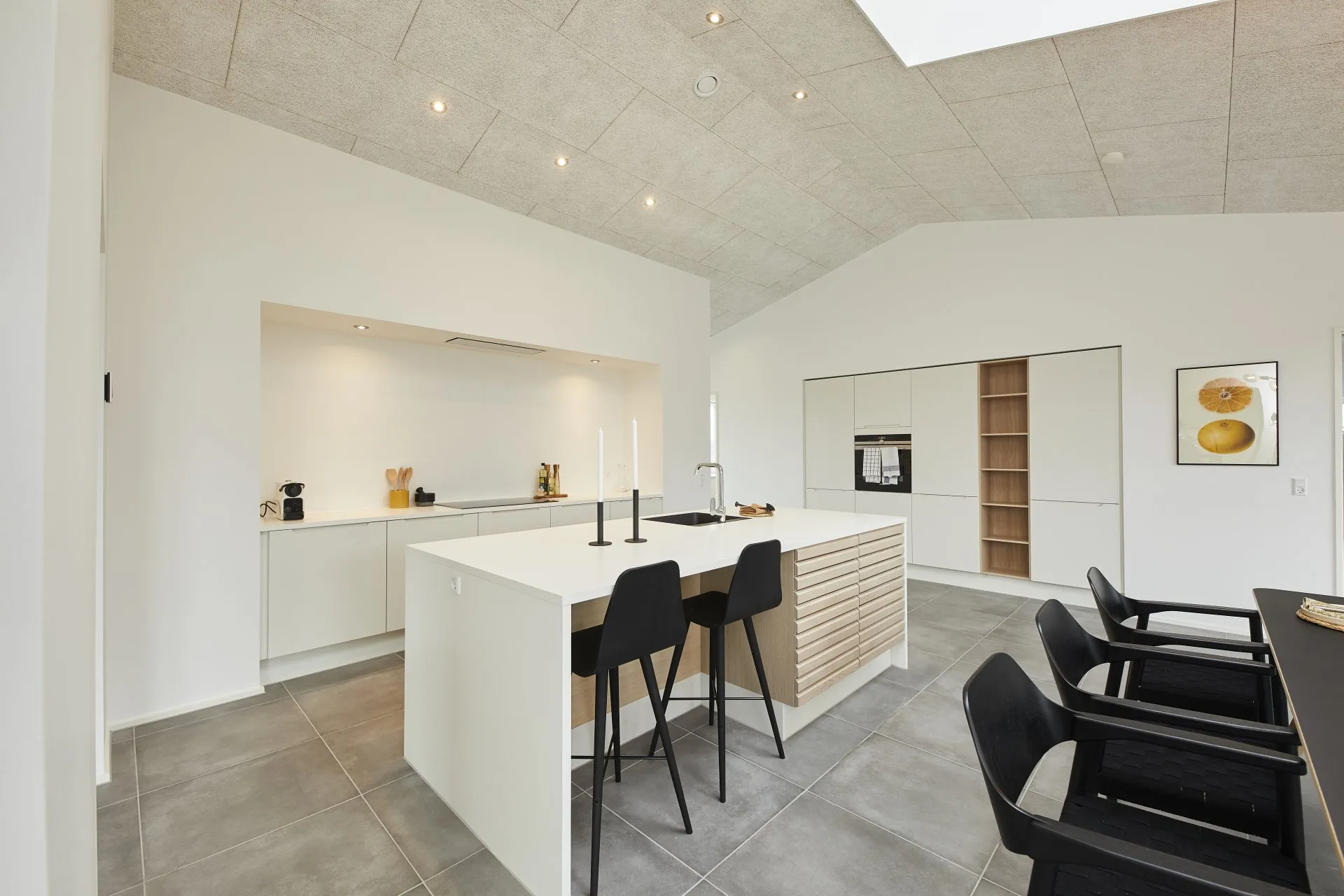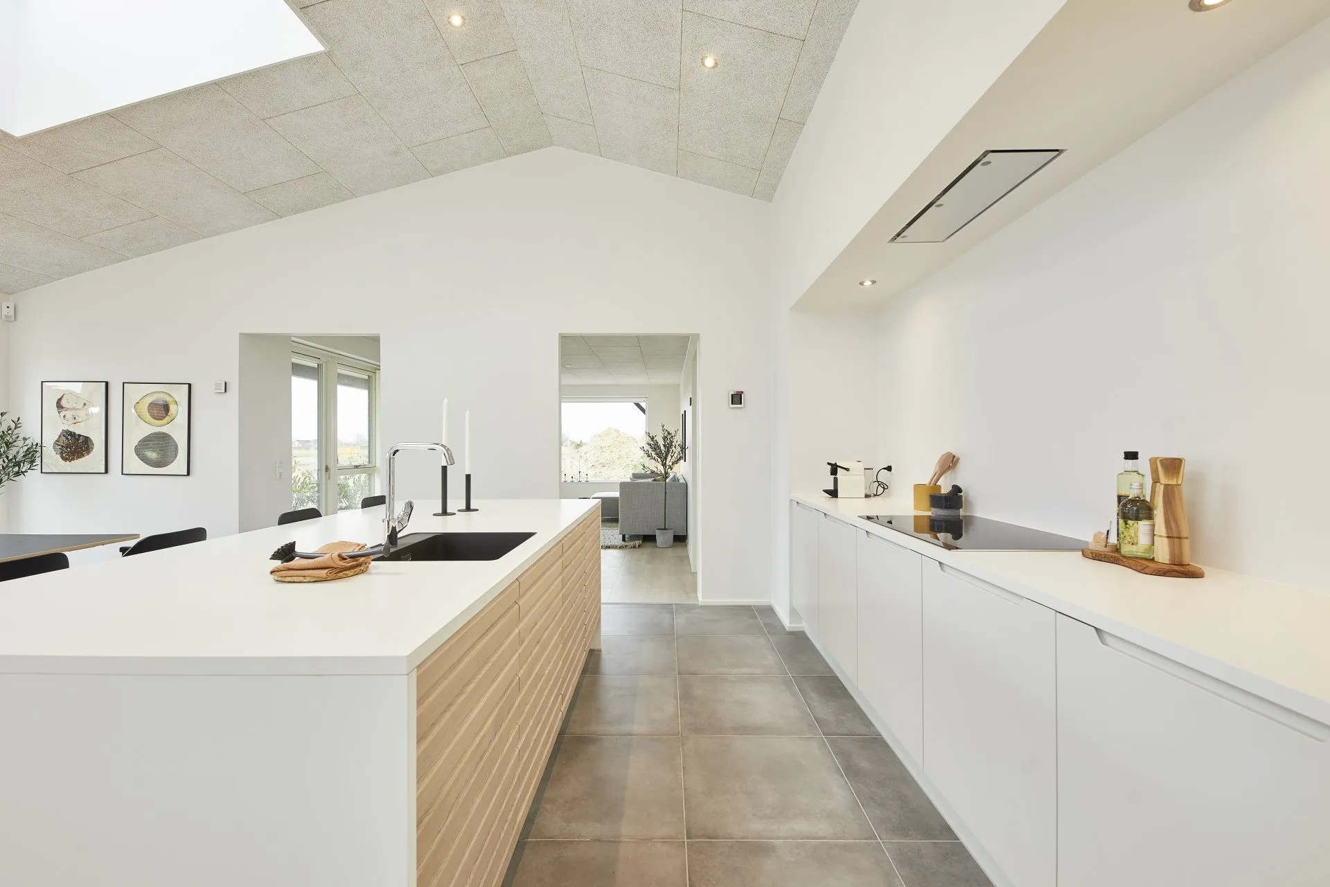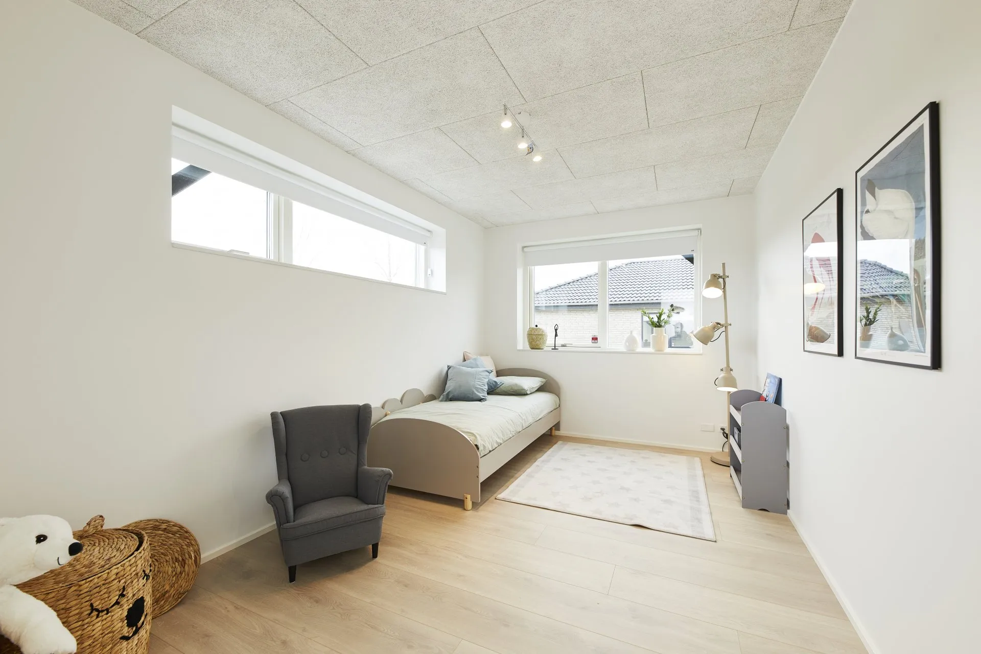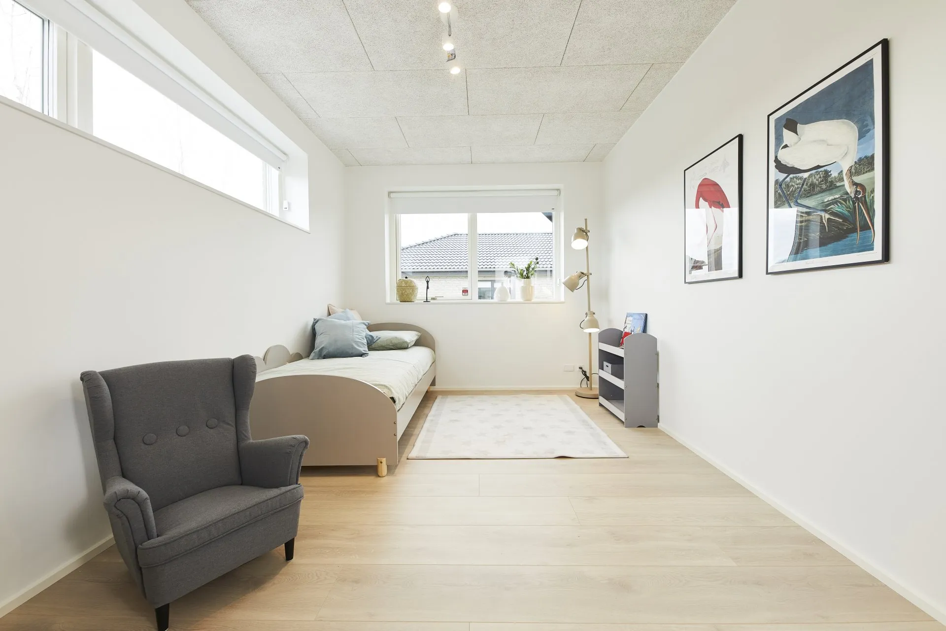 Børneadfeling med inbygget lektie-/gamerplads og køkken/alrum med to åbninger til stuen.