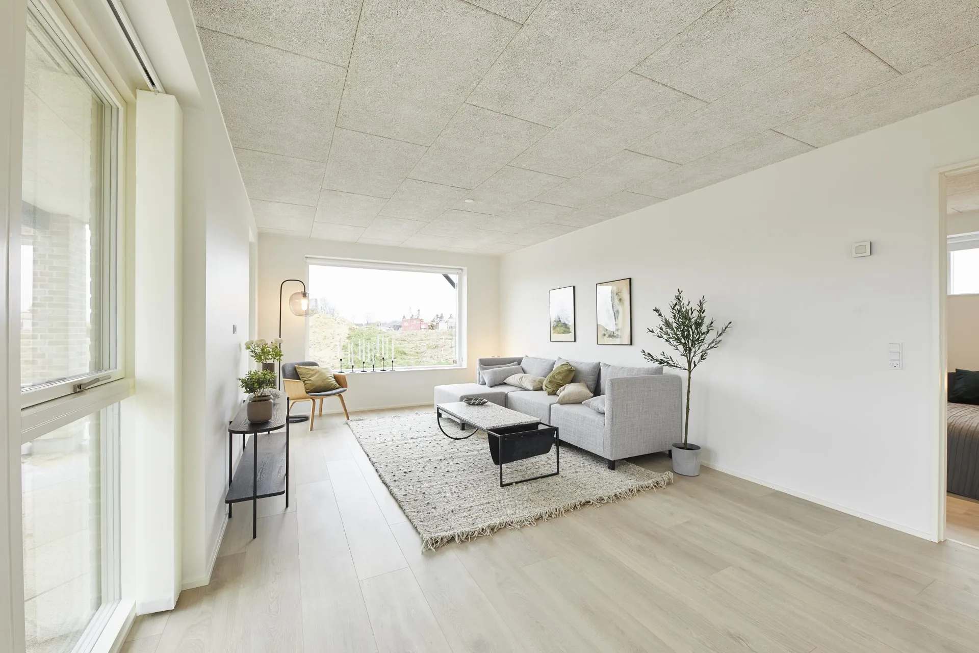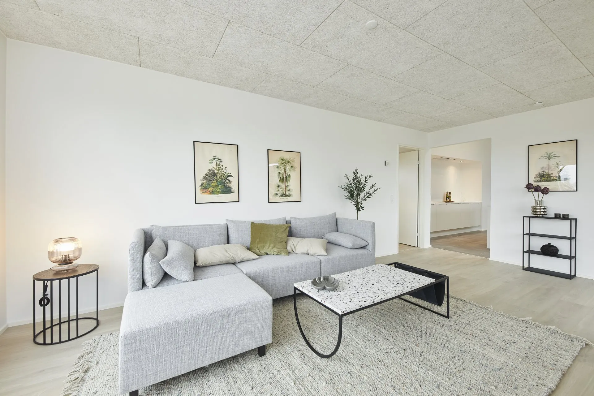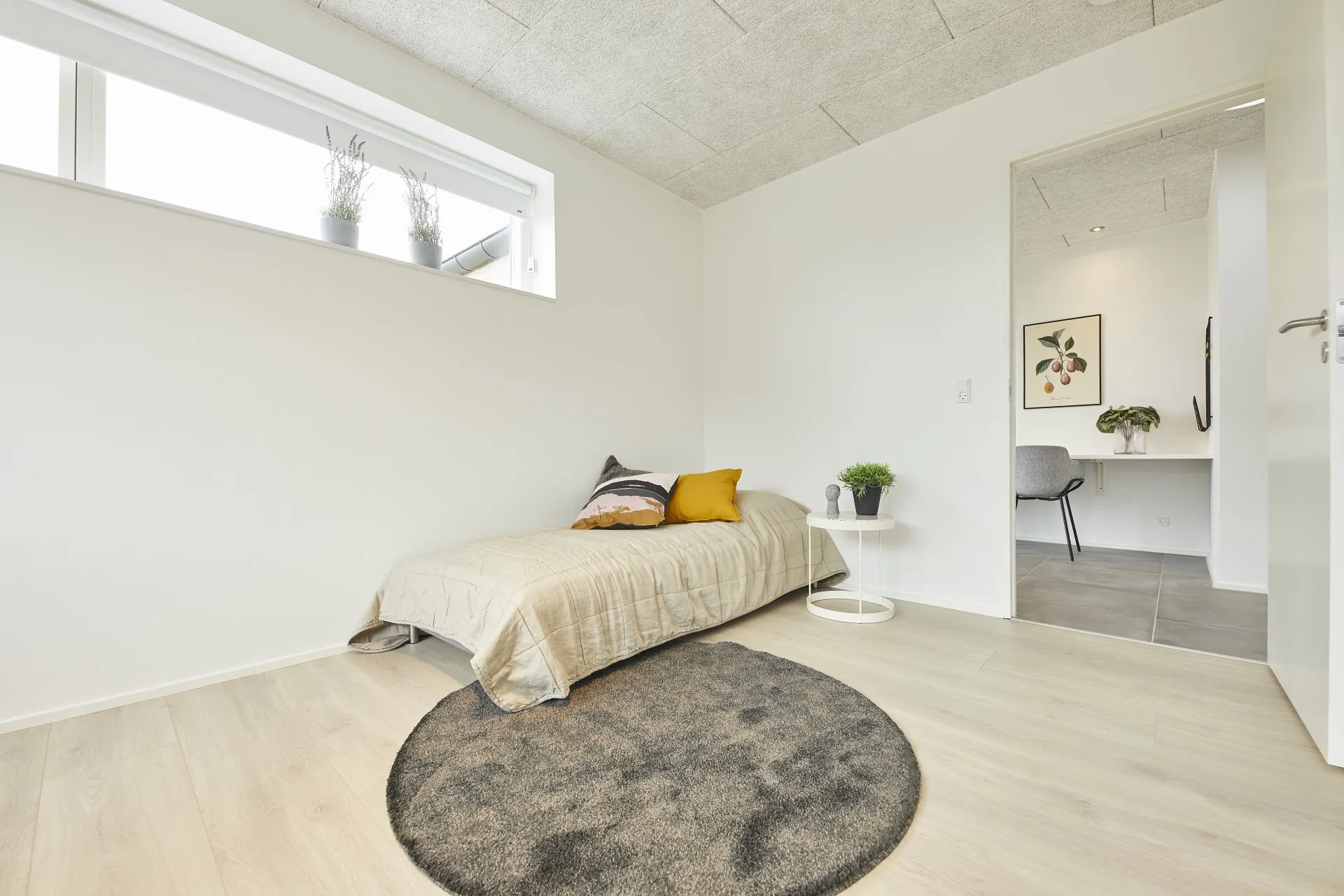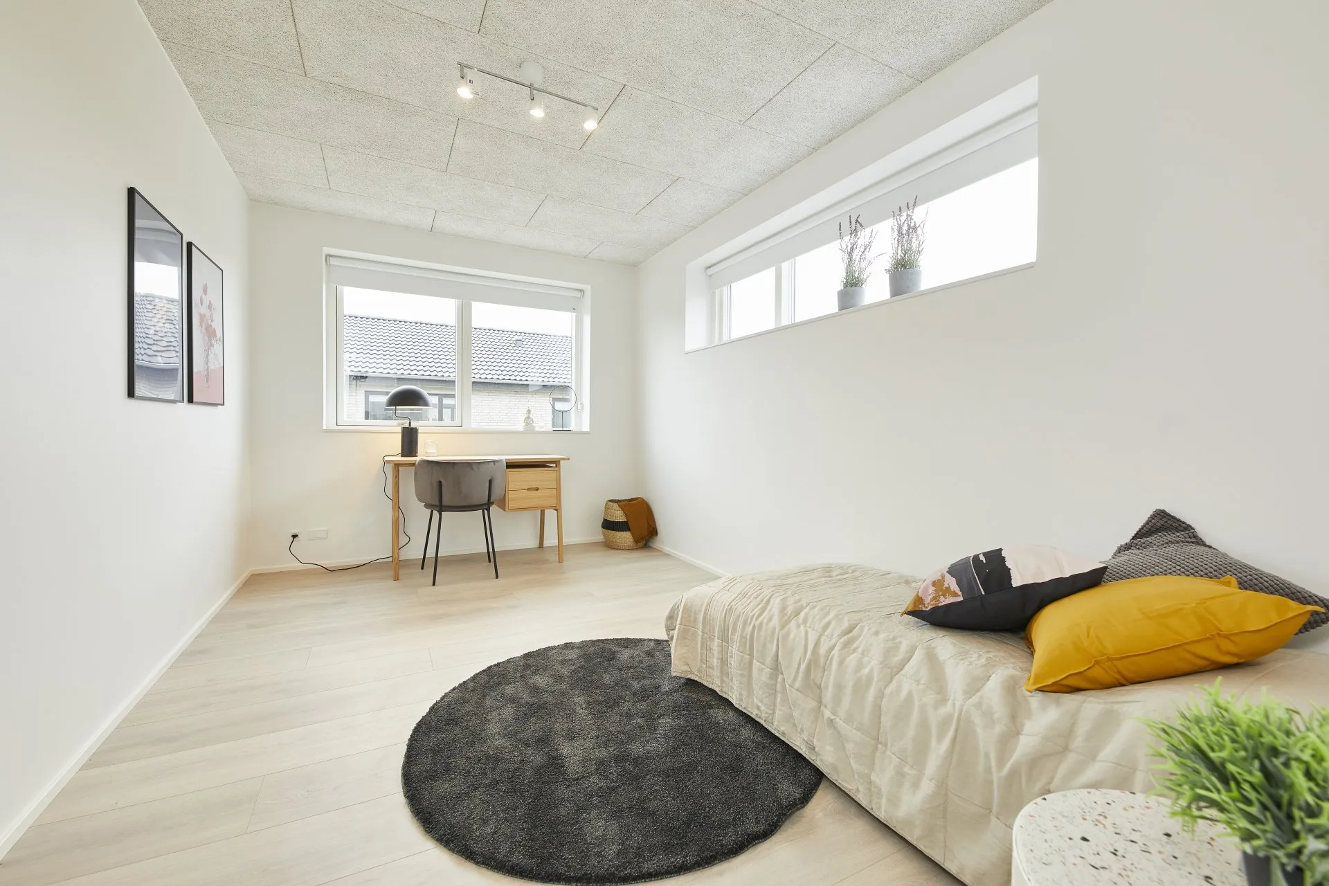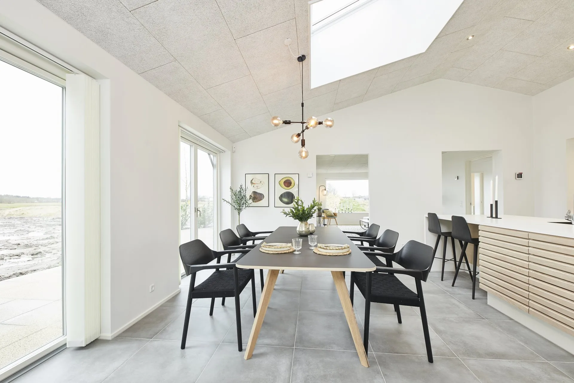 Børneadfeling med inbygget lektie-/gamerplads og køkken/alrum med to åbninger til stuen.