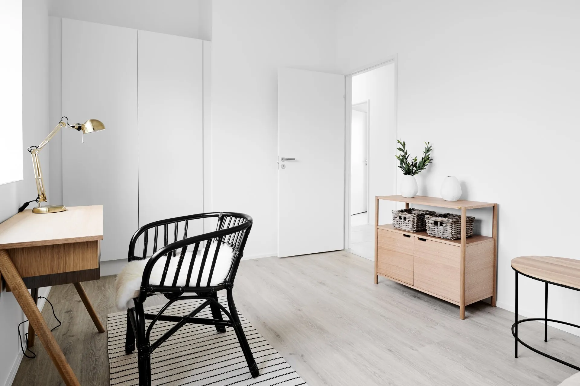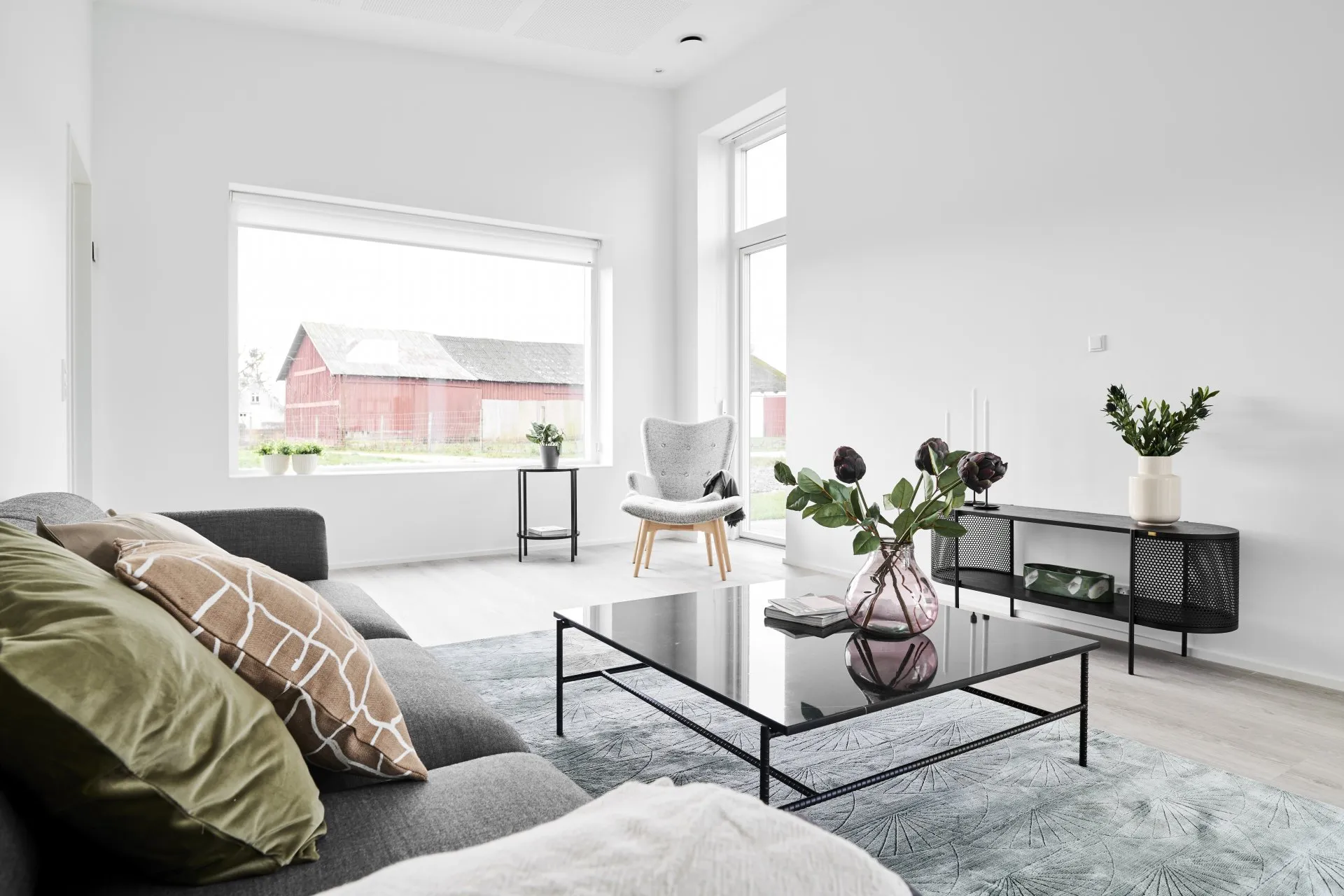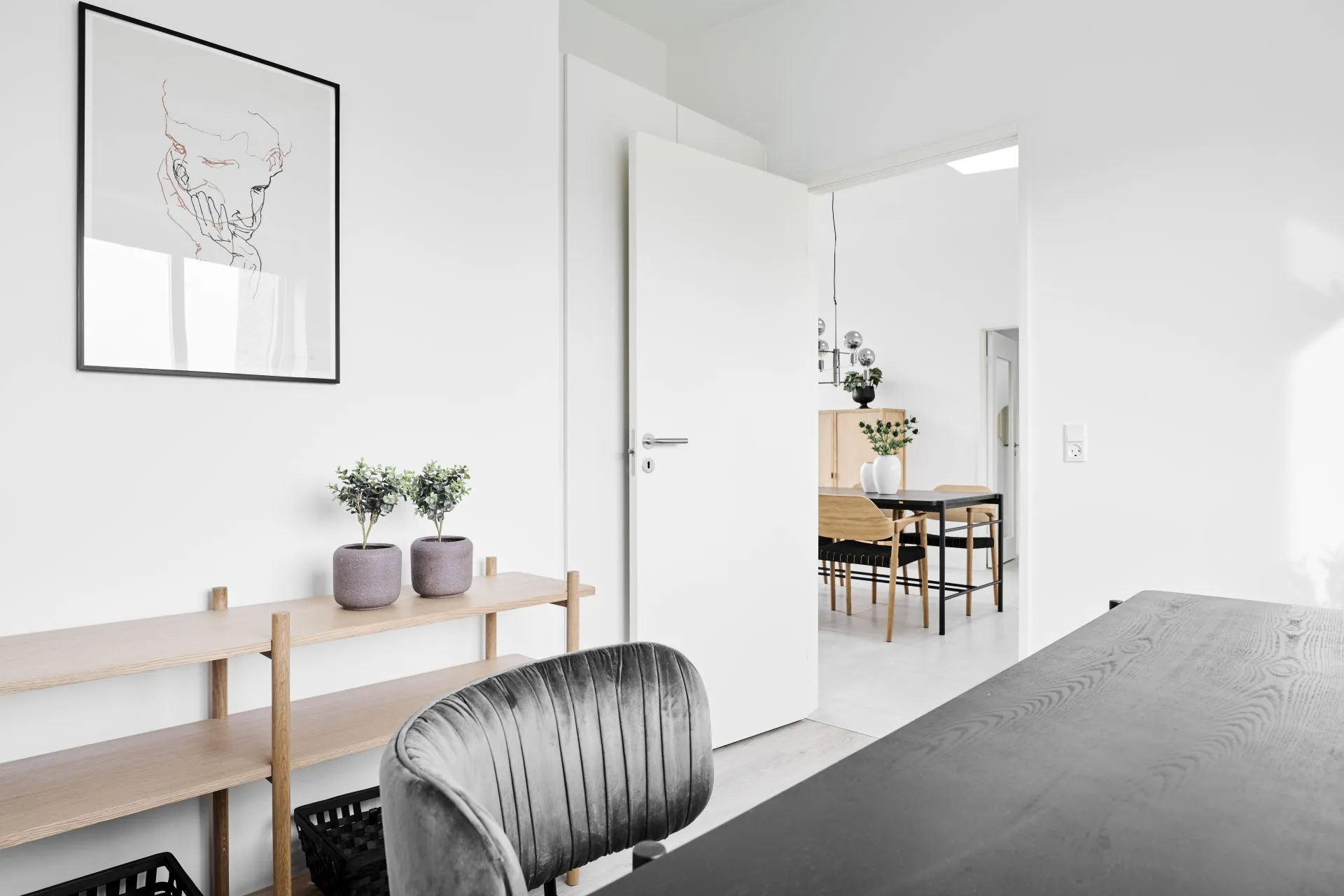 5 graders skråloft i hele huset, fokus på sort/hvid kontrast og integreret lektie-/arbejdsplads i køkkenet.