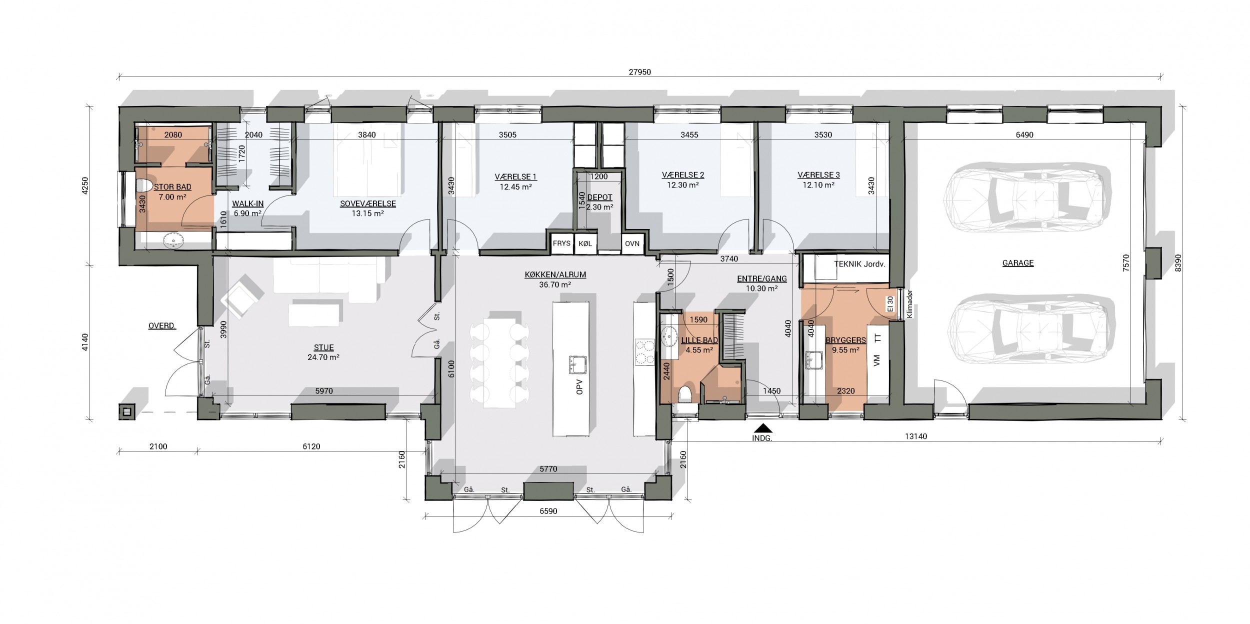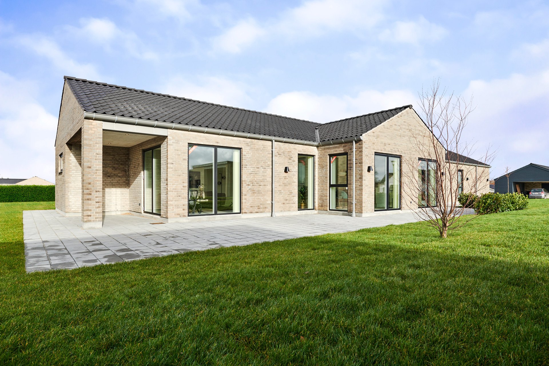 Forskudt vinkelhus med saddeltag uden udhæng.