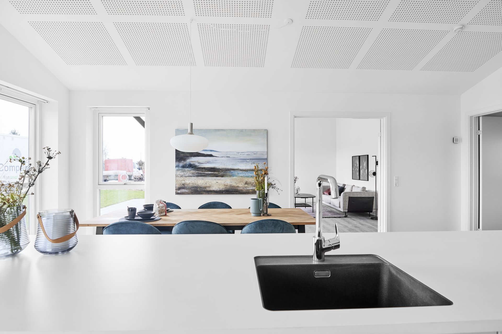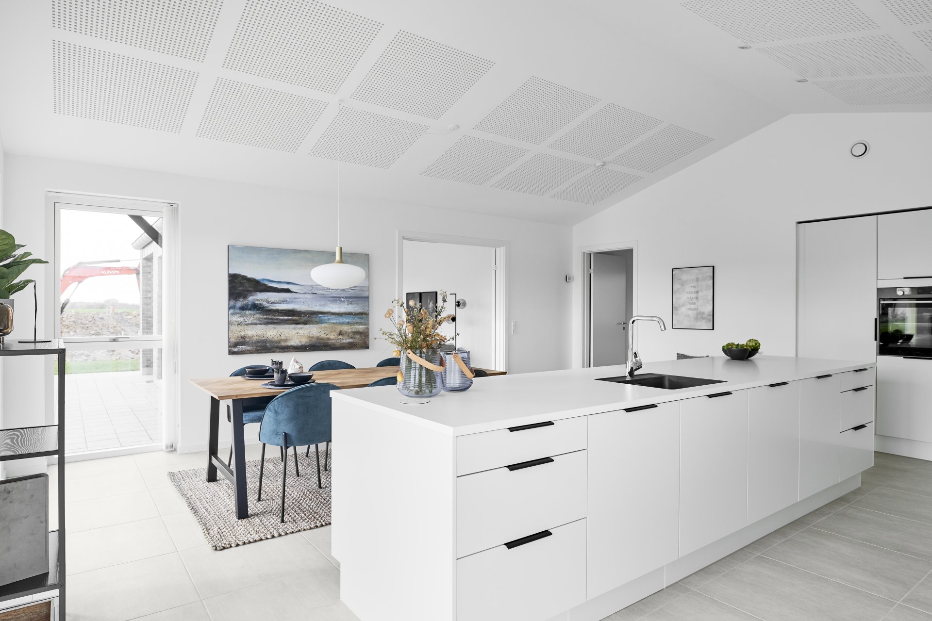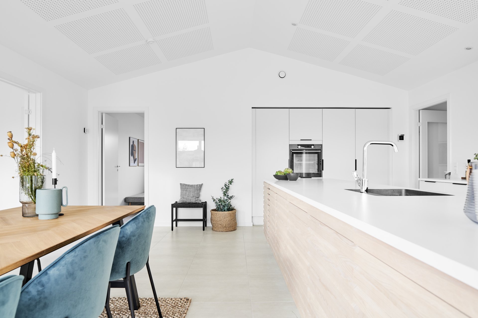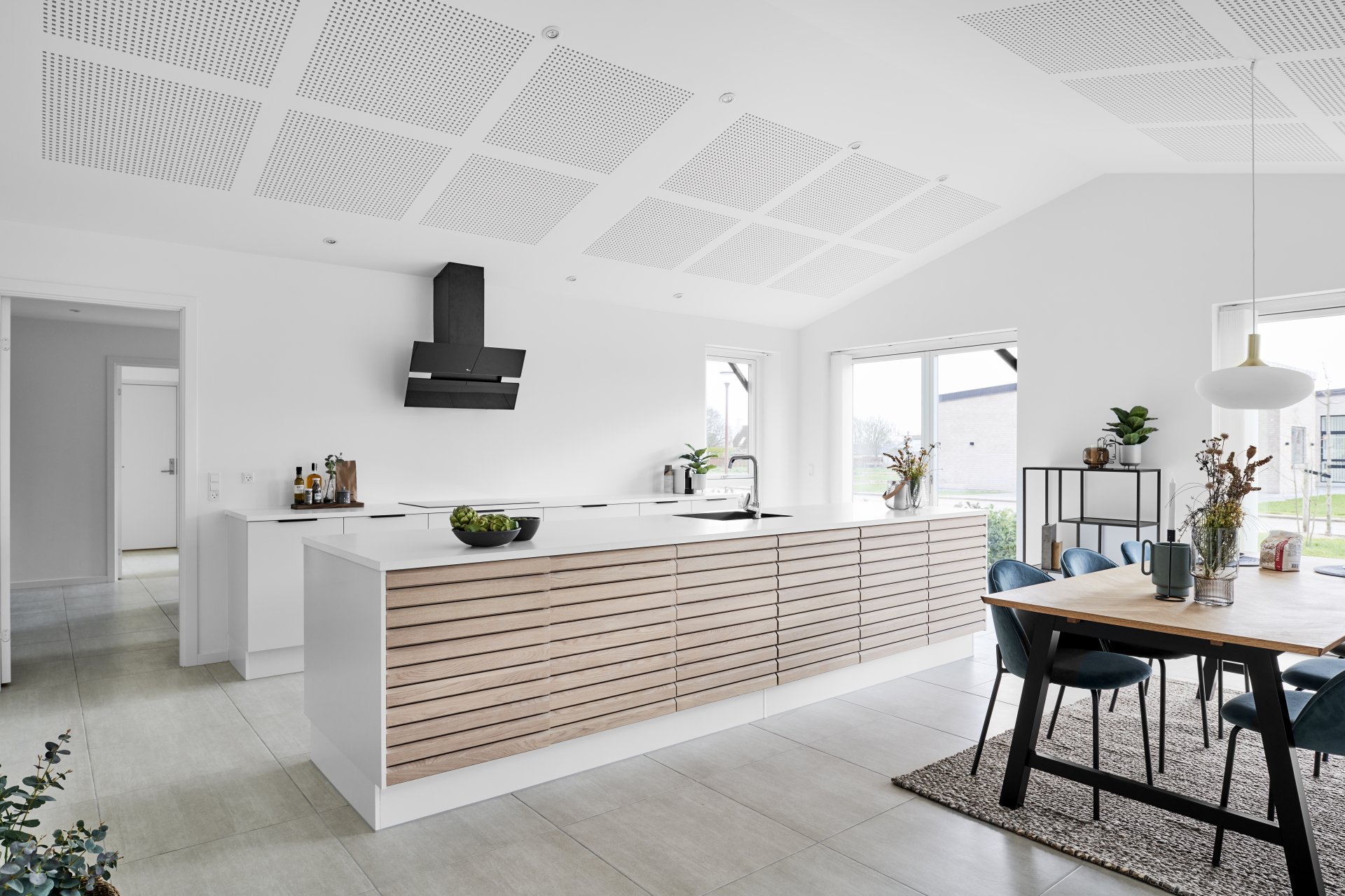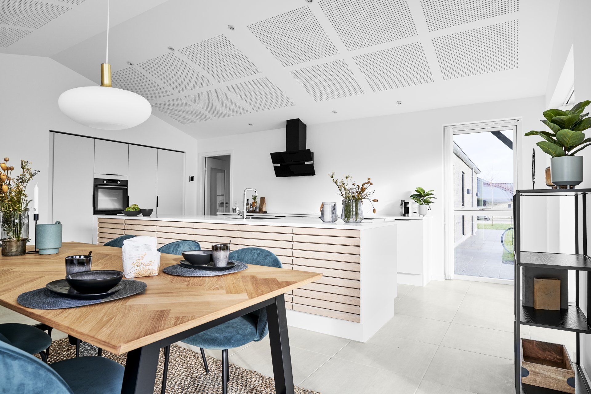 Indbygget bænk i entré samt trælameller og akustiklofter i køkken/alrum.