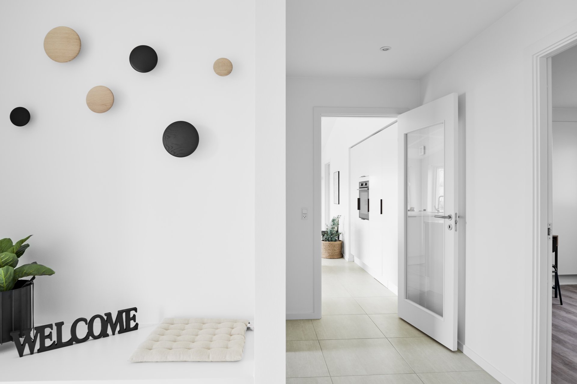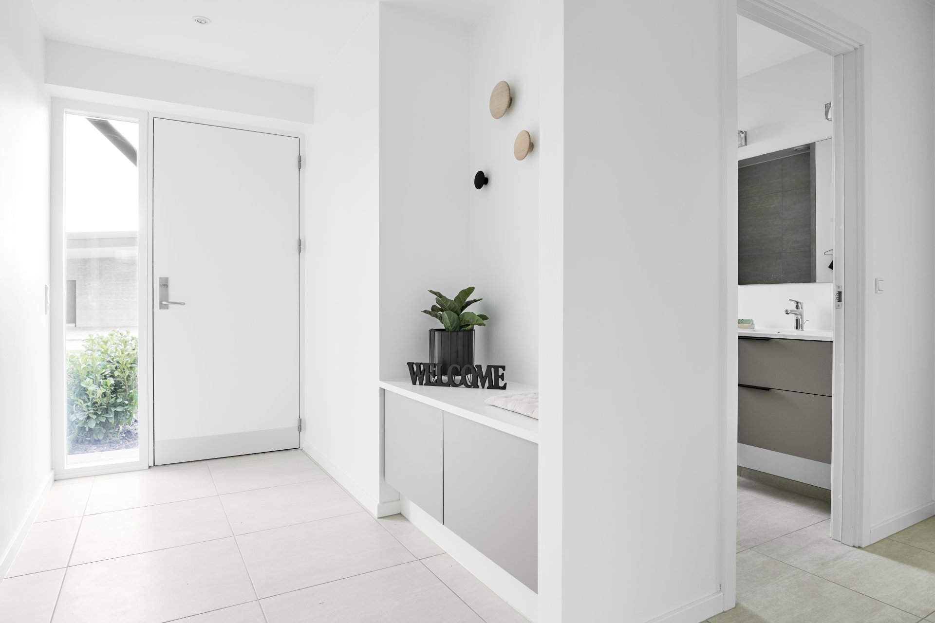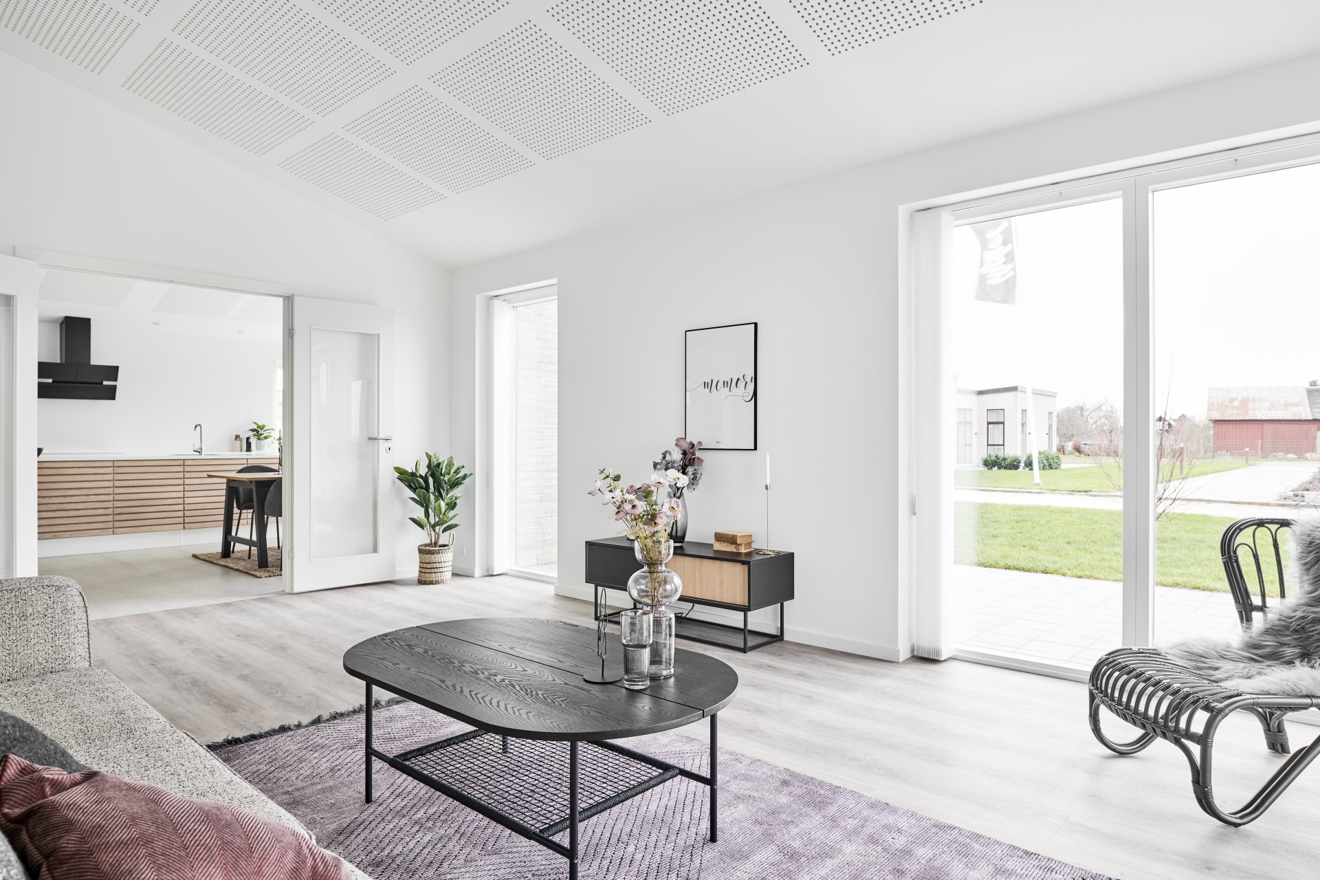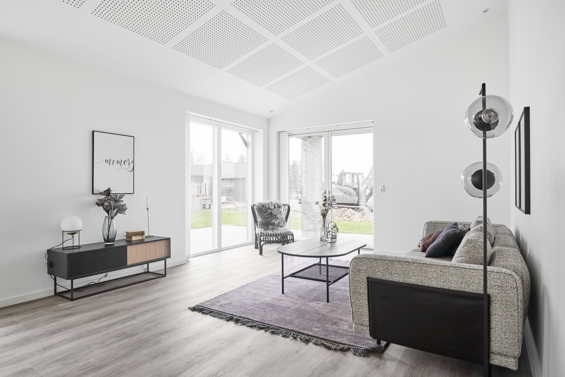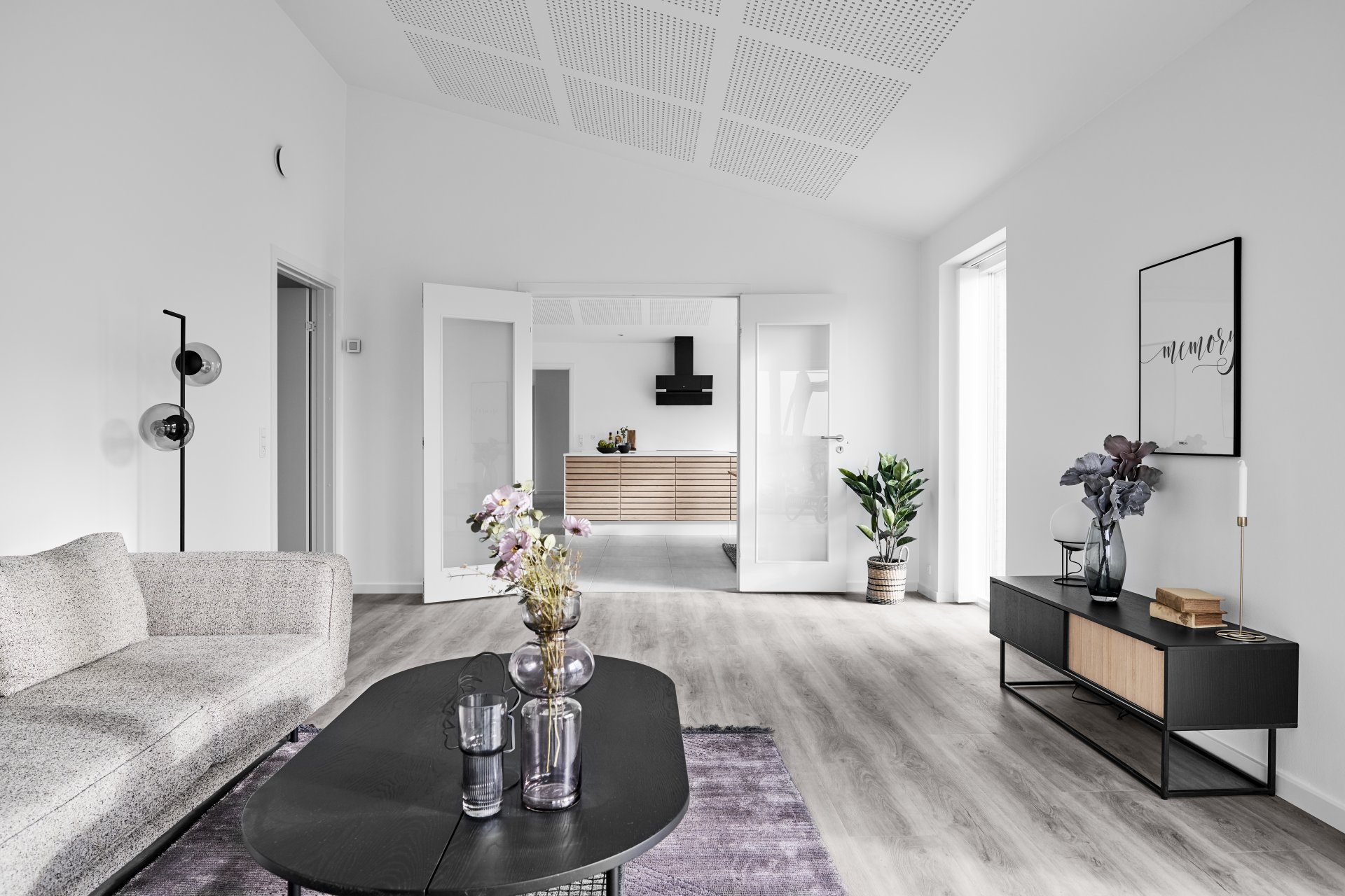 Indbygget bænk i entré samt trælameller og akustiklofter i køkken/alrum.