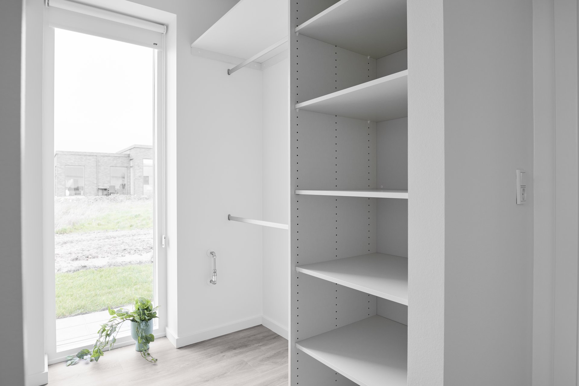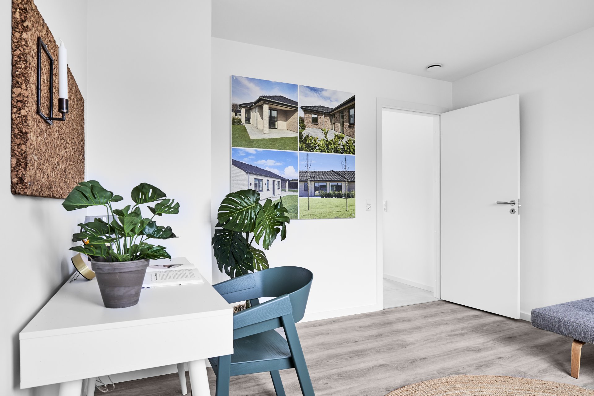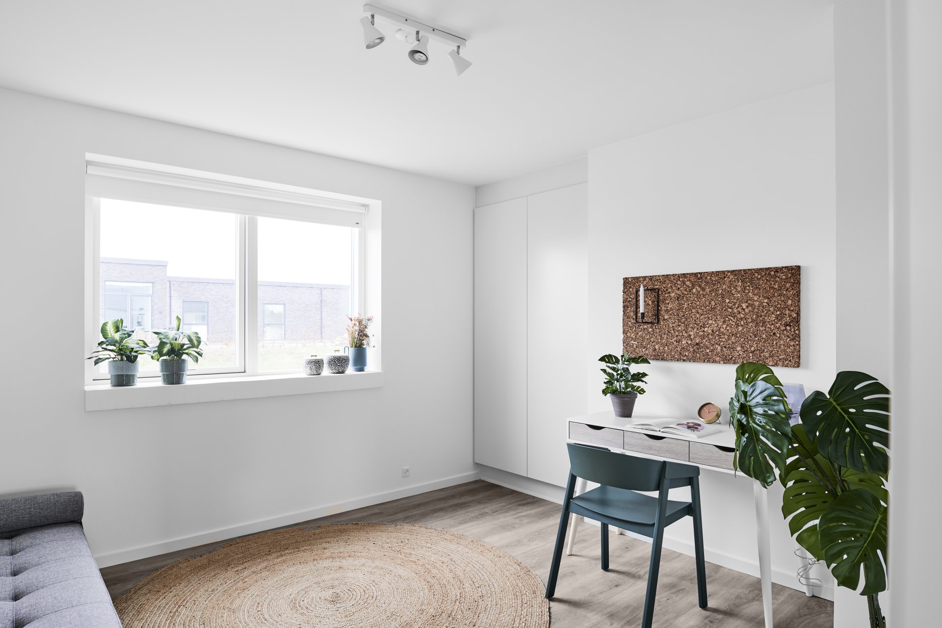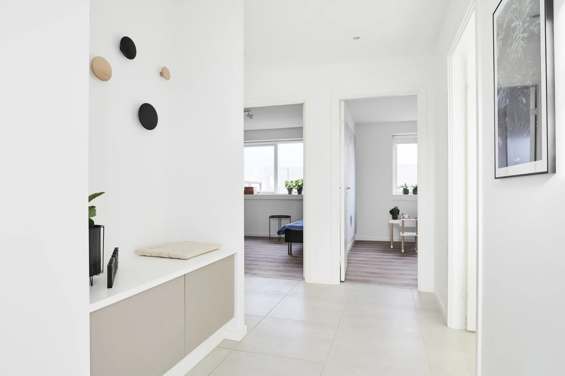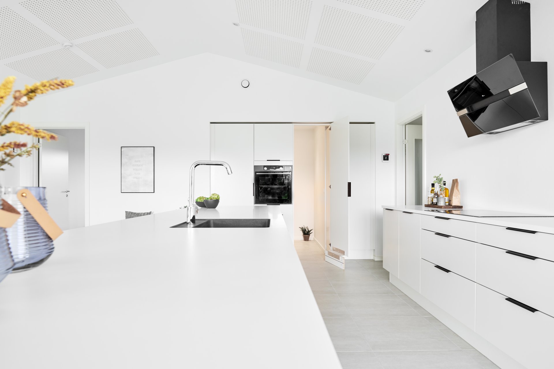 Indbygget bænk i entré samt trælameller og akustiklofter i køkken/alrum.