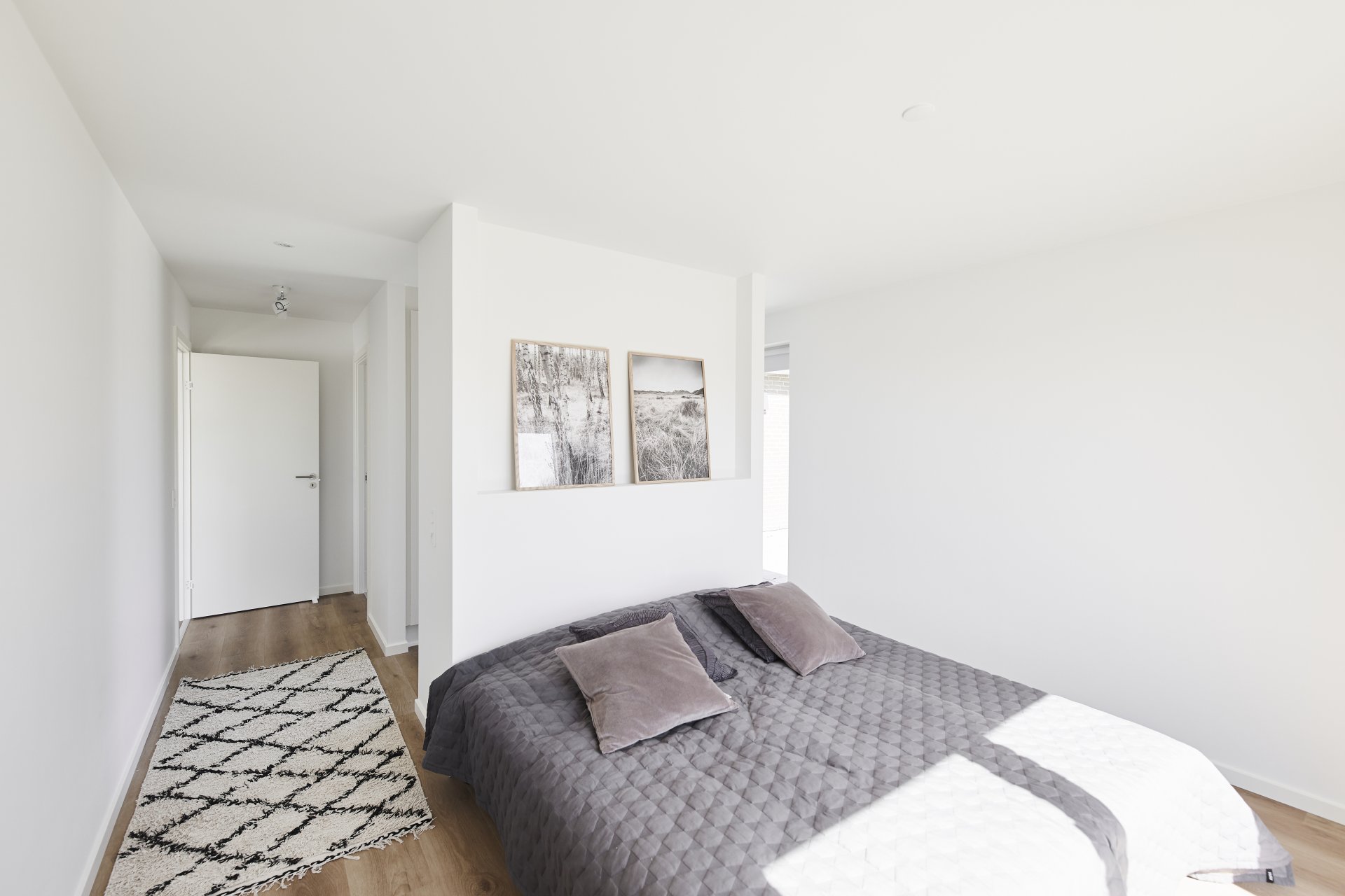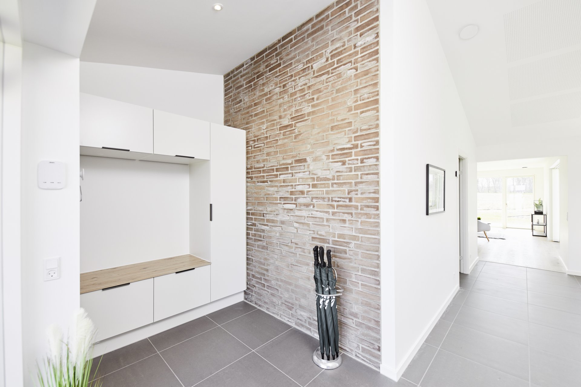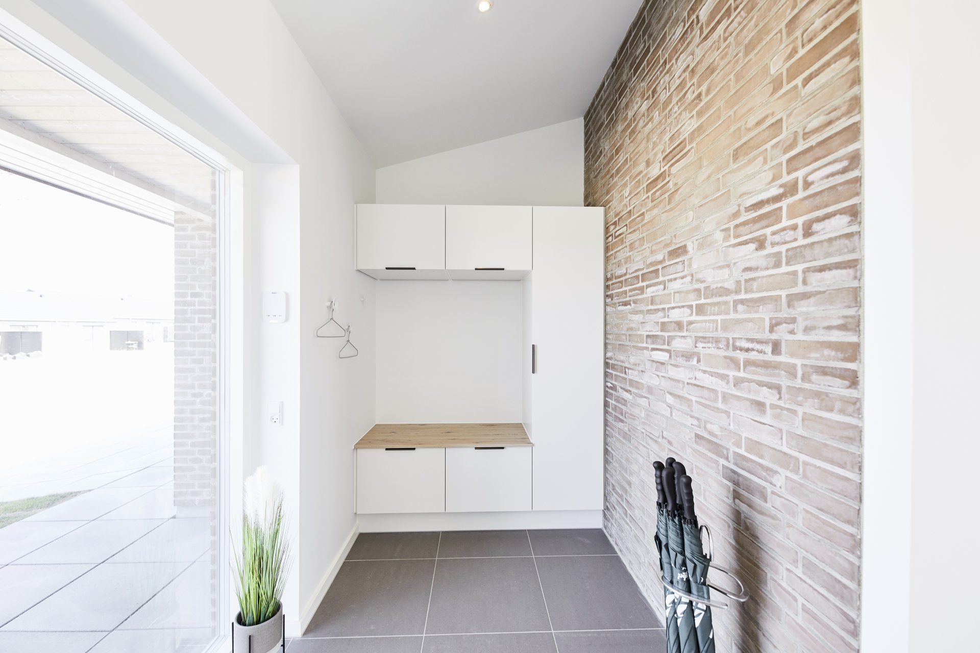 Stor entré med murstensvæg og indbygget hylde i soveværelset.