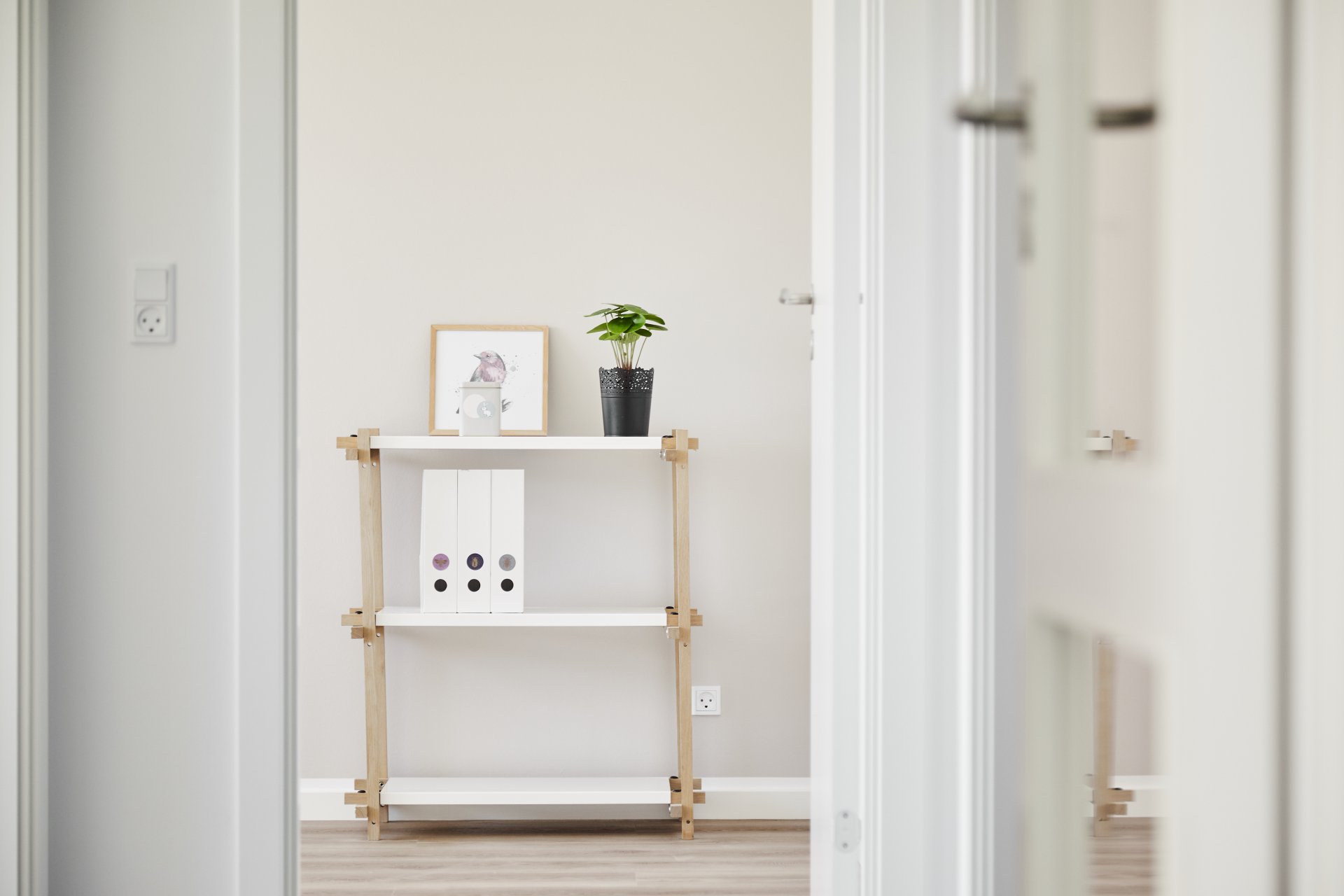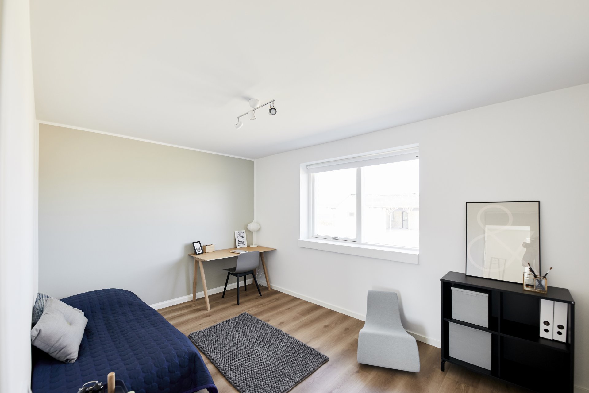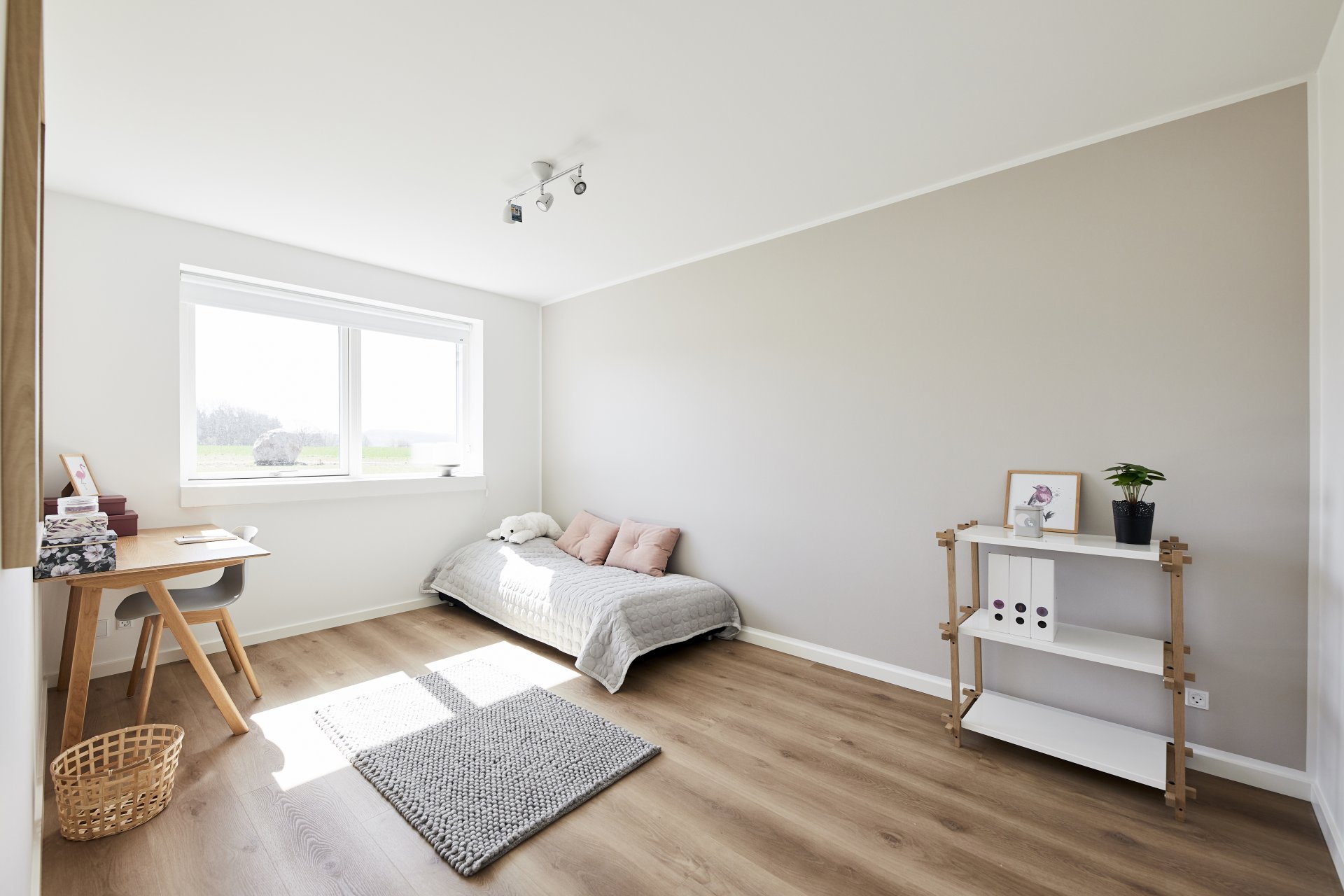 Stor entré med murstensvæg og indbygget hylde i soveværelset.