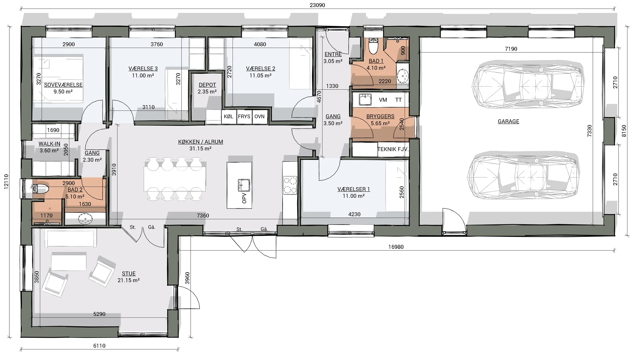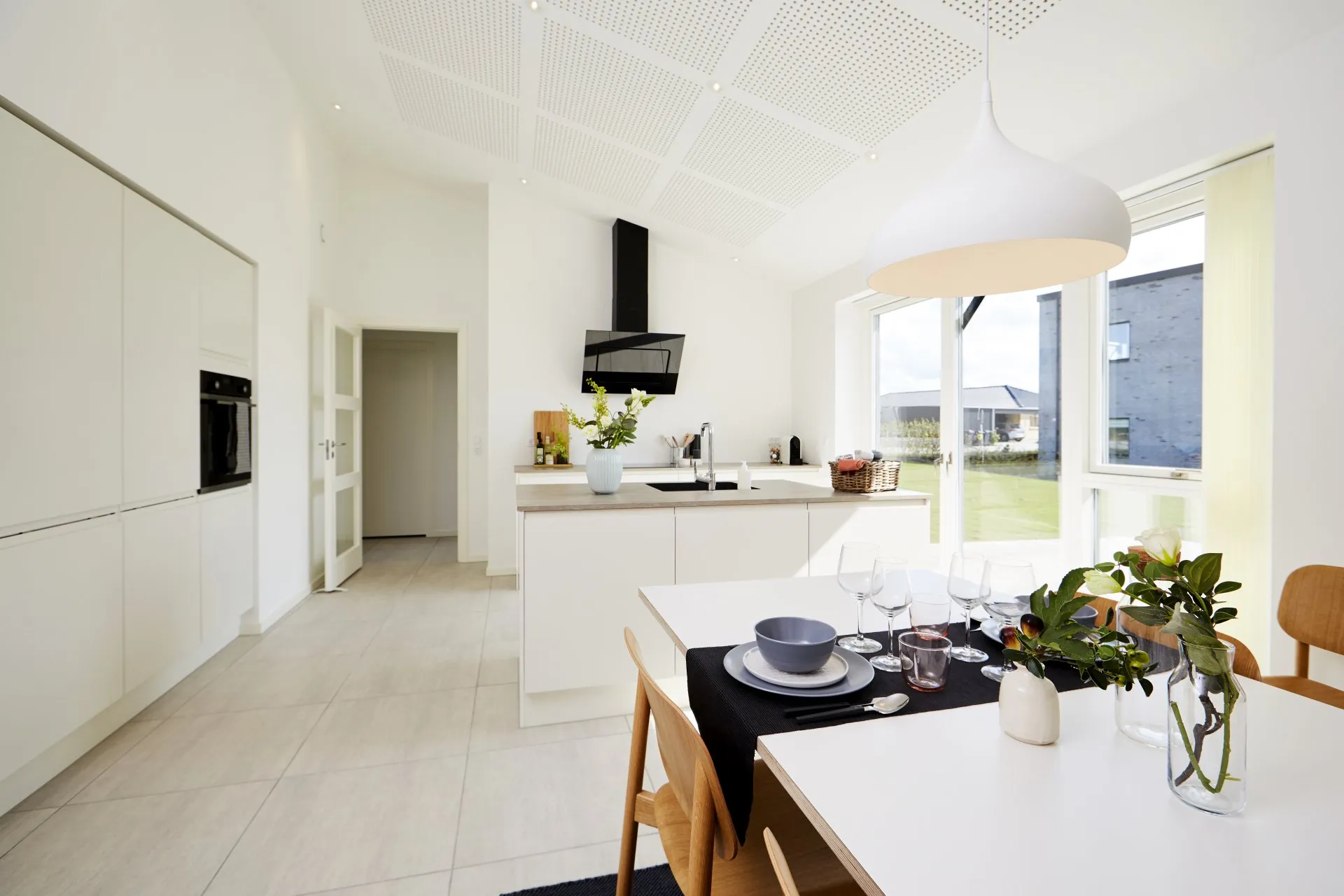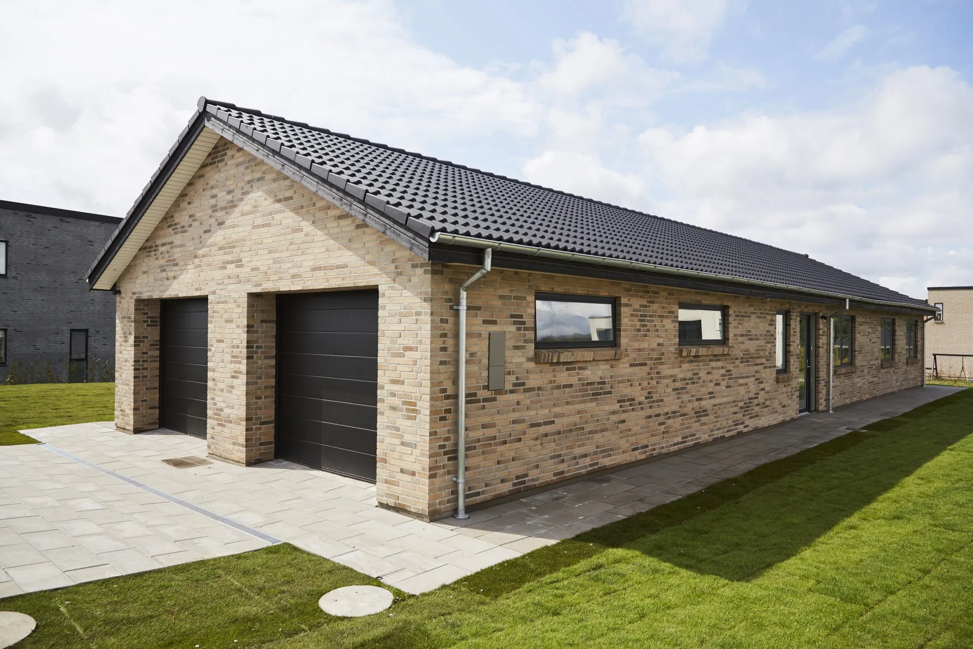 Integreret dobbelt garage med klinker, store vinduespartier og højt til loftet med akustikplader.