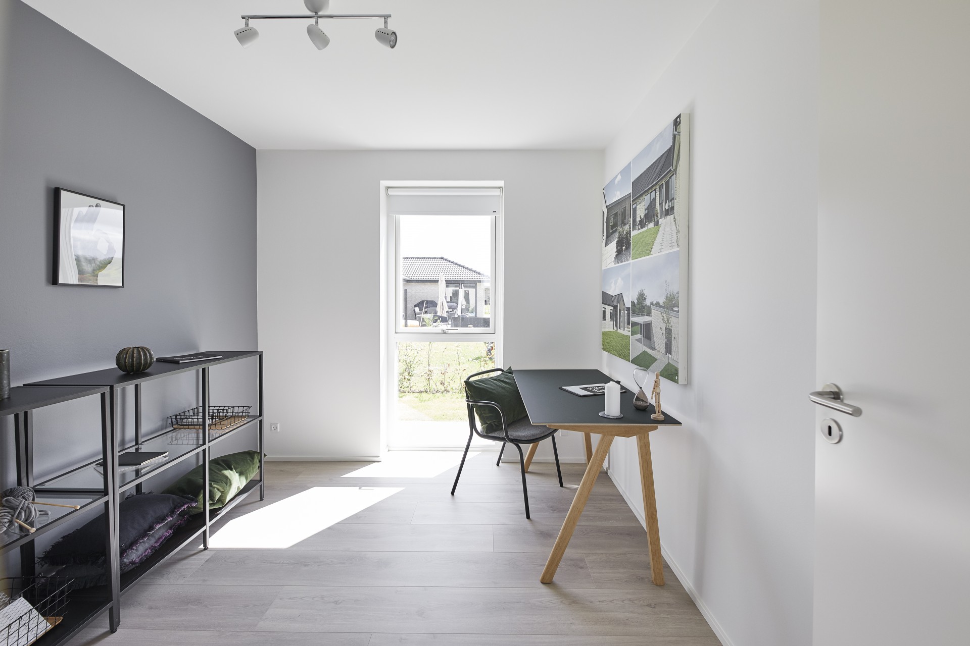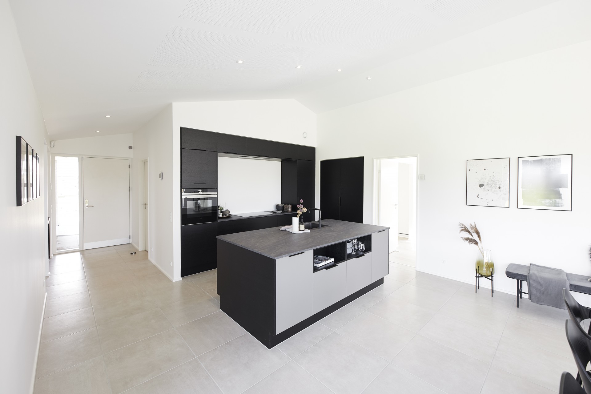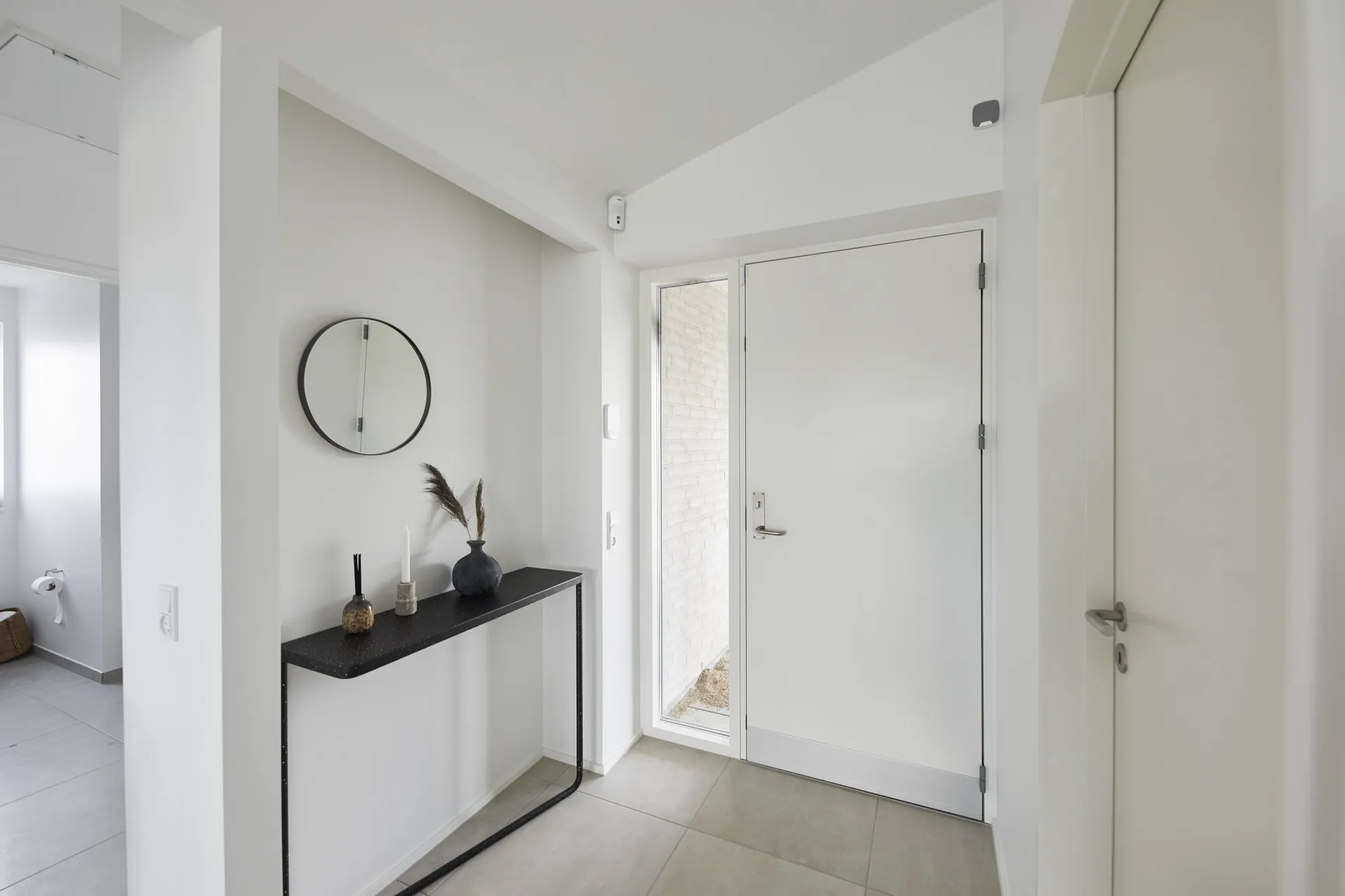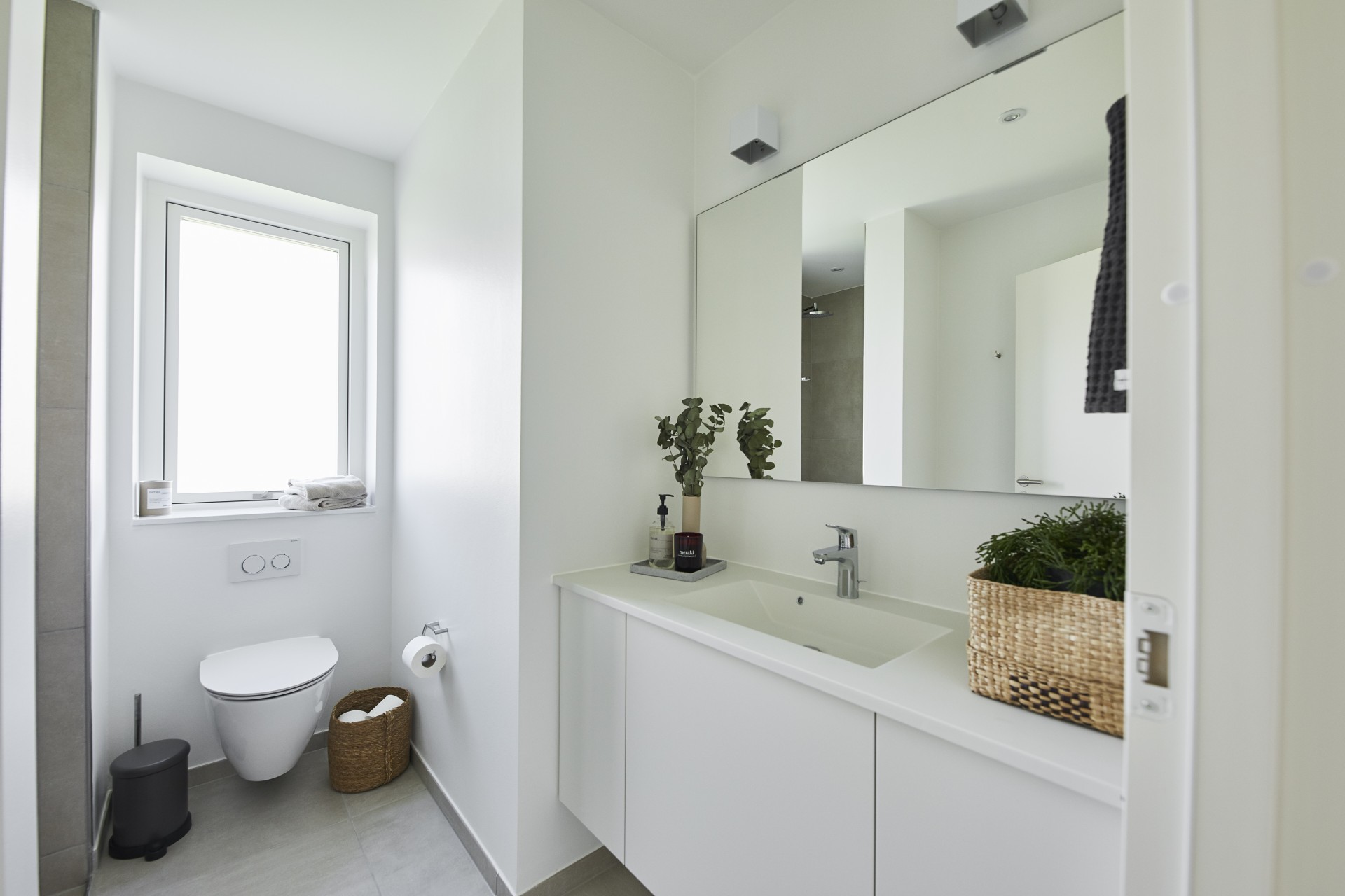 Mursten: Cassis m. grå/hvid fuge. Klinker: Ragno Sound Off White. Gulv: Laminat 88