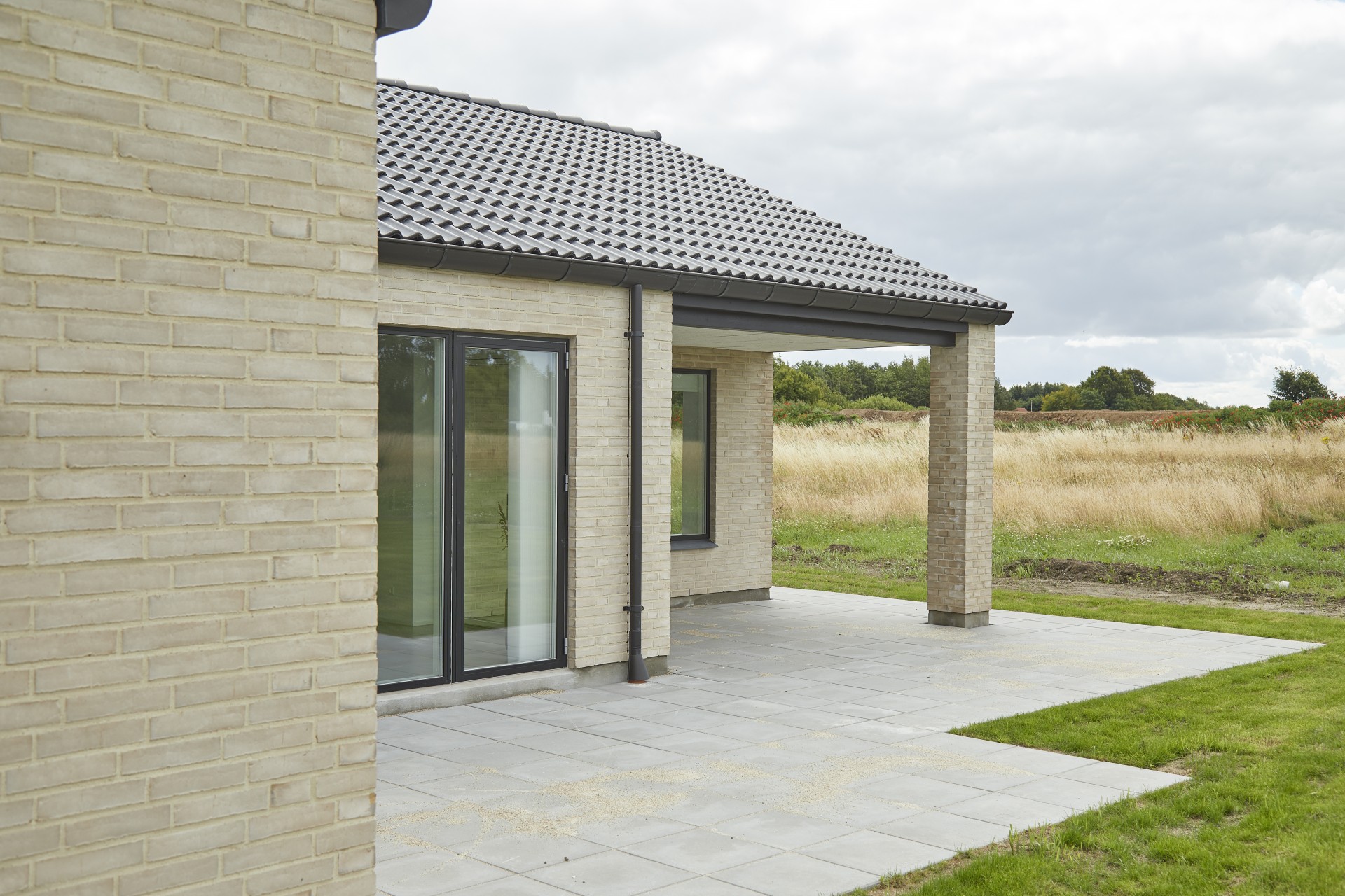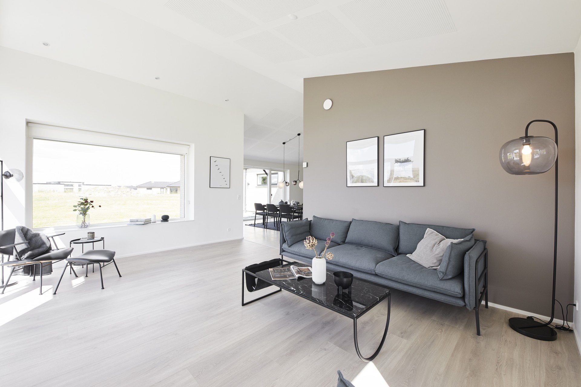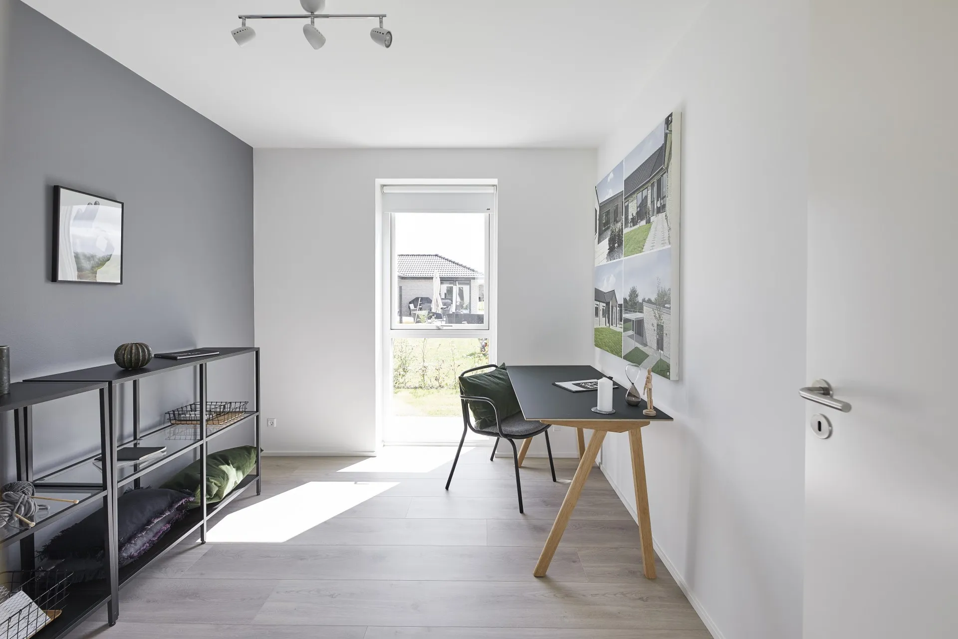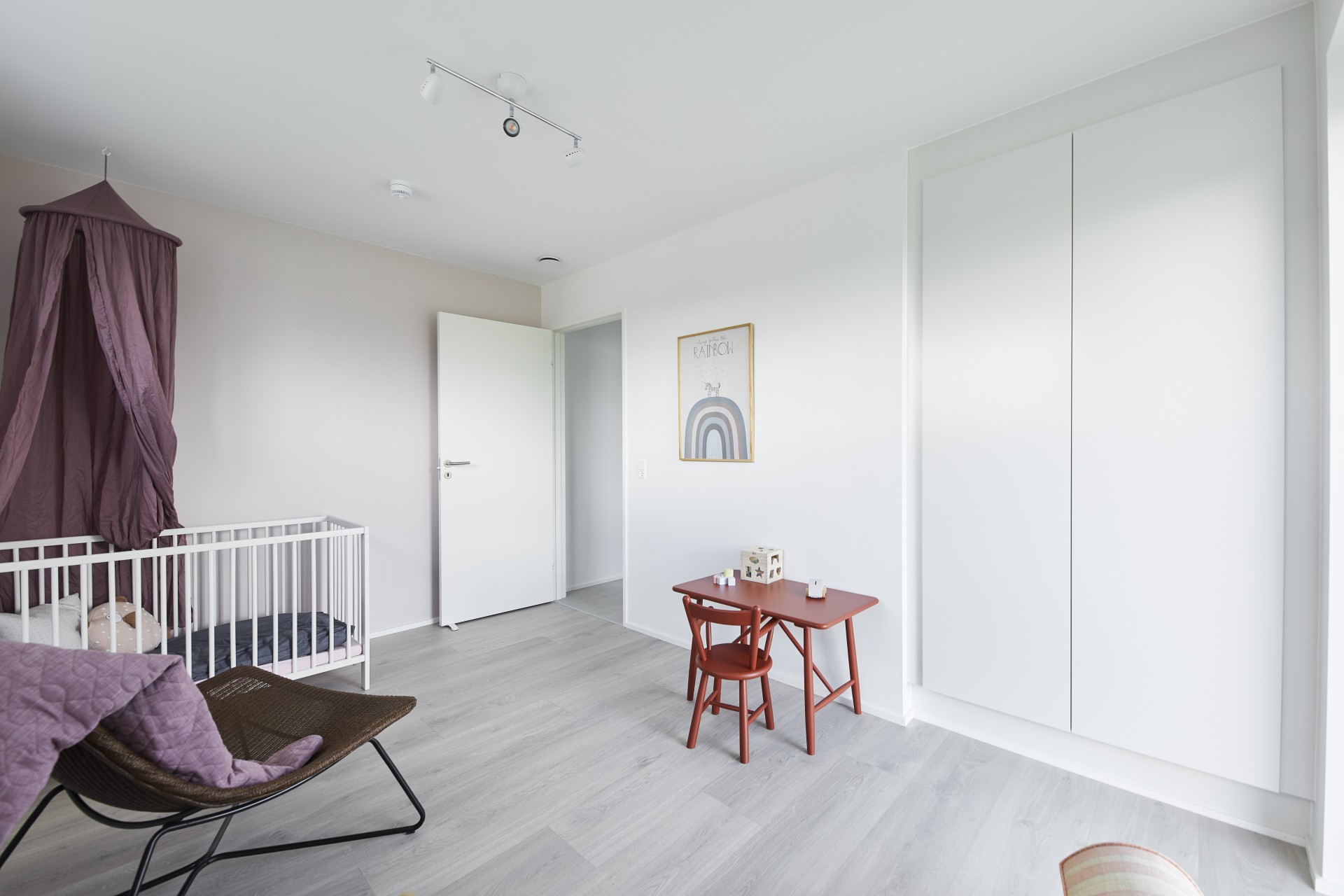 Mursten: Cassis m. grå/hvid fuge. Klinker: Ragno Sound Off White. Gulv: Laminat 88