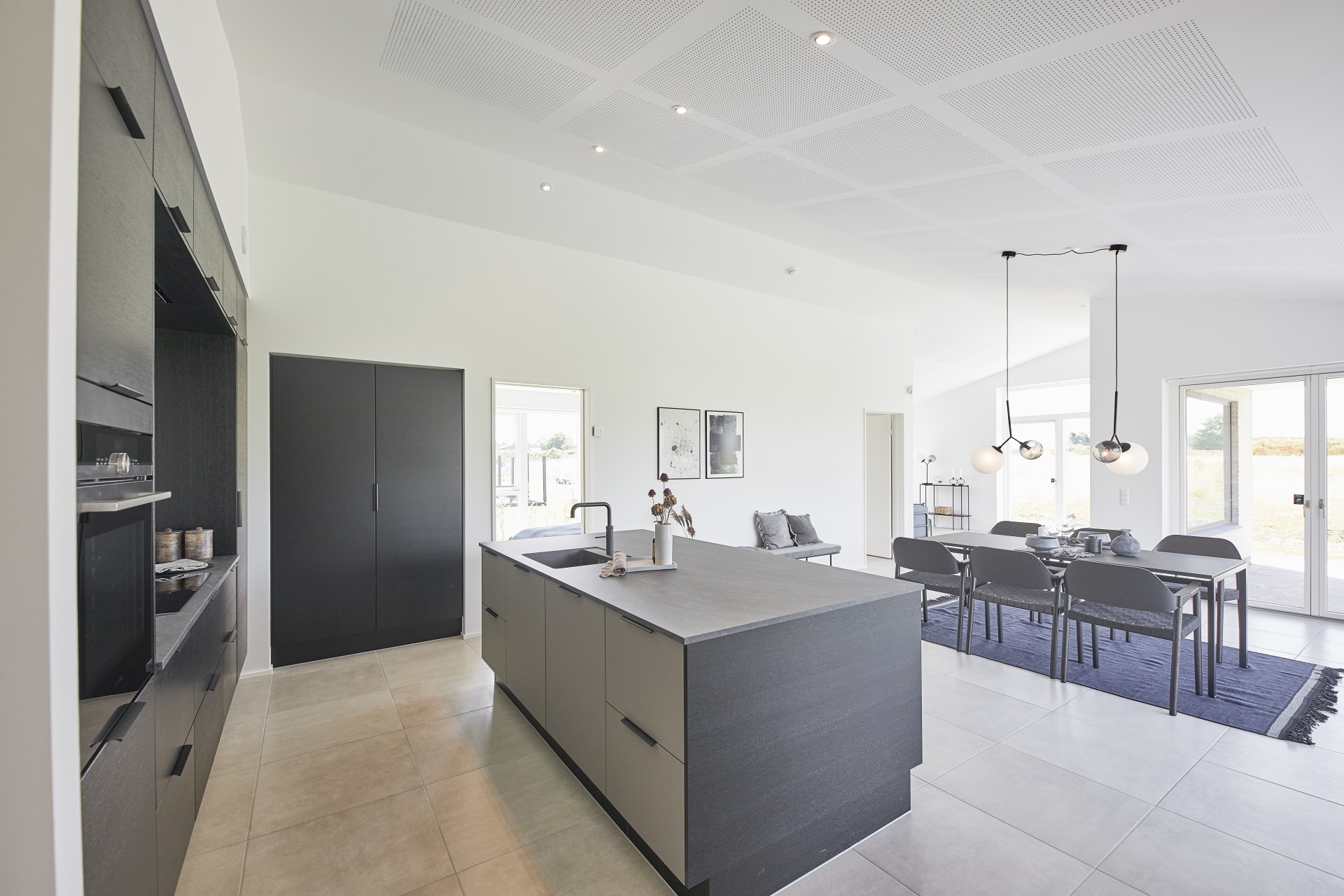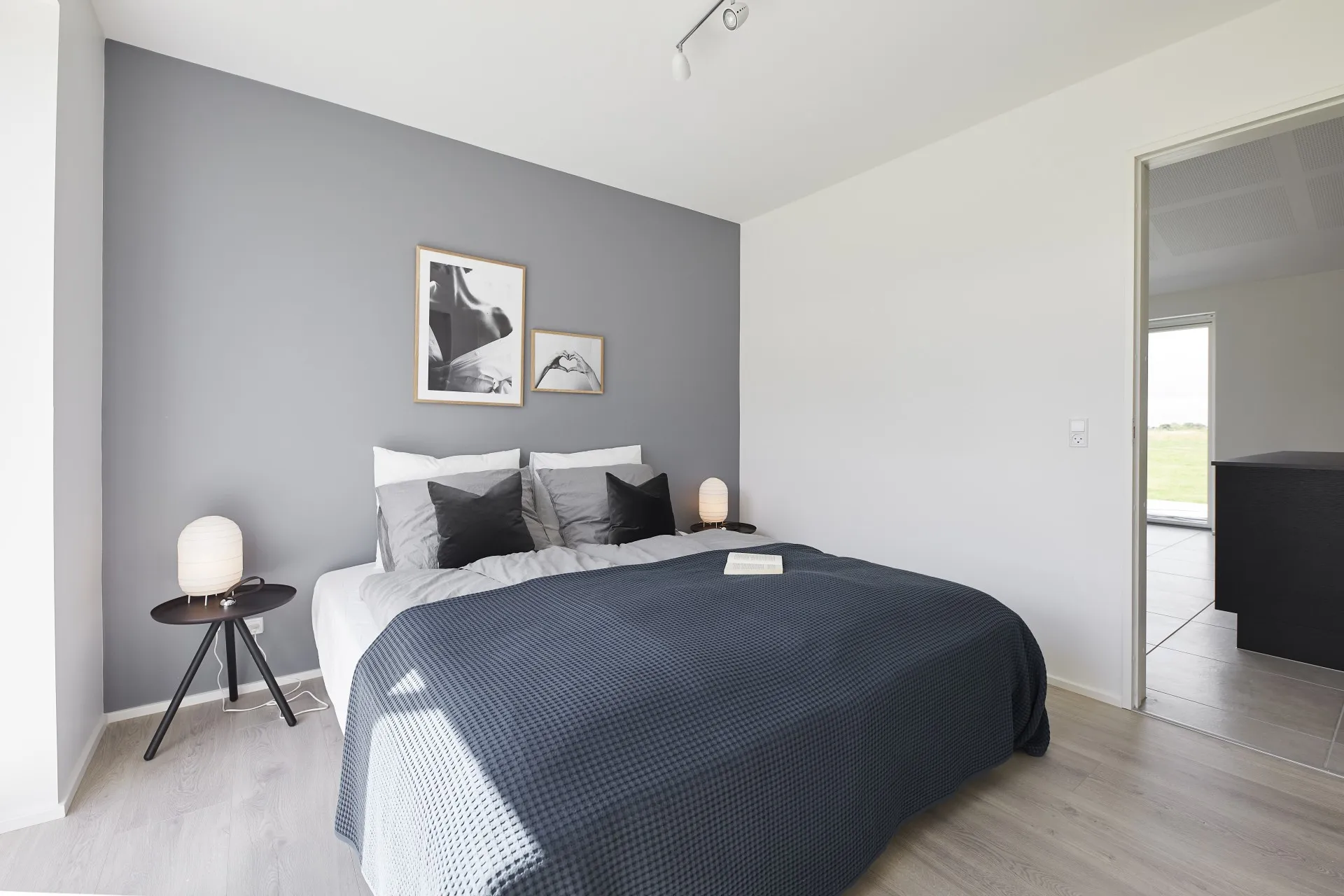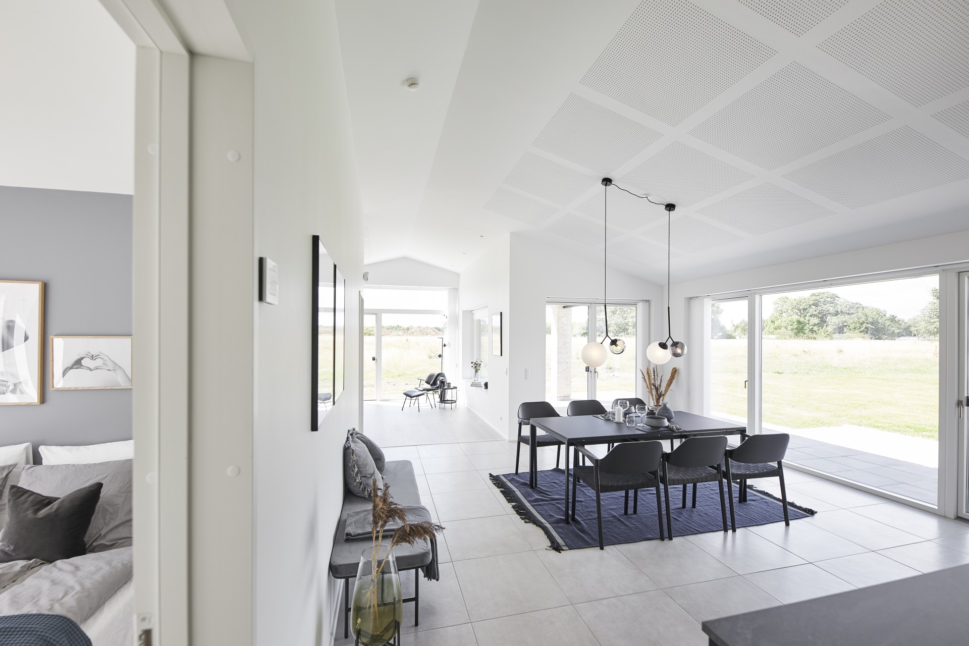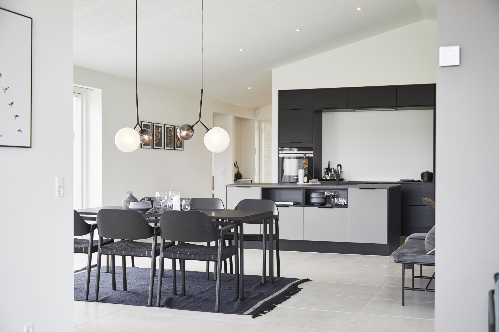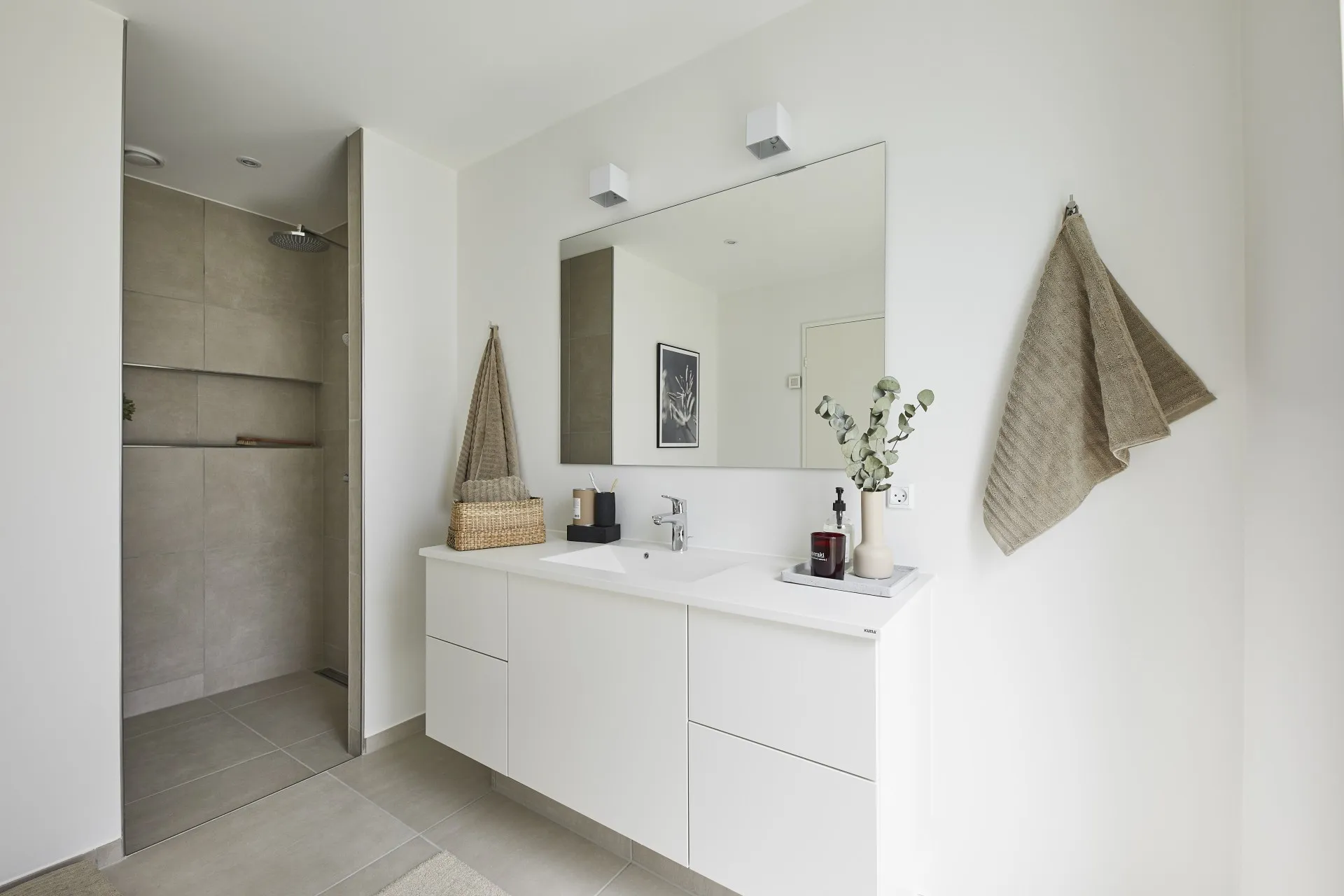 Mursten: Cassis m. grå/hvid fuge. Klinker: Ragno Sound Off White. Gulv: Laminat 88