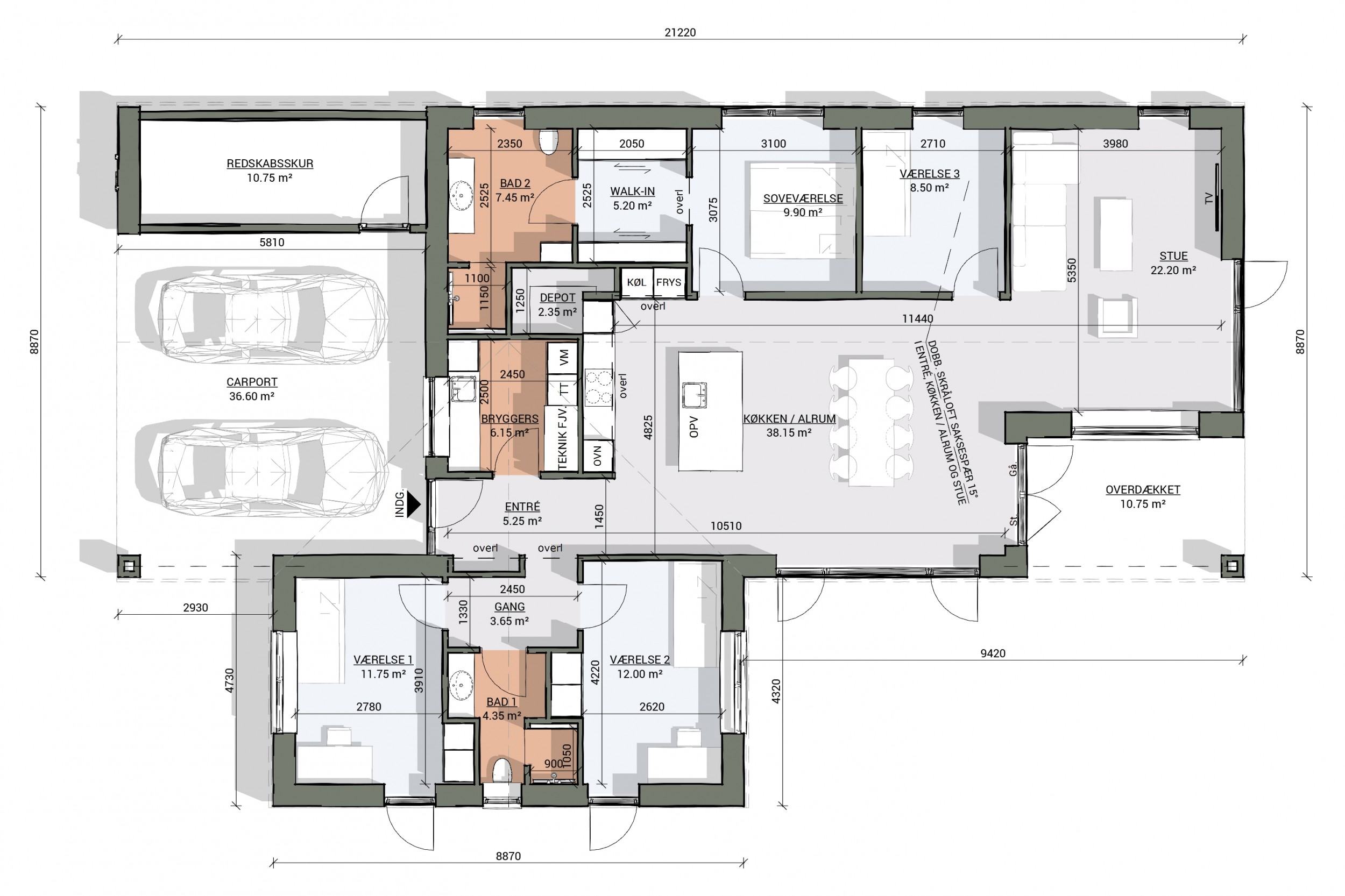 Bolig: 165 m2. Carport: 50 m2.