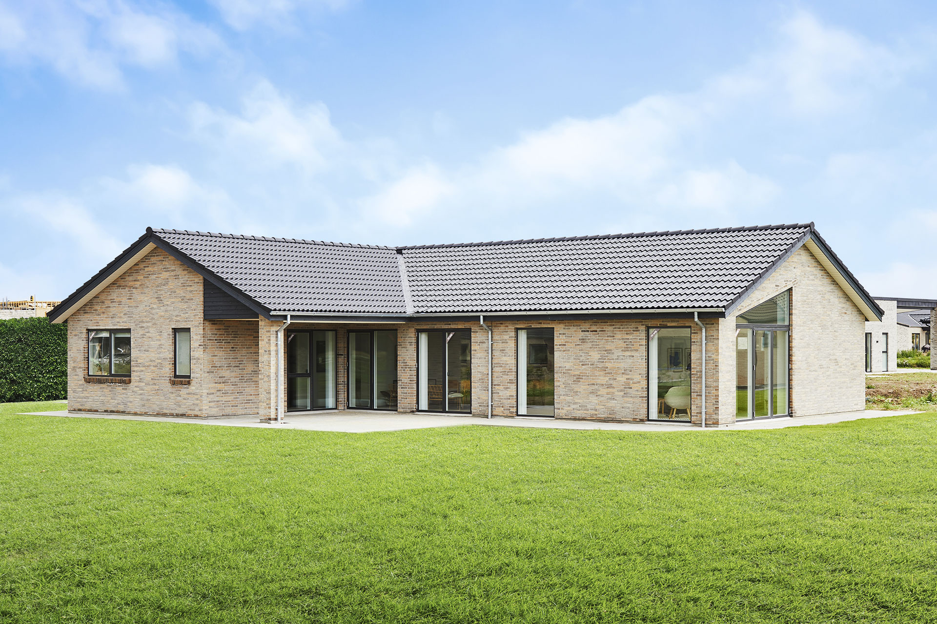 Forskudt vinkelhus med saddeltag og udhæng.