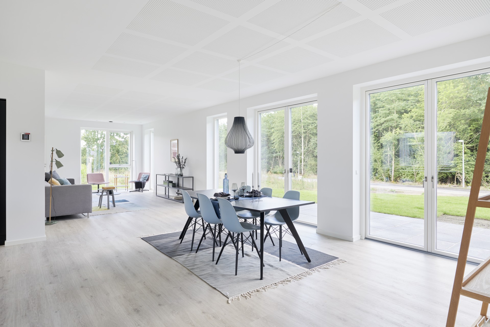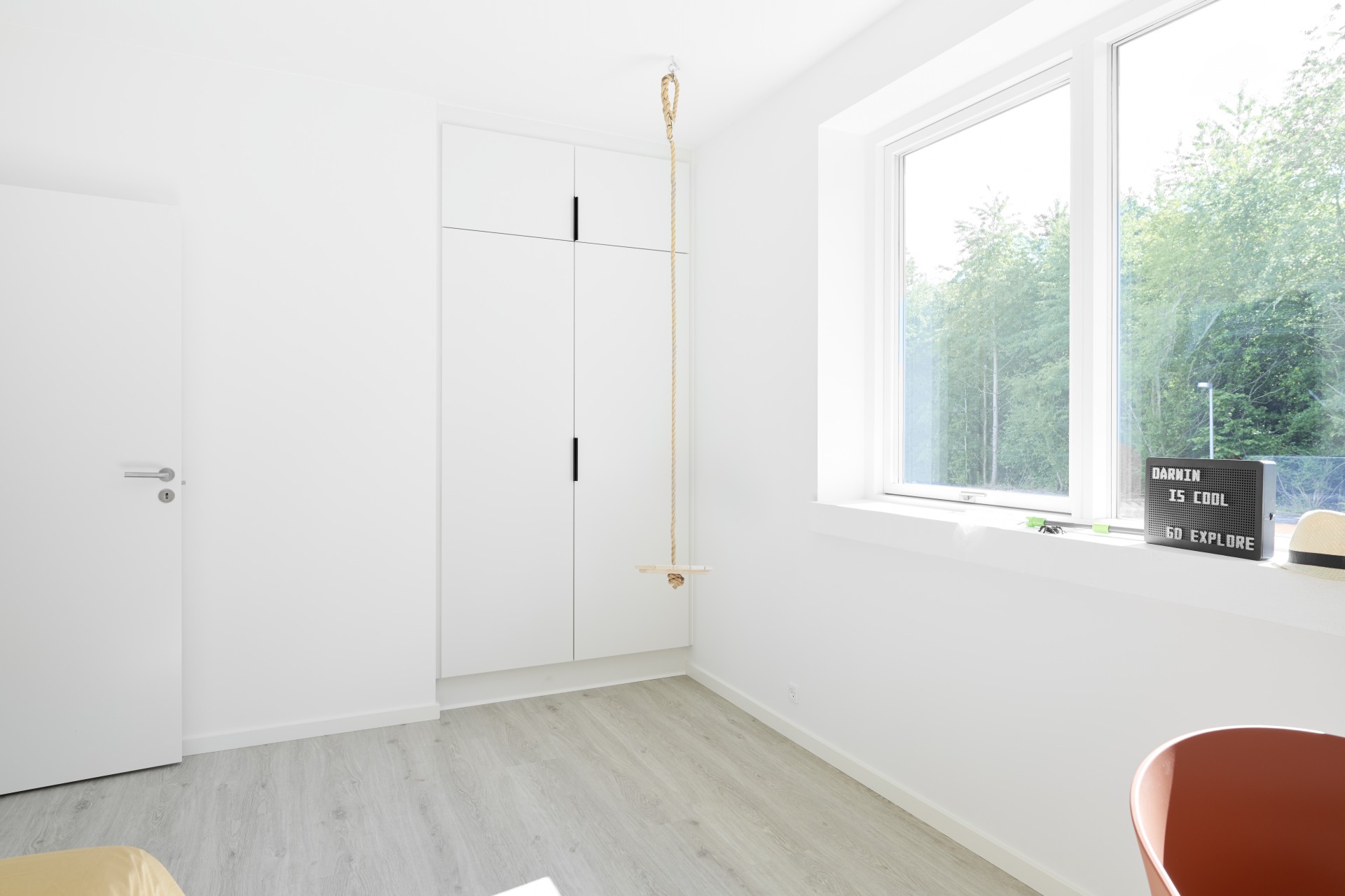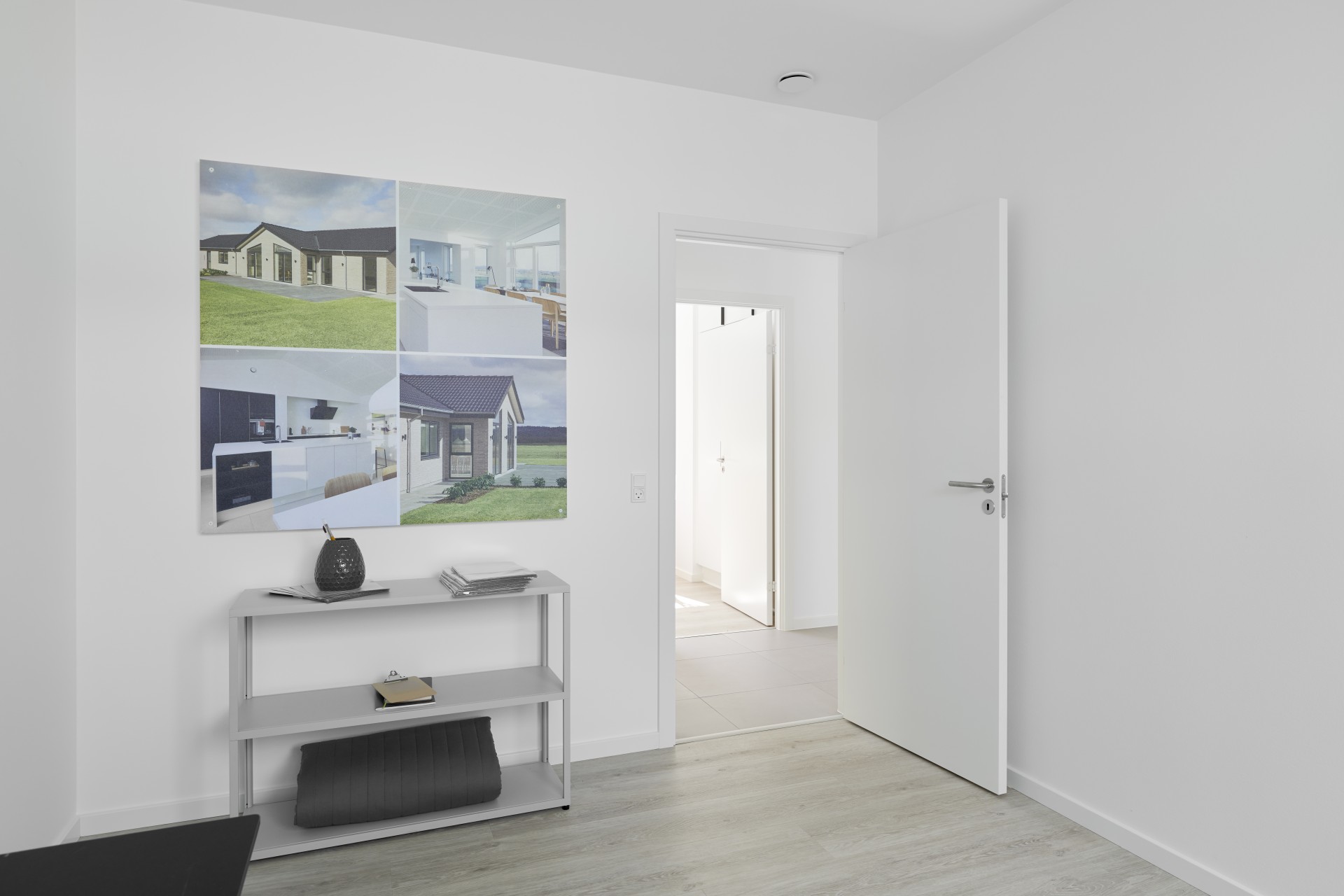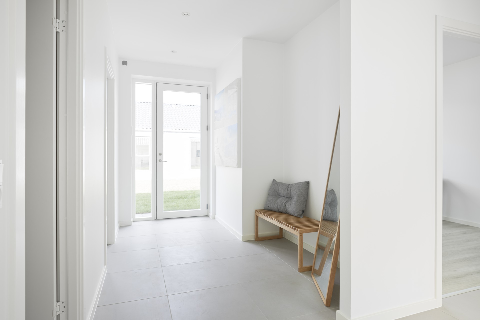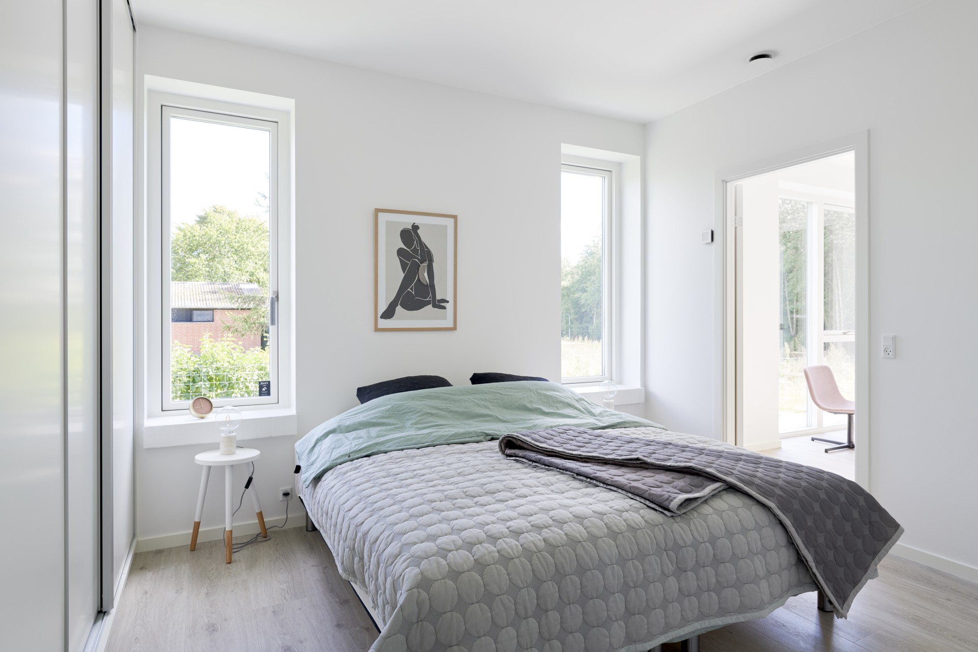 Indgangsparti i glas, skabsvæg med skydelåger i soveværelset samt køkken/alrum og stue i åben løsning.