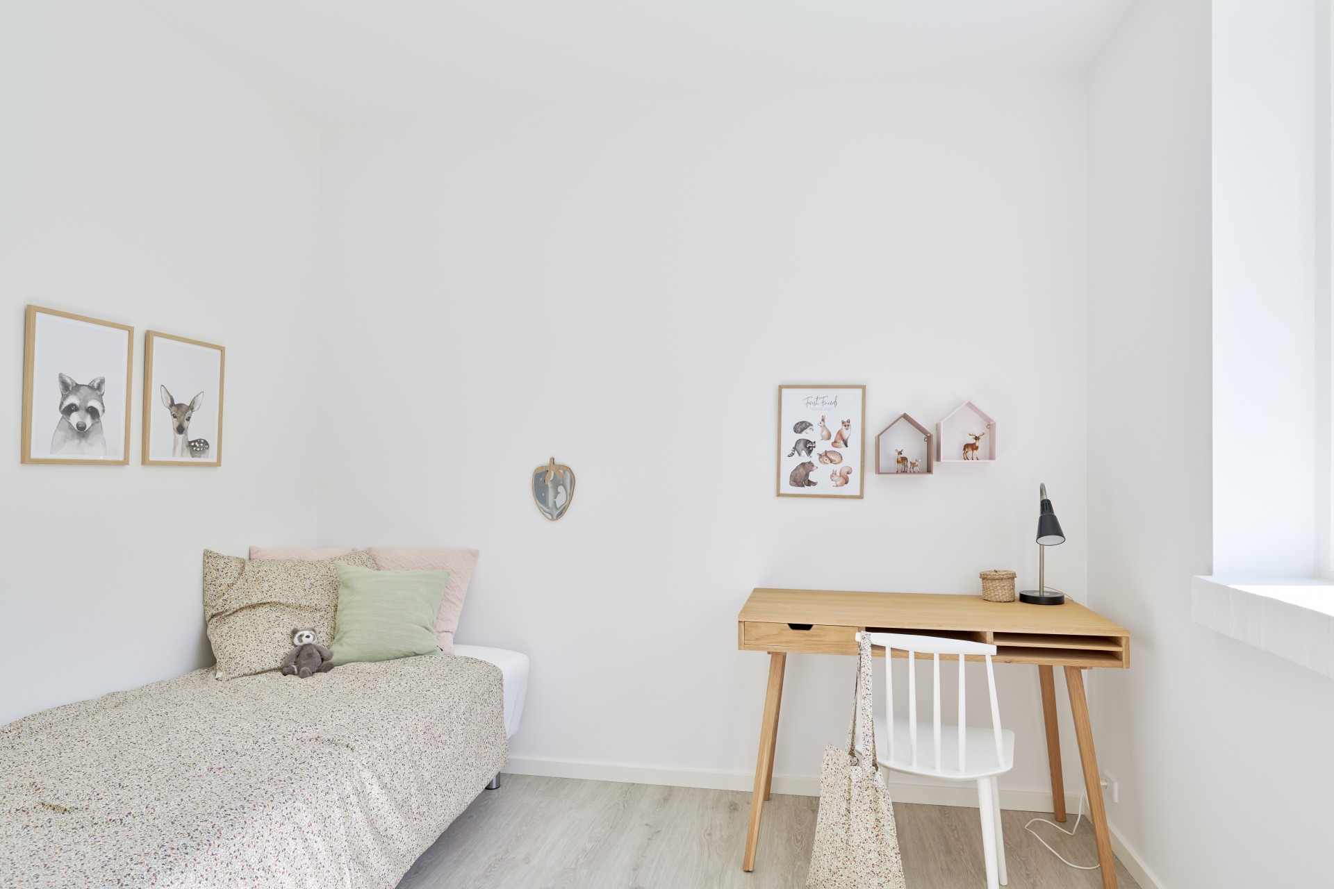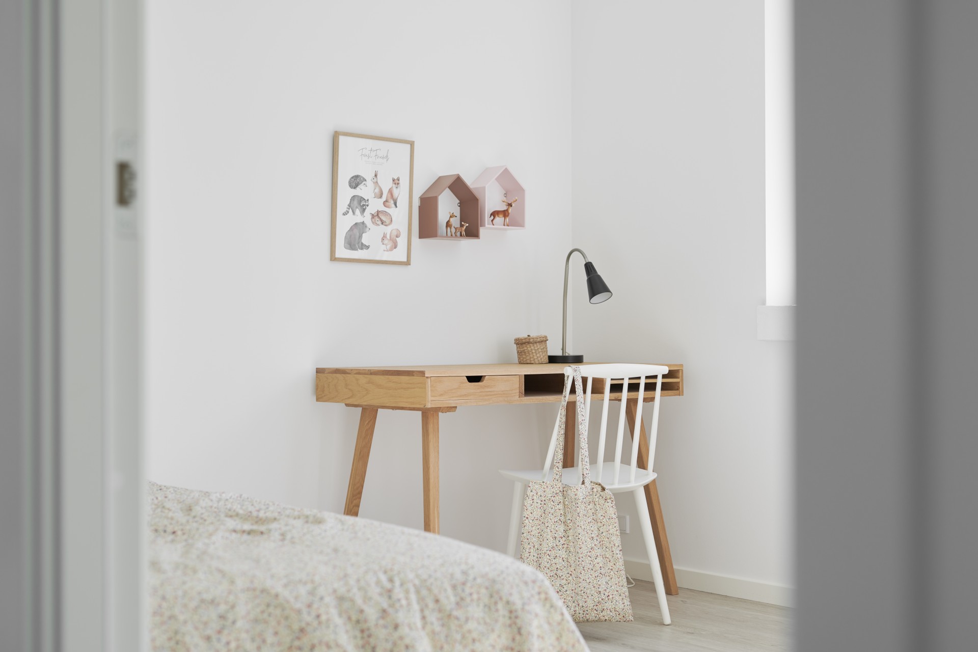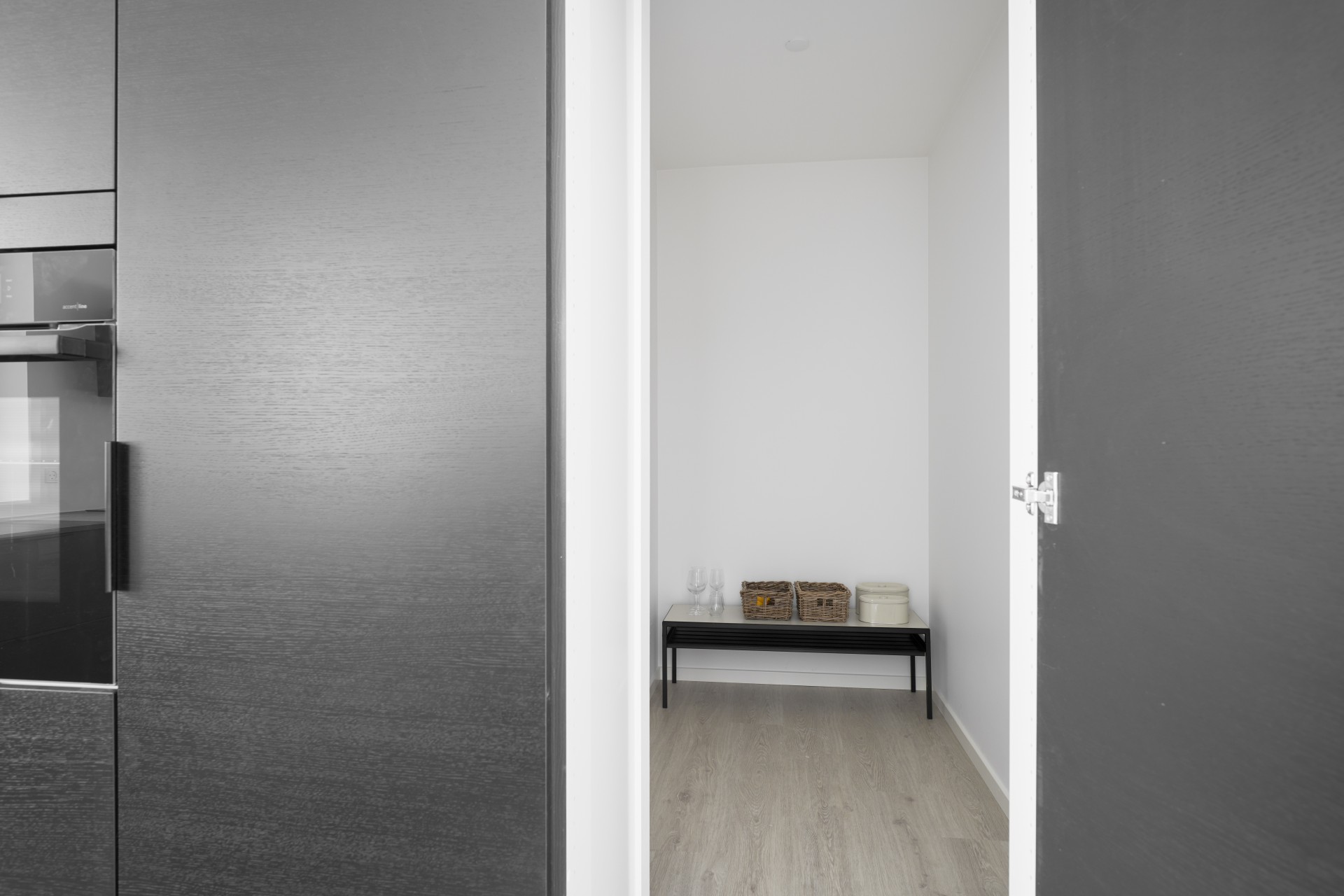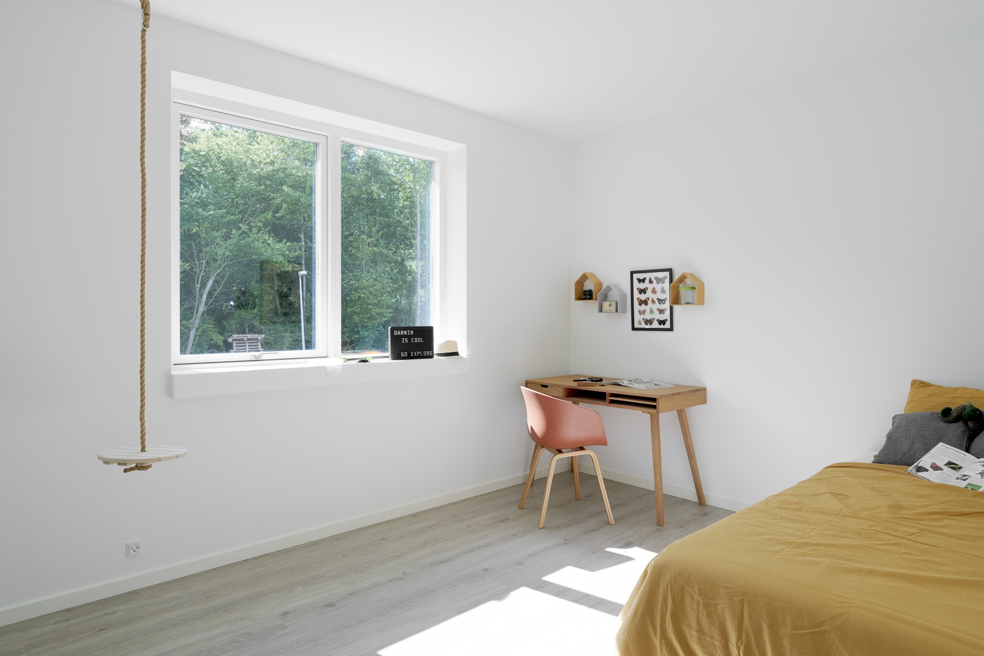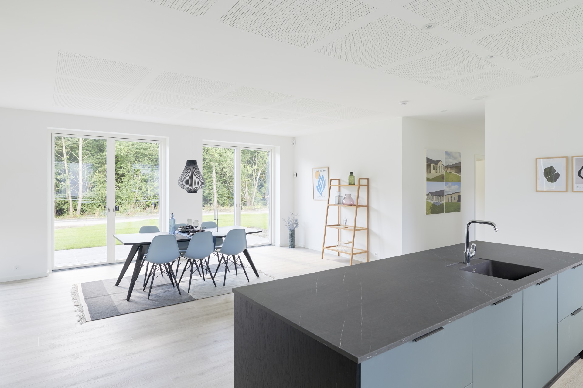 Indgangsparti i glas, skabsvæg med skydelåger i soveværelset samt køkken/alrum og stue i åben løsning.